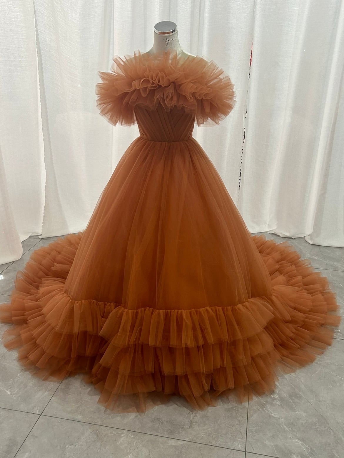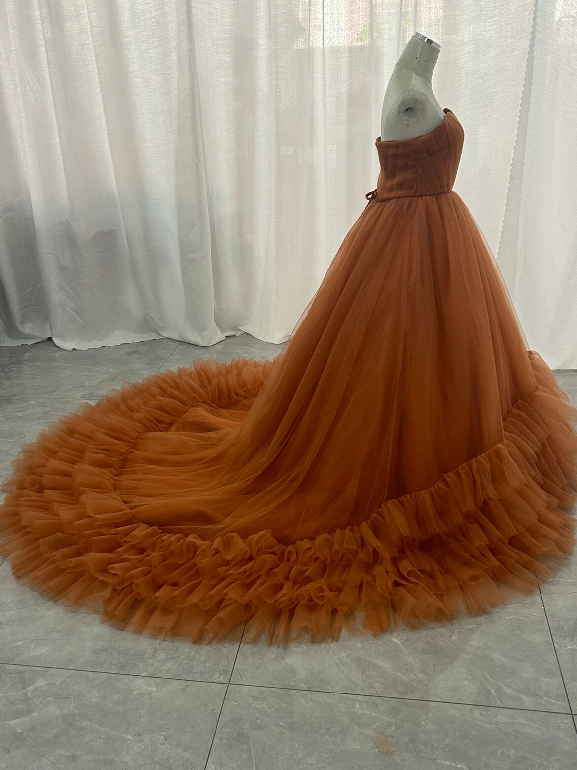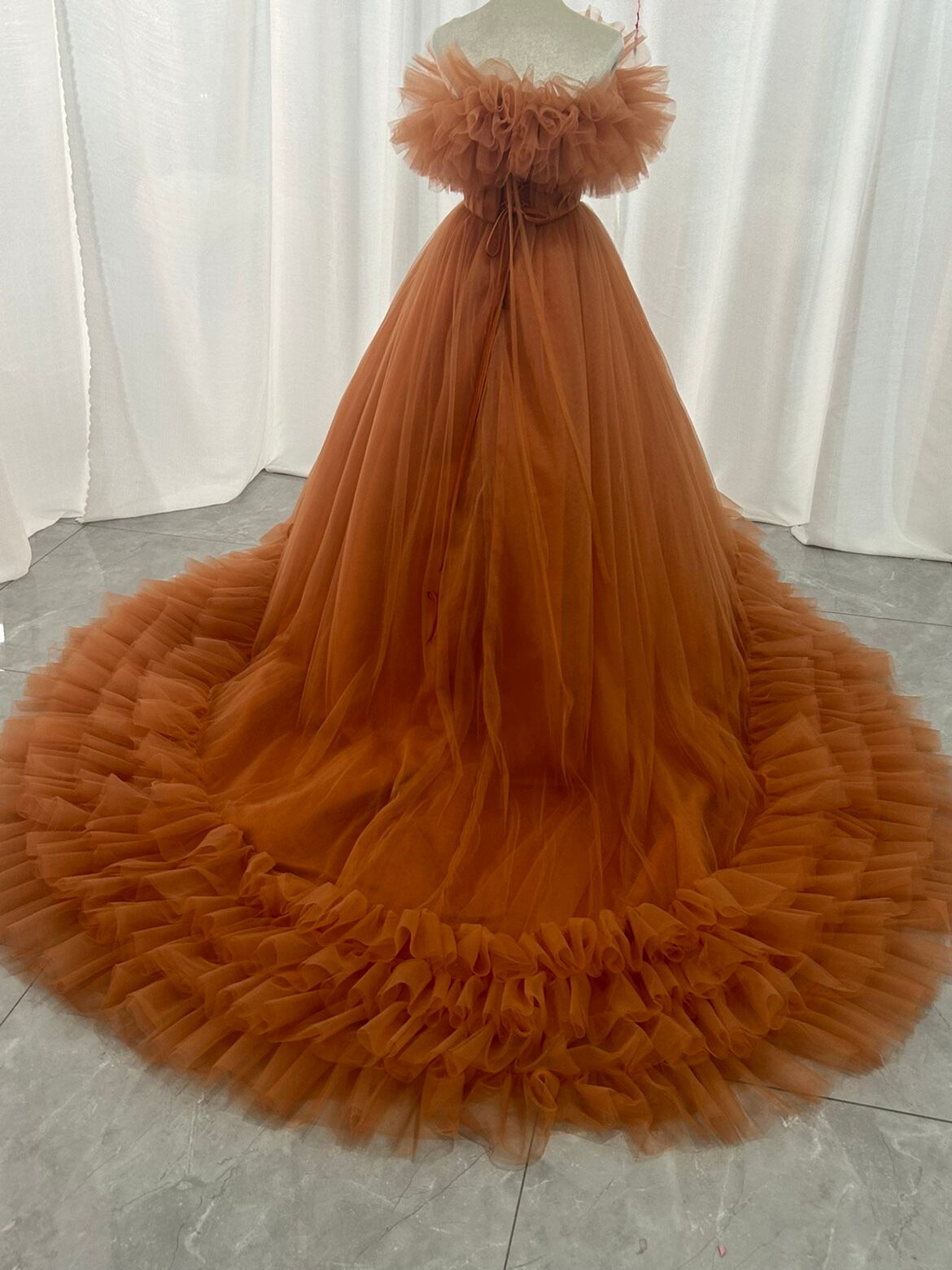 テラコッタ色 取り外しオフショルダー カラードレス パーティードレス華やかなトレーン 前撮り/花嫁/結婚式/披露宴/ 二