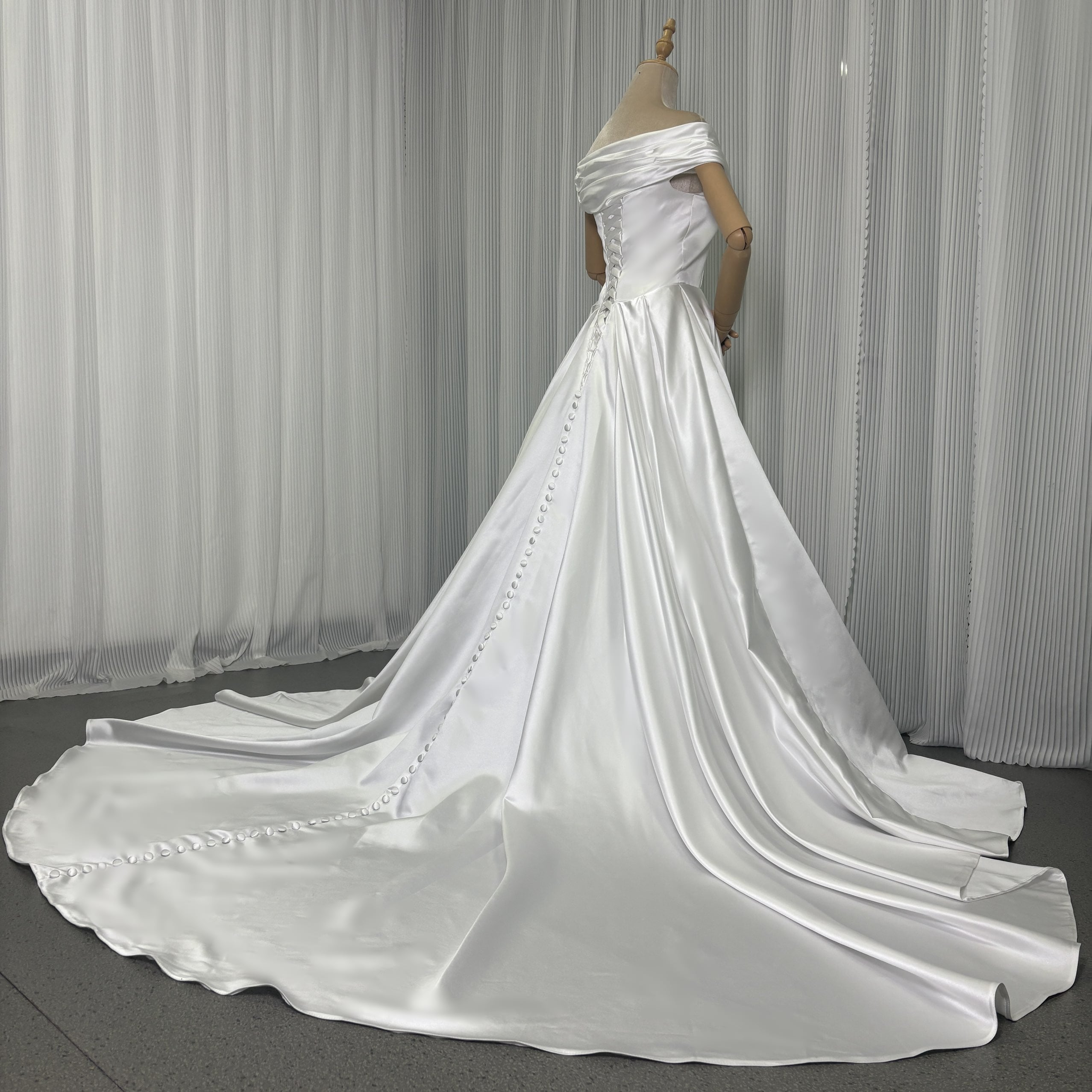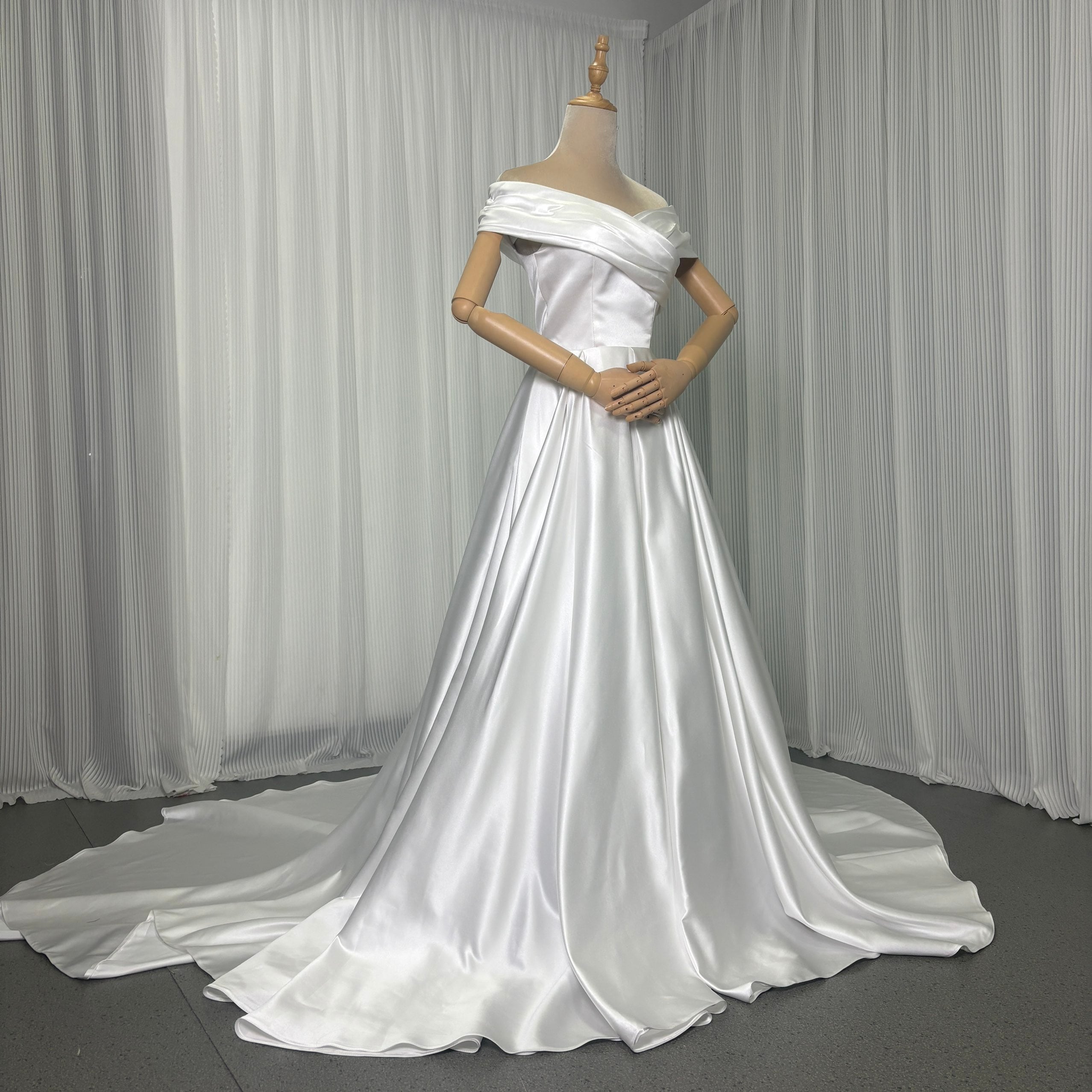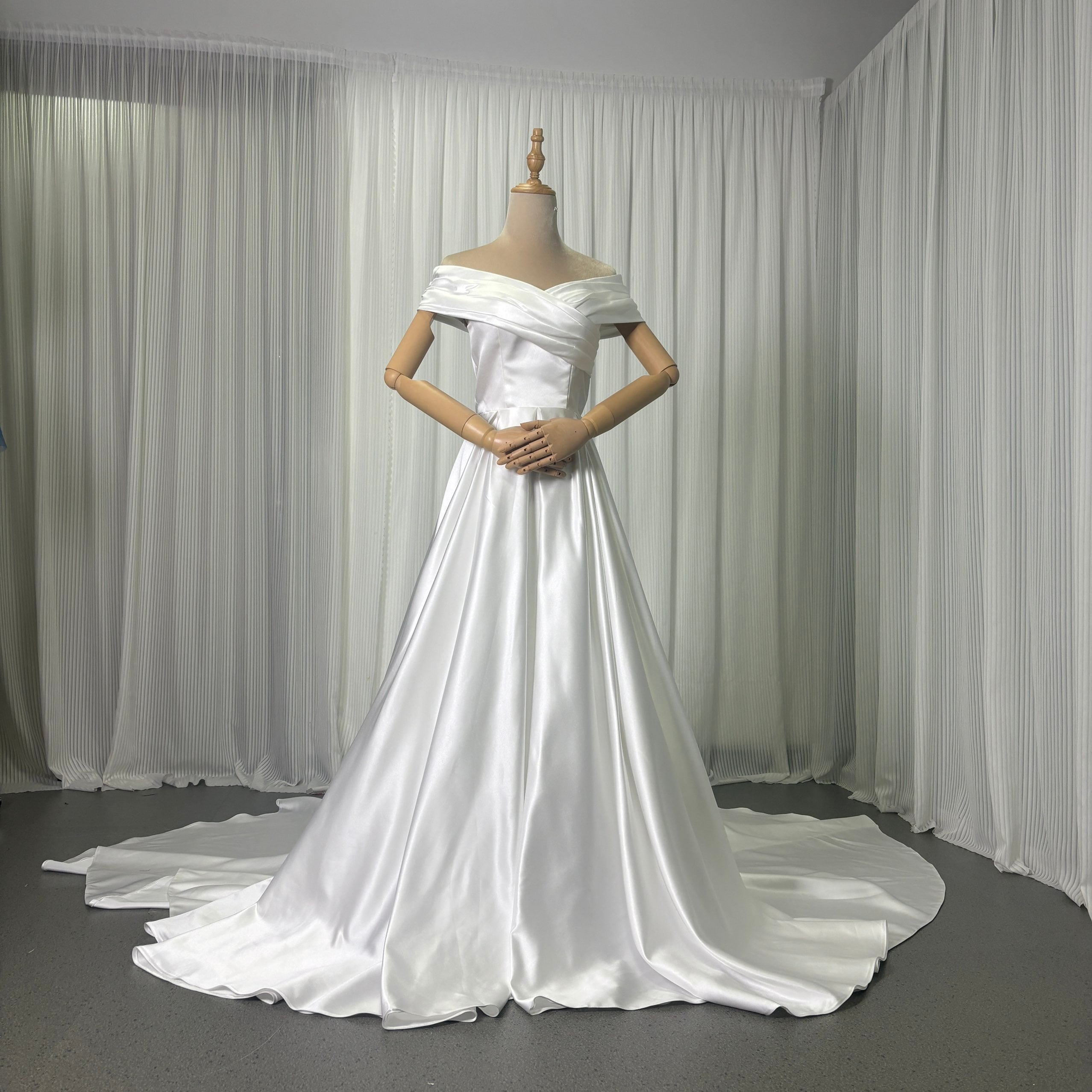 人気上昇! オフショルダー 光沢サテン ウエディングドレス 華やかなトレーン/結婚式/披露宴