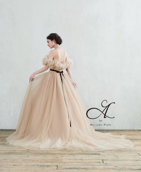人気上昇!シャンパン色 取り外しオフショルダー チュールドレス キラキラチュール カラードレス 前撮り/花嫁