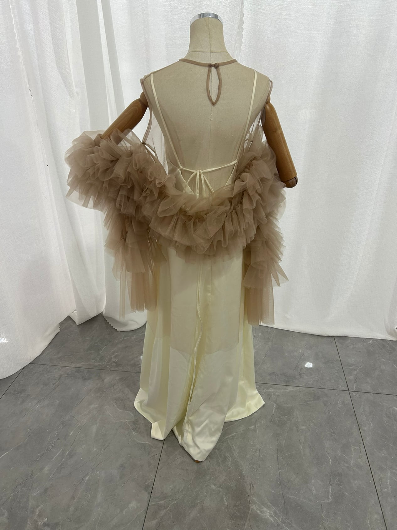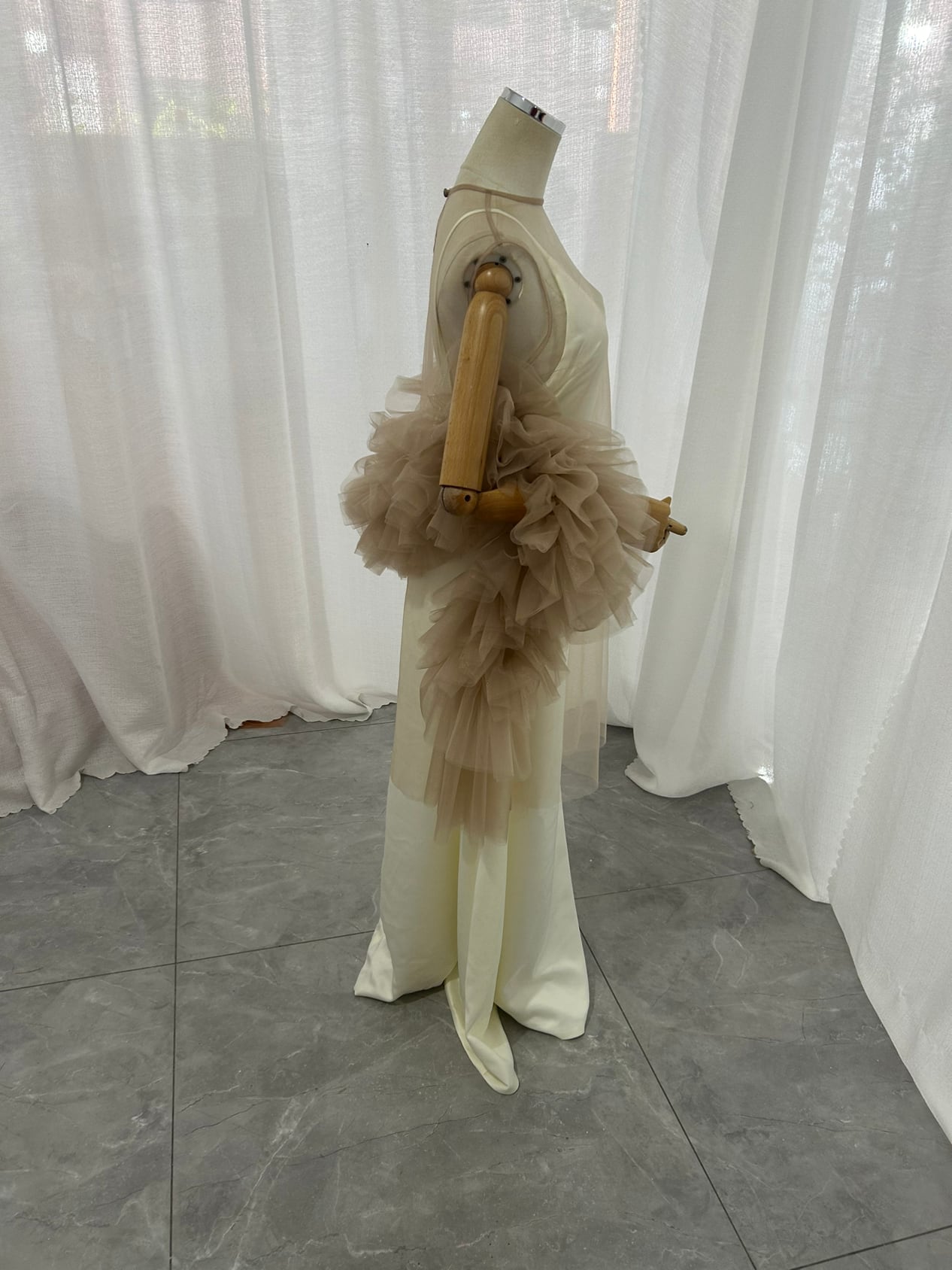 上品 オフホワイト キャミソール Vネック ウエディングドレス + えカーディガン(ボレロ) ソフトチュール ラッフルフリル2次会 花嫁 挙式