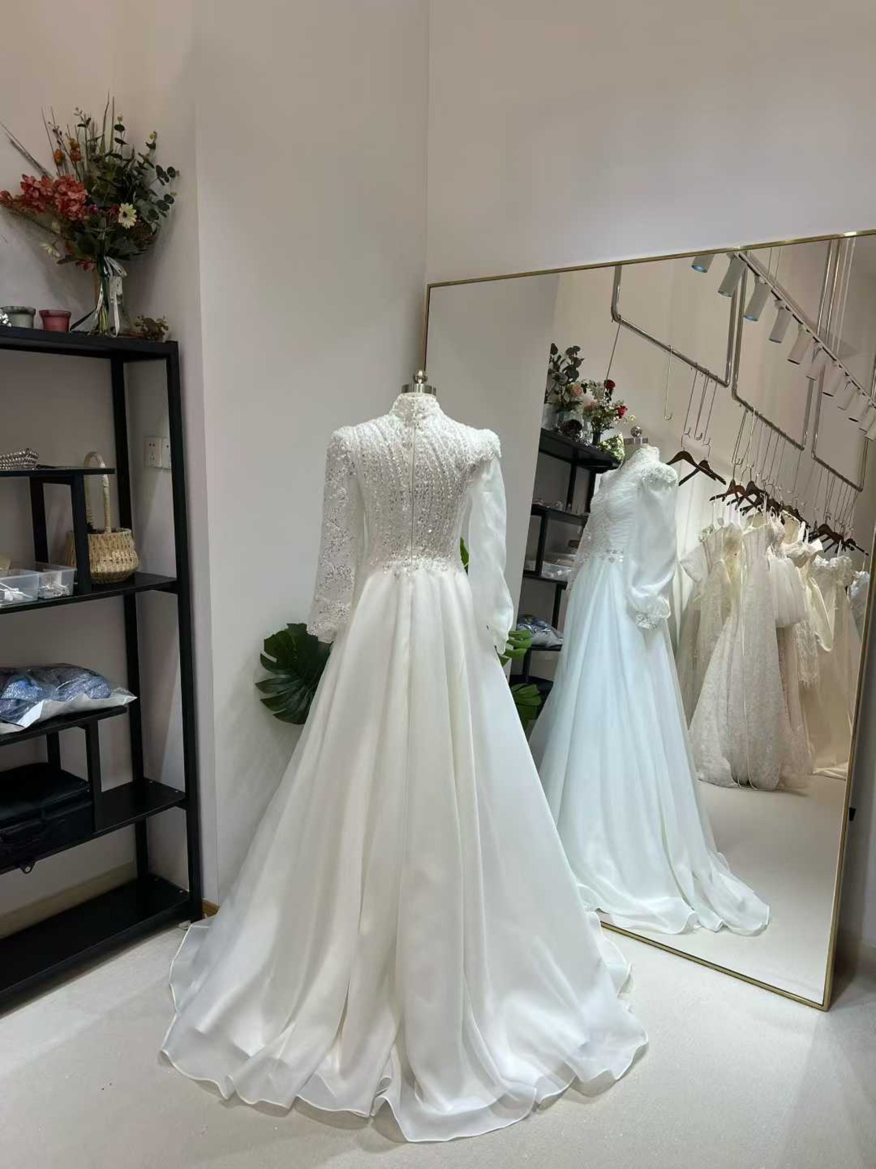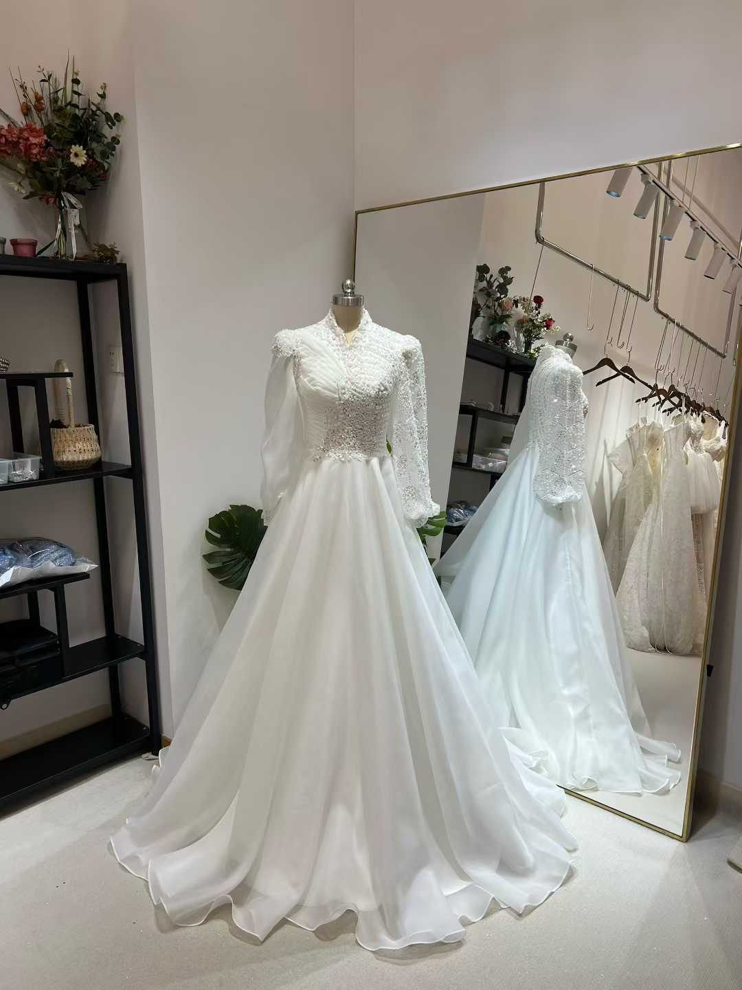 輝きな光彩を放つ 上品レース ウエディングドレス 長袖 華やかなトレーンフレアスカート/結婚式/披露宴
