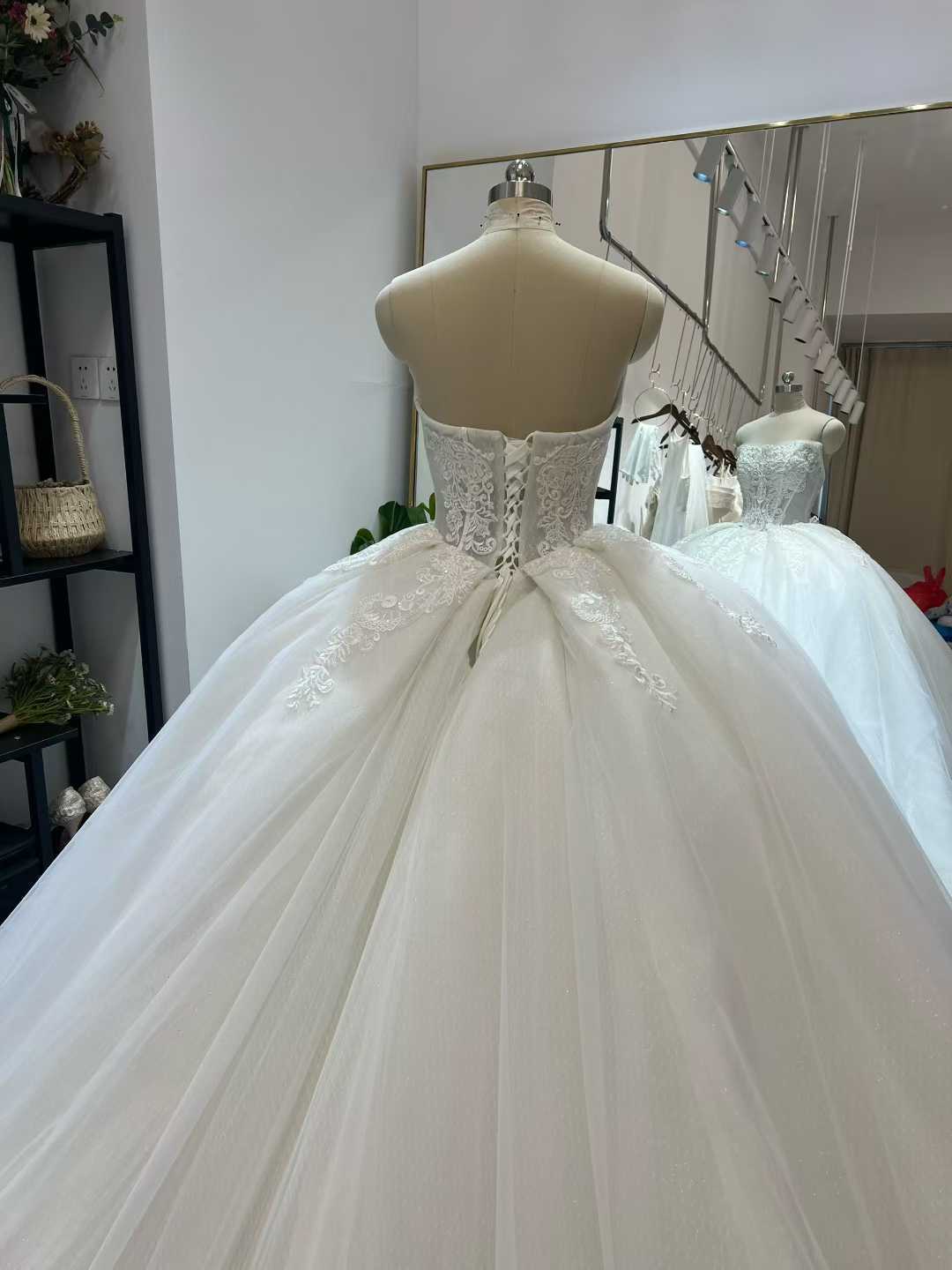 韓国風キラキラウエディングドレス ロングトレーンビジュードレスグリッターチュール フレアスカート結婚式 前撮り 披露宴