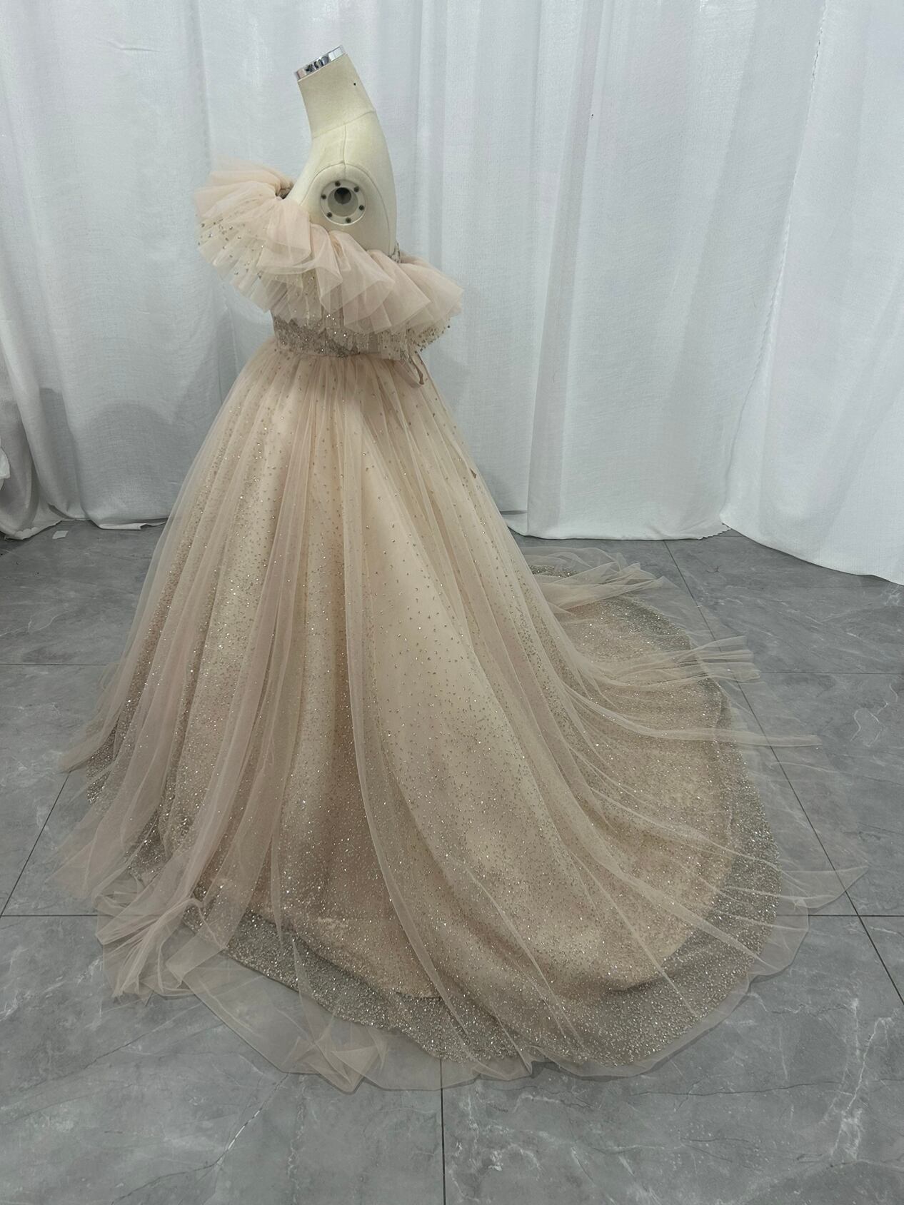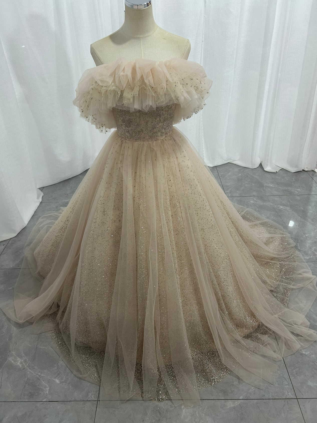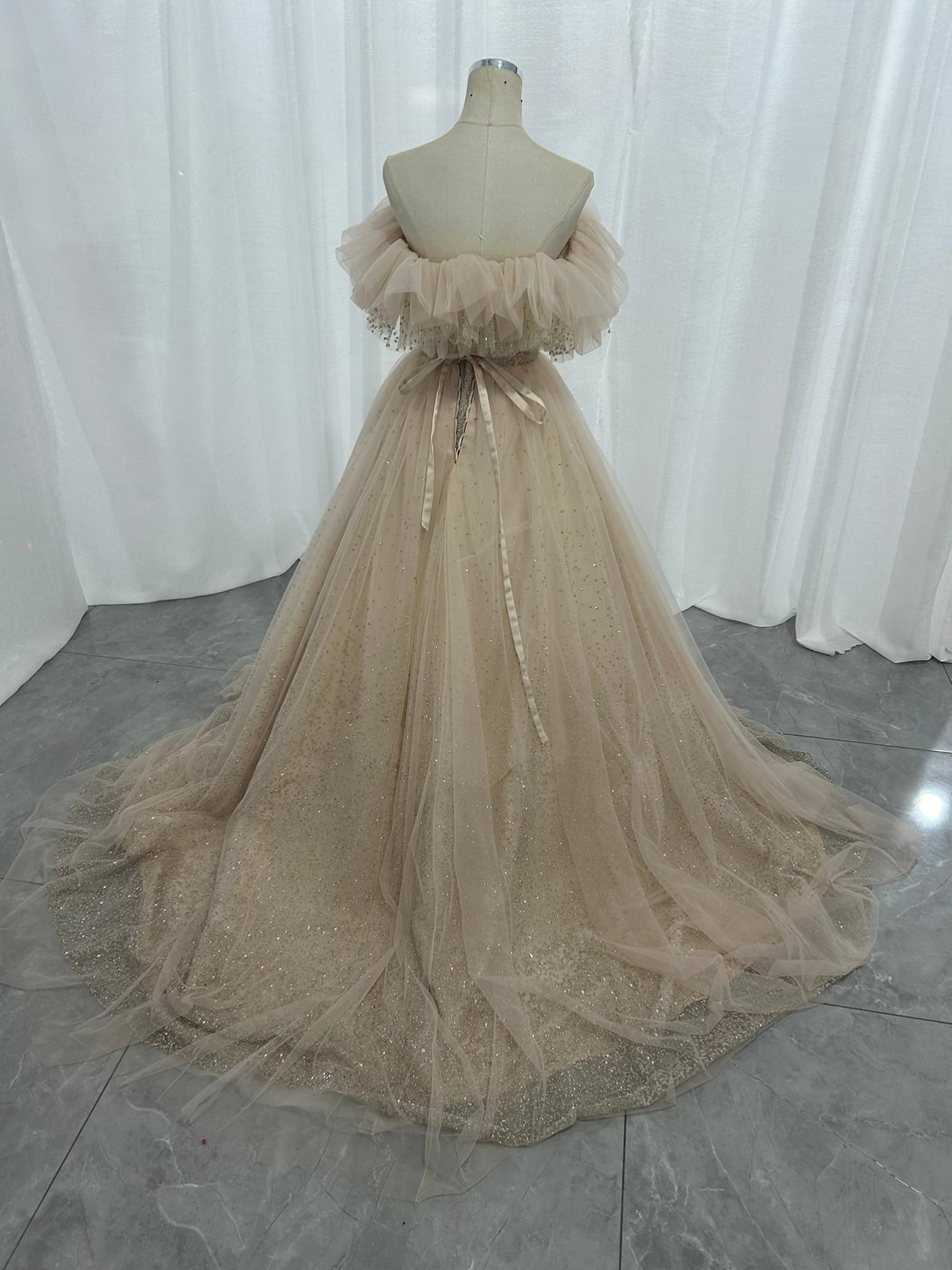 輝きな光彩を放つ シャンパン色 オフショルダー カラードレス ソフトチュール プリンセスライン 結婚式/披露宴