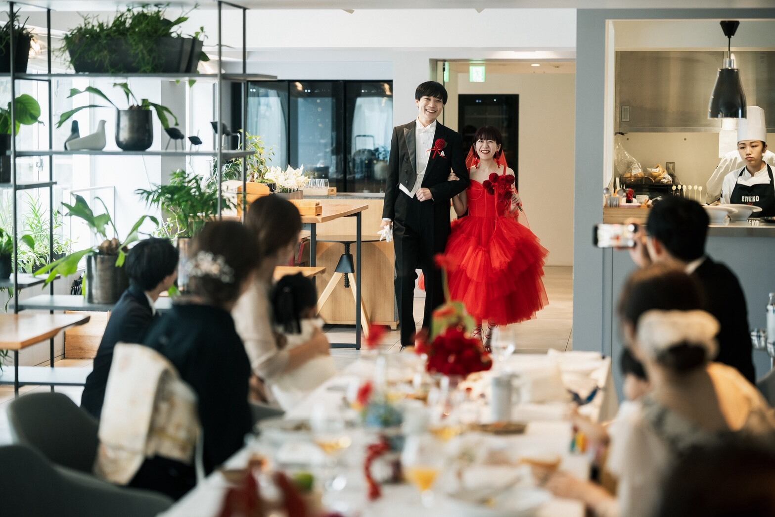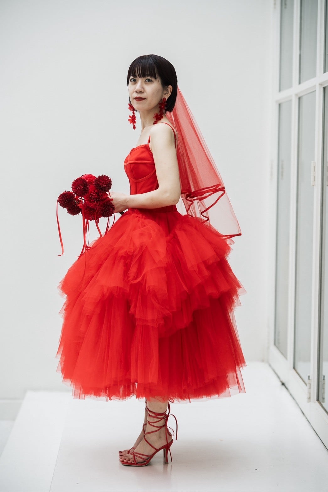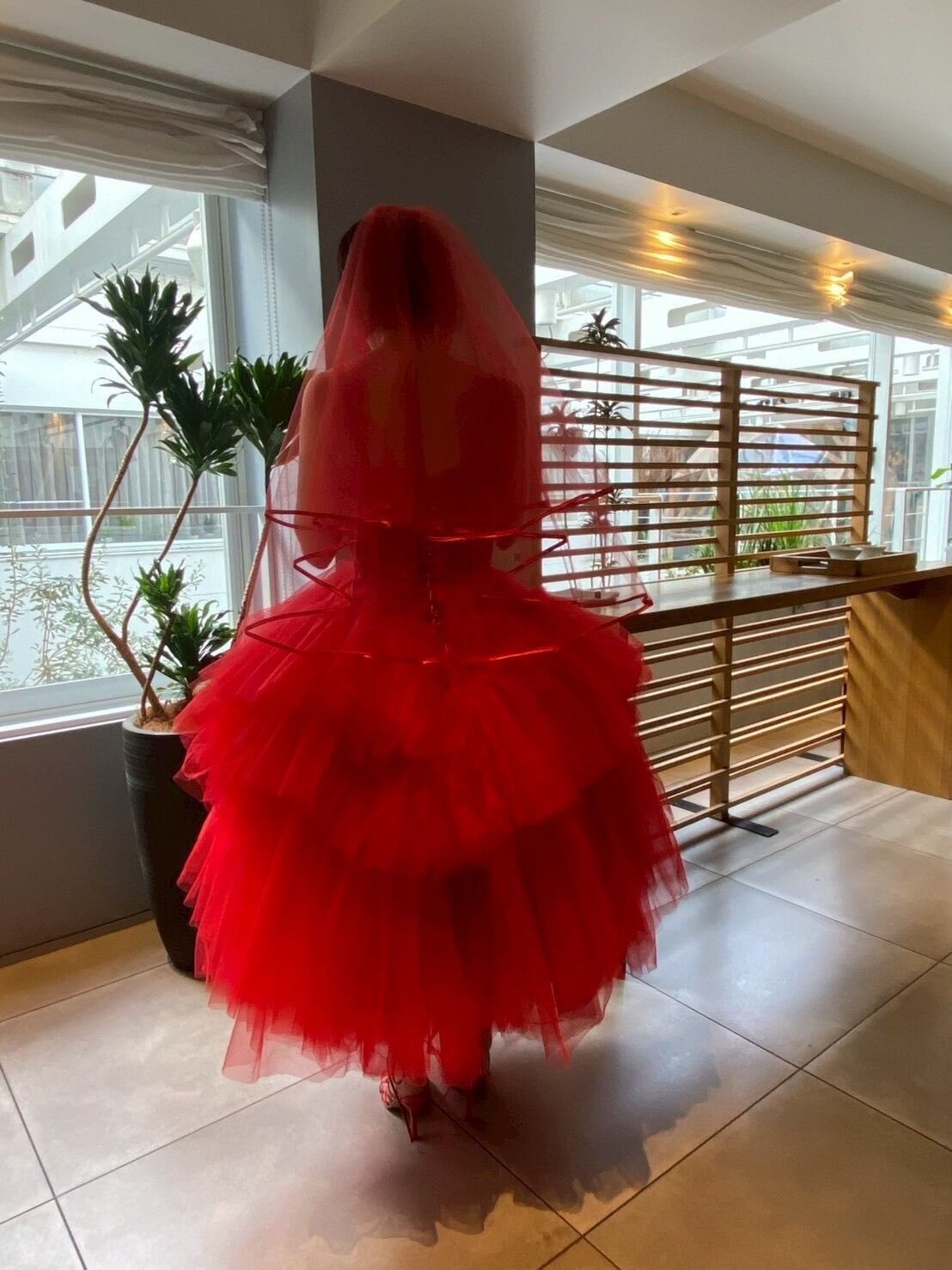 実例写真 !赤 カラードレス オフショルダー キャミソール スレンダーライン パーティードレス お色直し