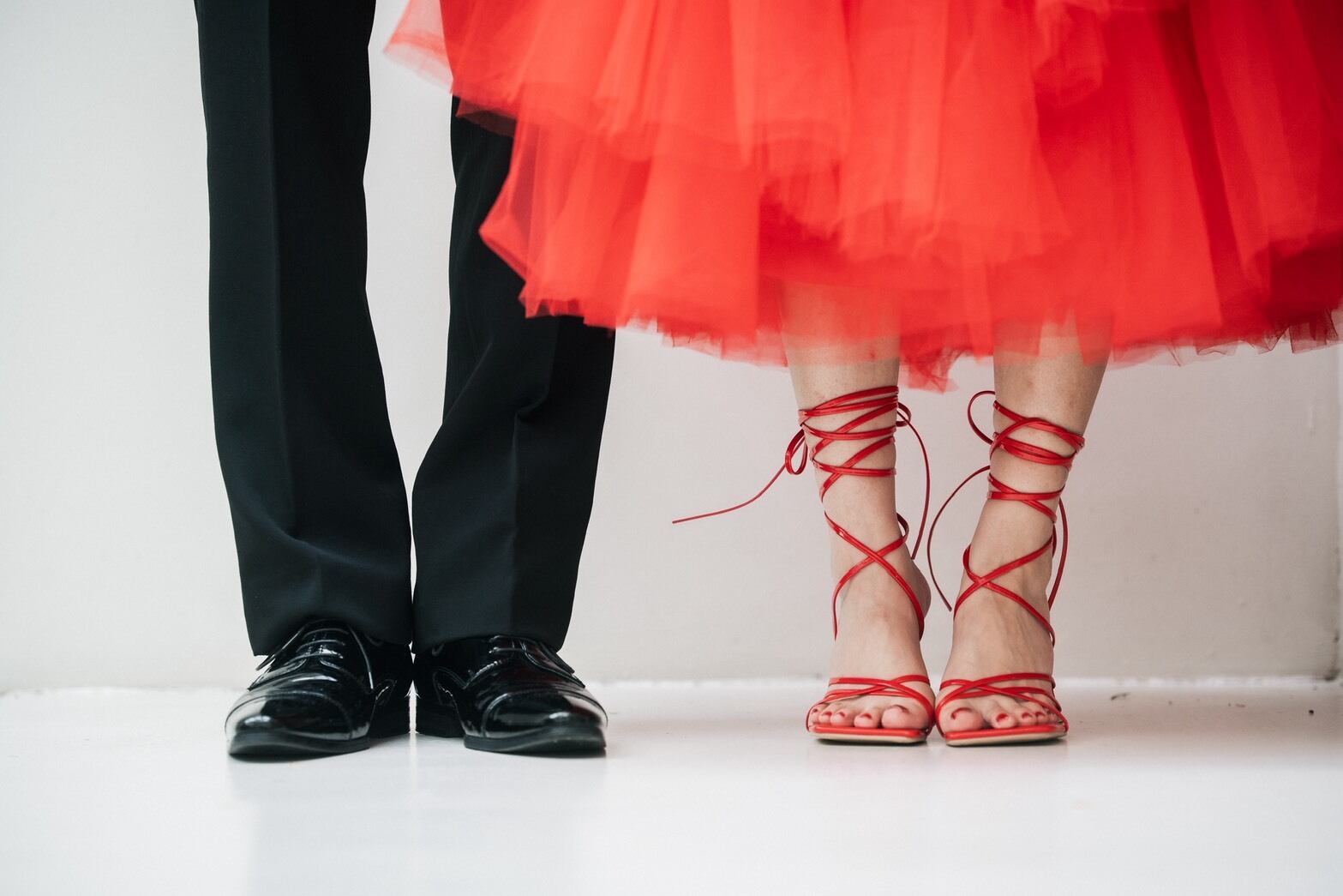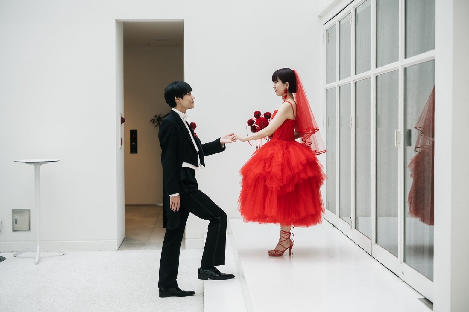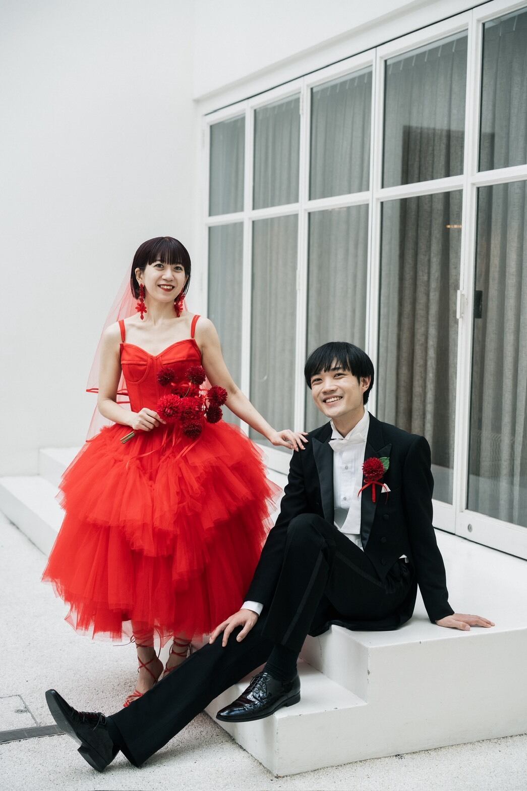 実例写真 !赤 カラードレス オフショルダー キャミソール スレンダーライン パーティードレス お色直し