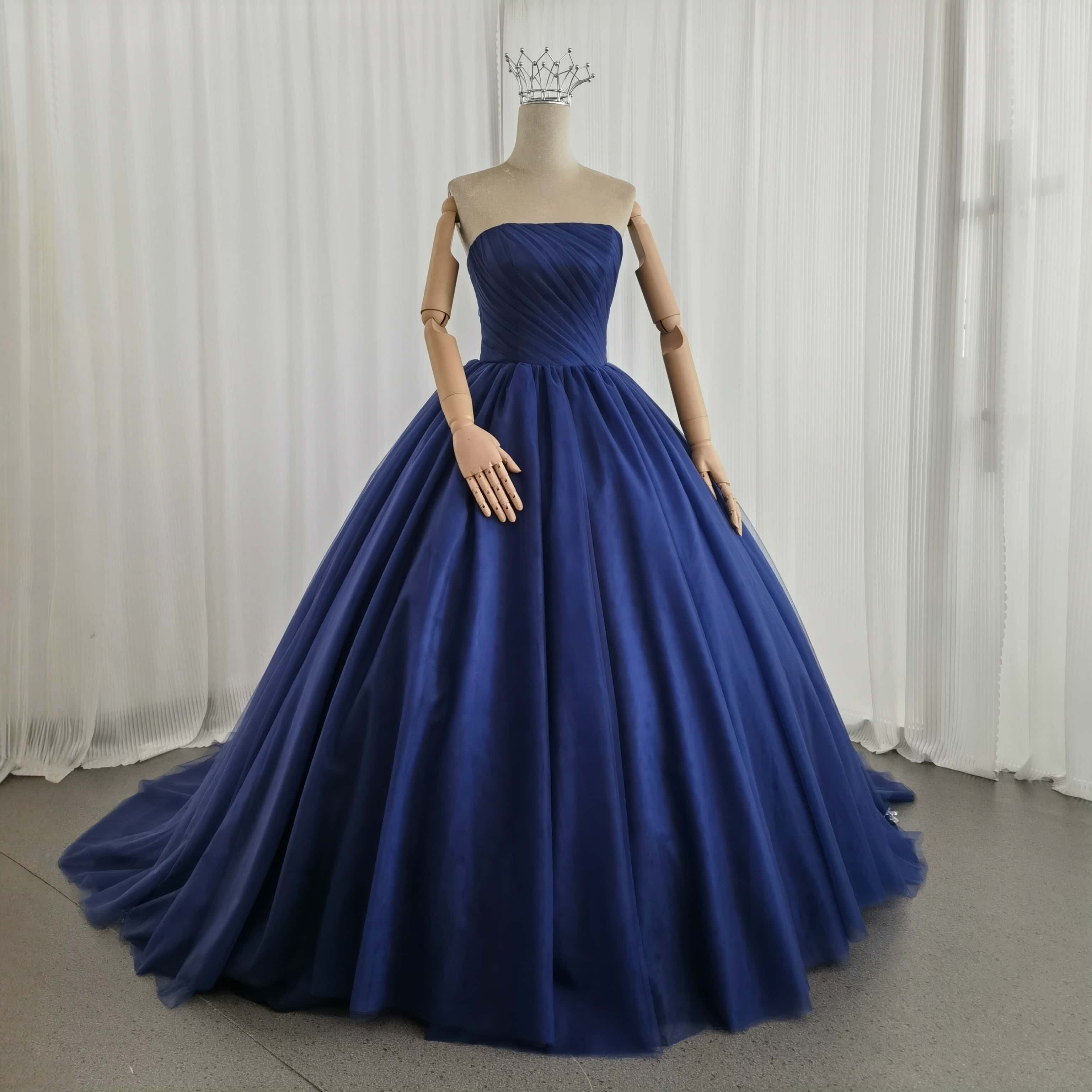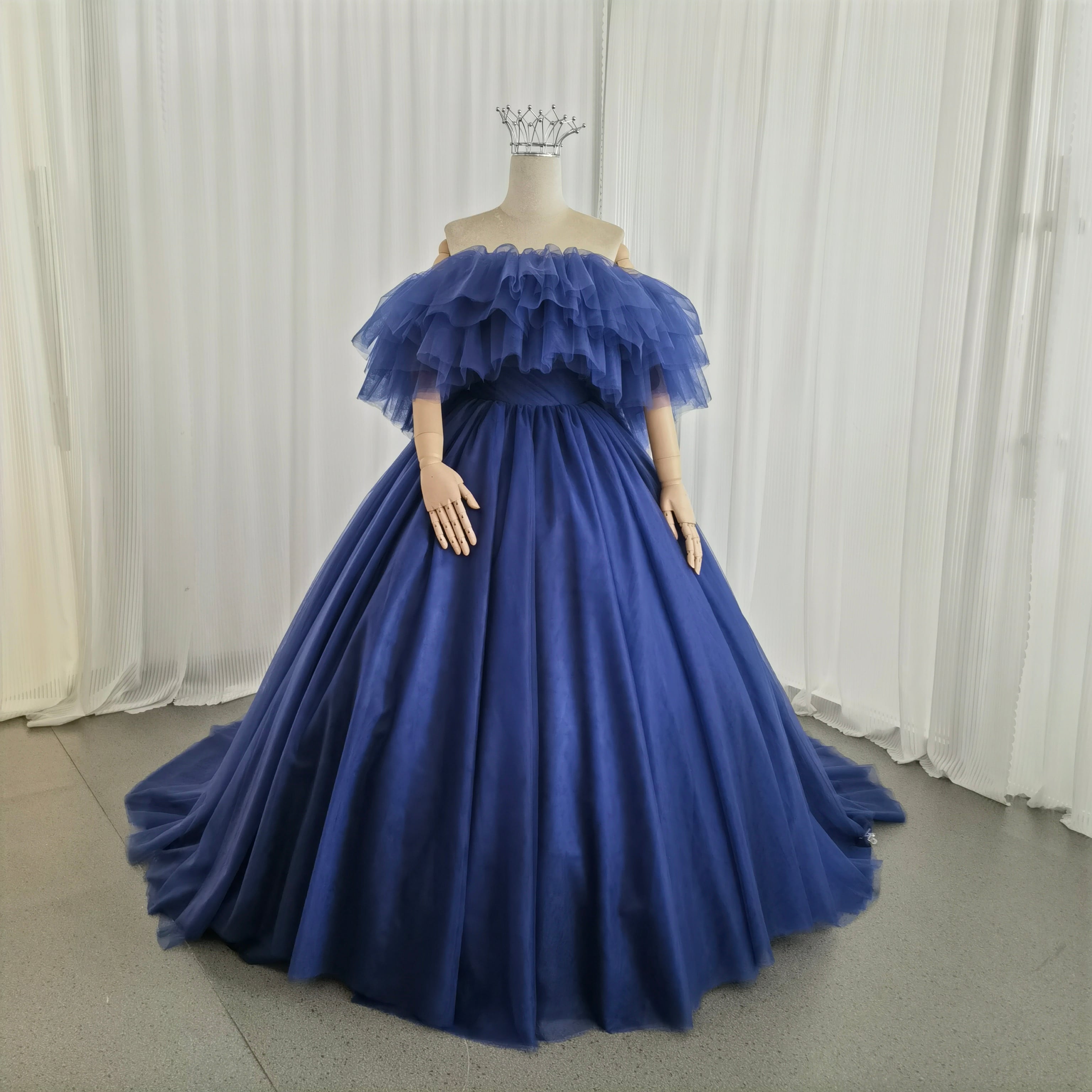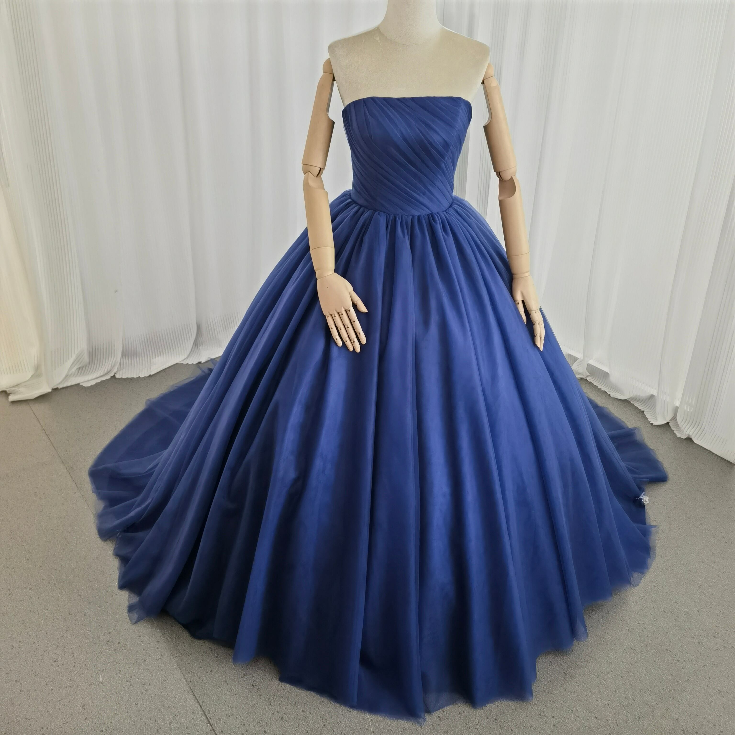輝きな光彩を放つ 紺 カラードレス 取り外しオフショルダー ソフトチュール プリンセスライン 結婚式/披露宴