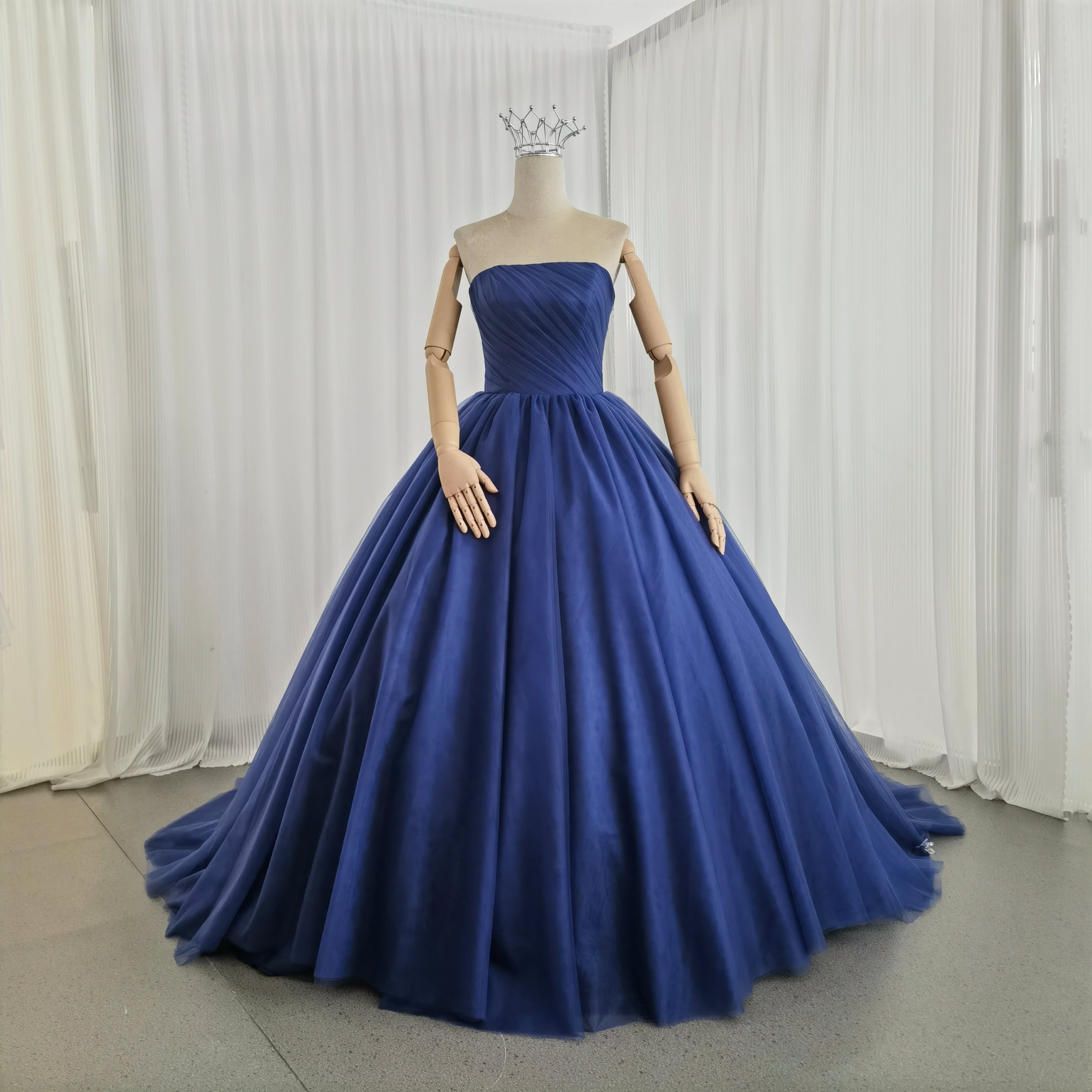 輝きな光彩を放つ 紺 カラードレス ベアトップ ソフトチュール プリンセスライン 結婚式/披露宴