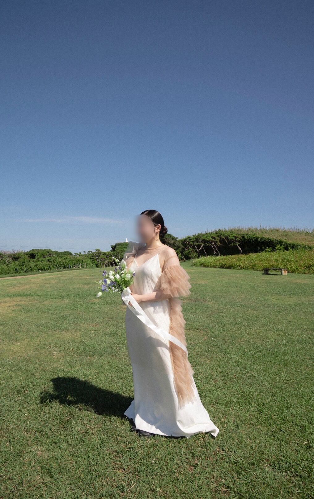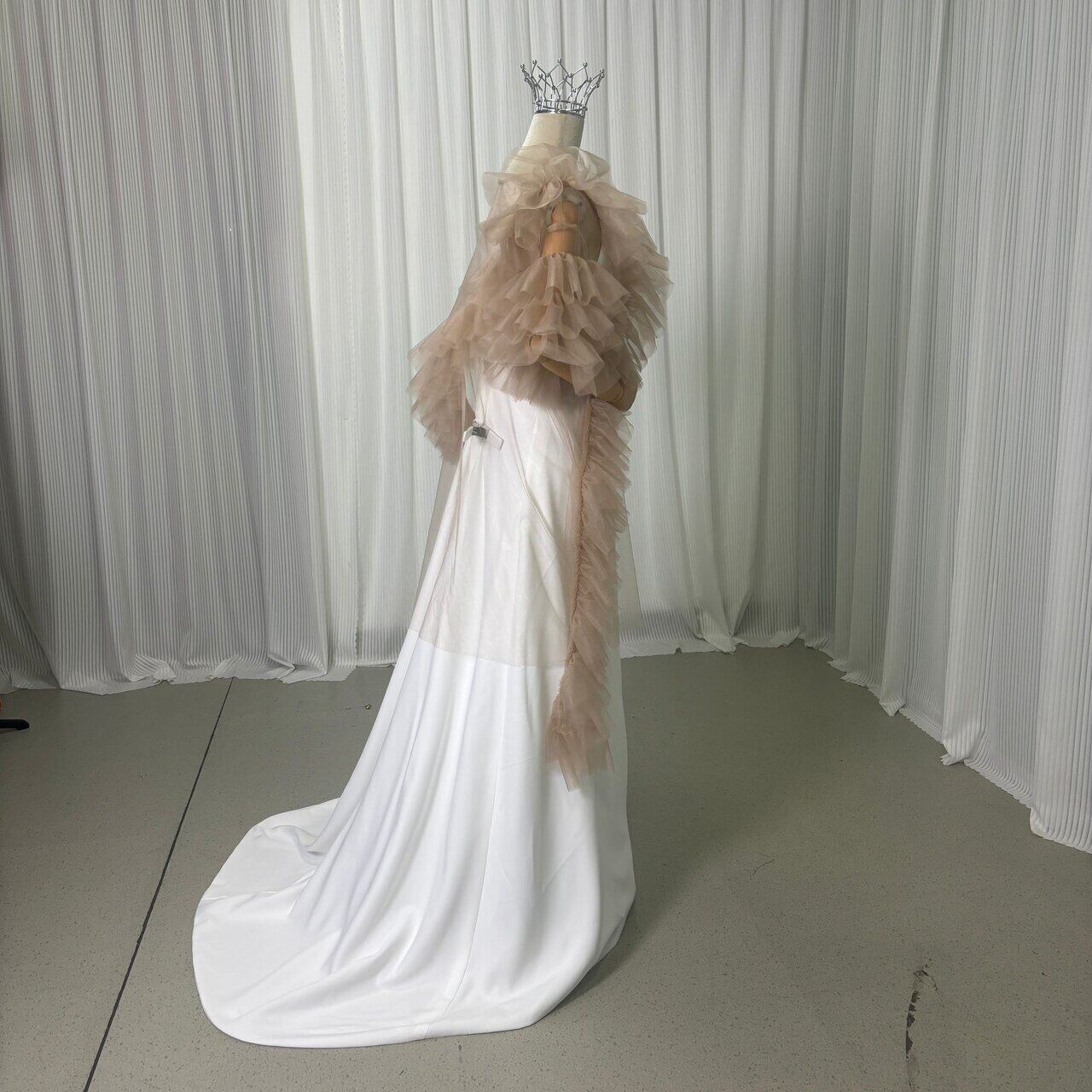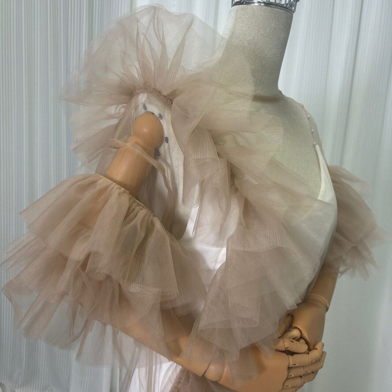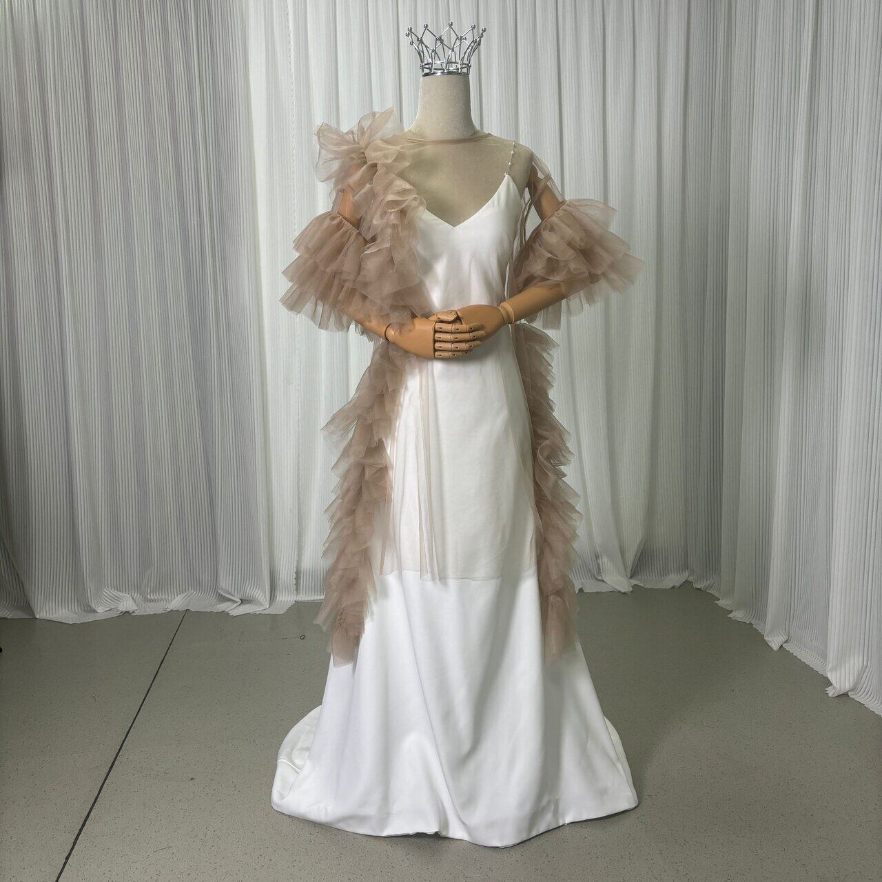 実例写真 !上品 オフホワイト キャミソール Vネック ウエディングドレス + えカーディガン(ボレロ) ソフトチュール ラッフルフリル2次会 花嫁 挙式 | David1021k Dress(ダヴィドレス)