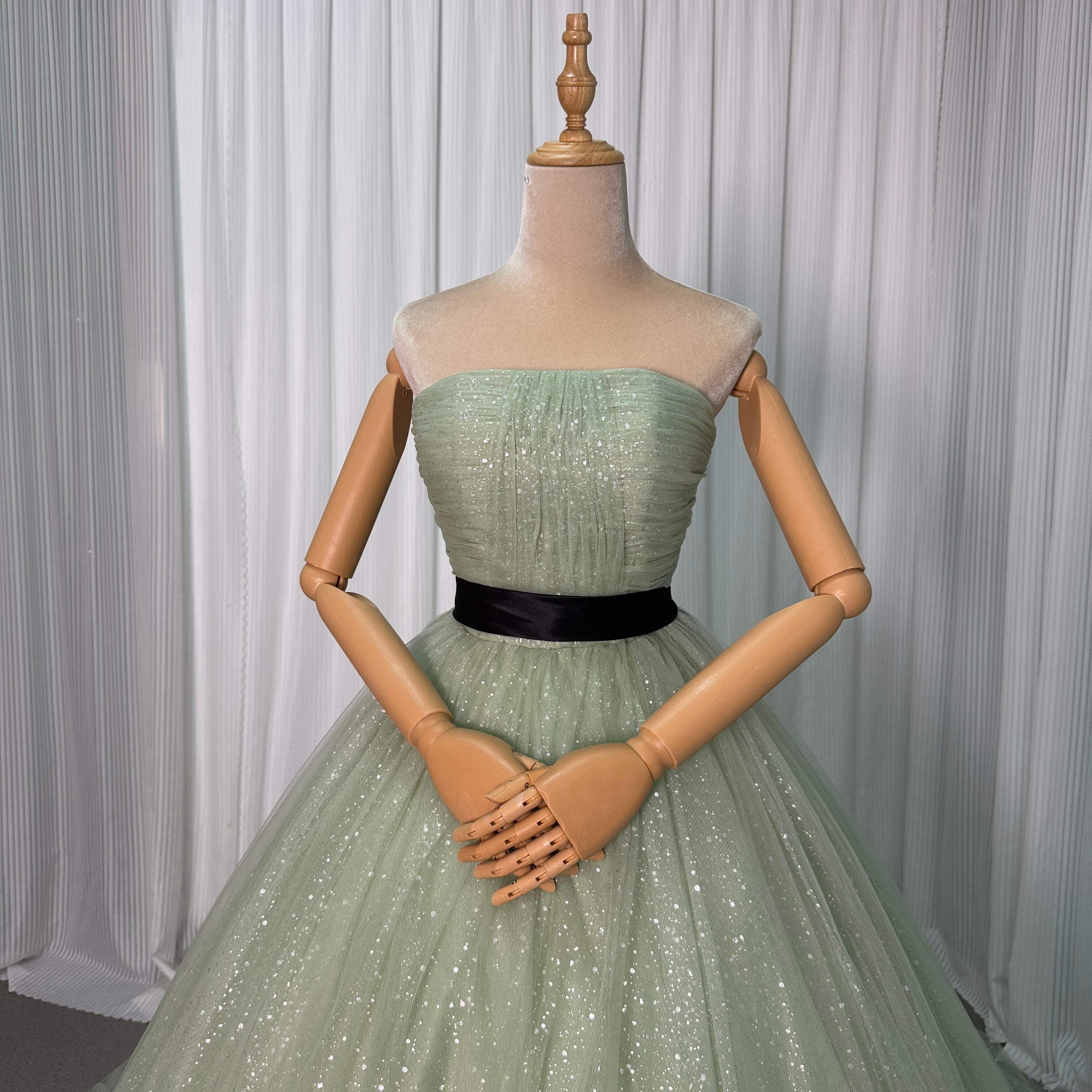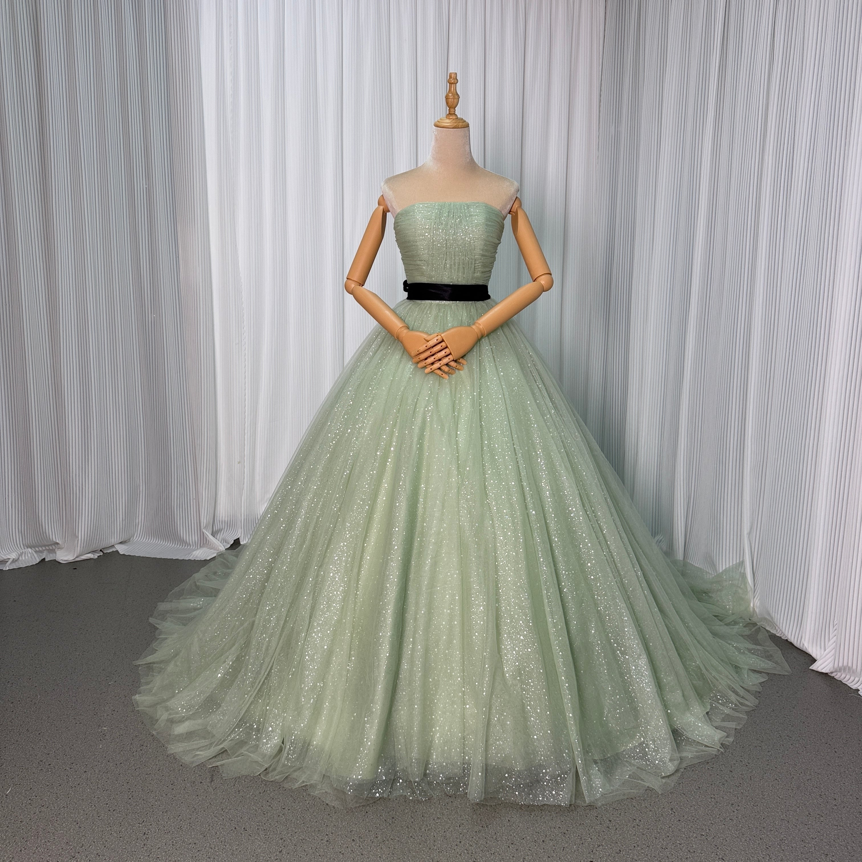 輝きな光彩を放つ グリーン キラキラチュール カラードレス 華やかなトレーン プリンセスライン 結婚式/披露宴
