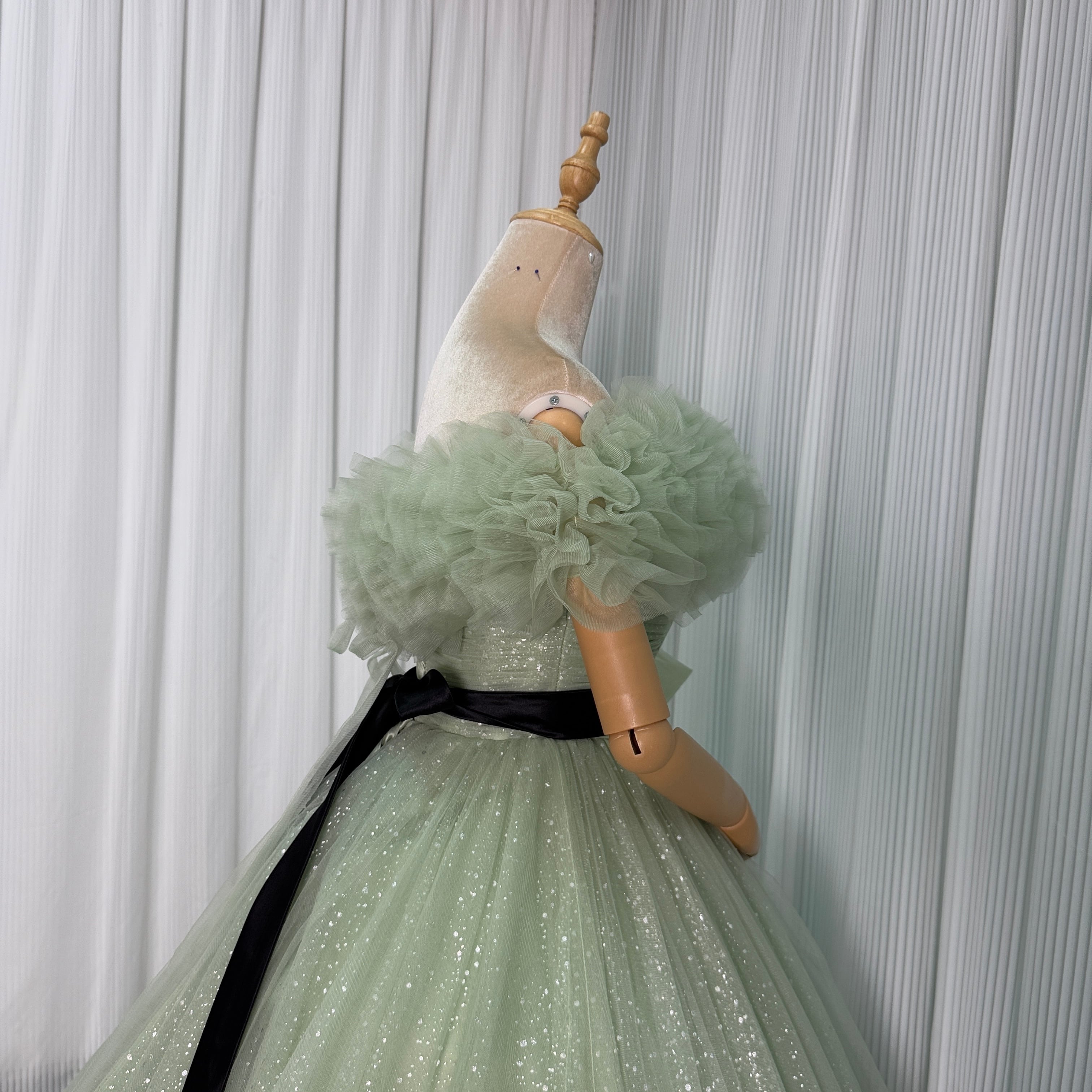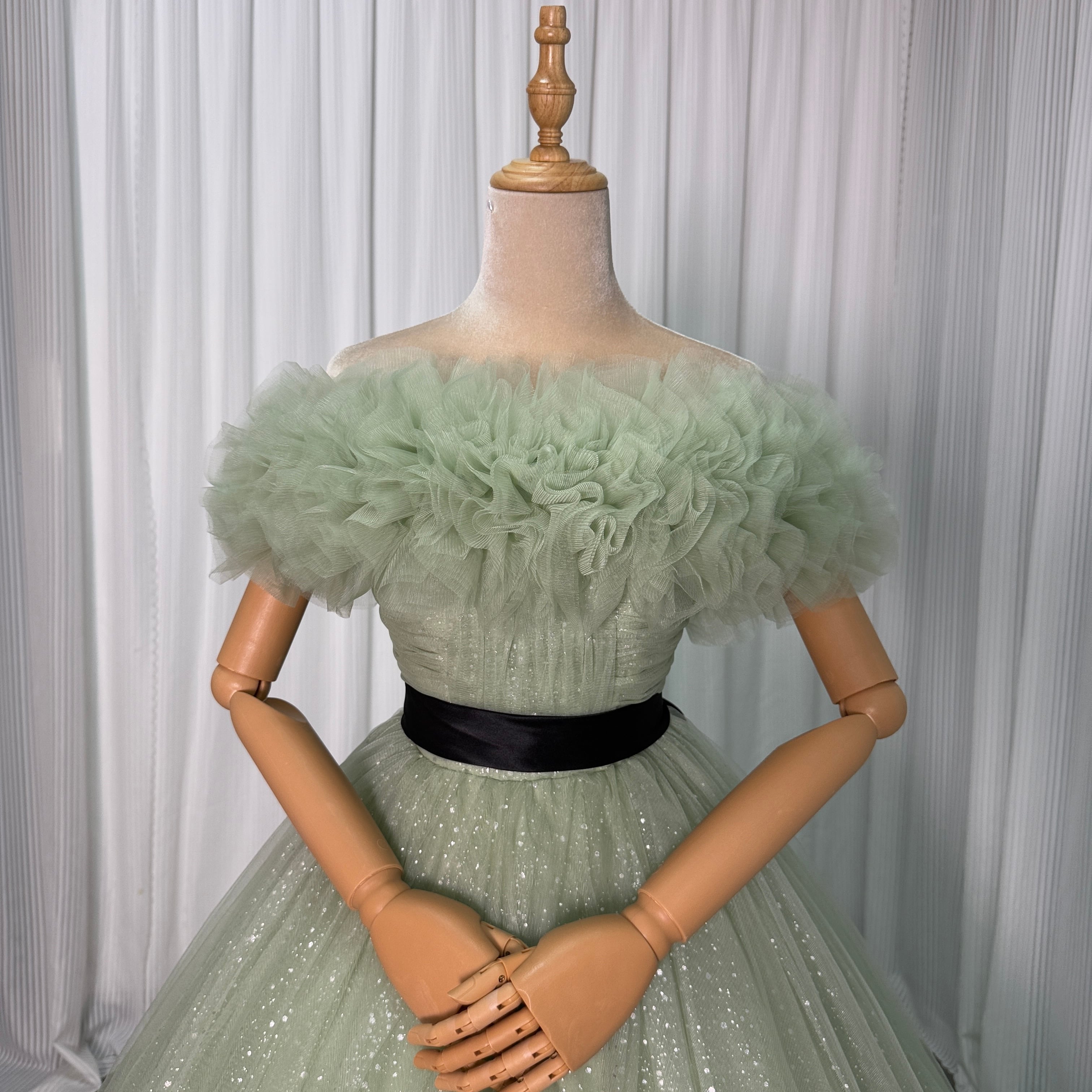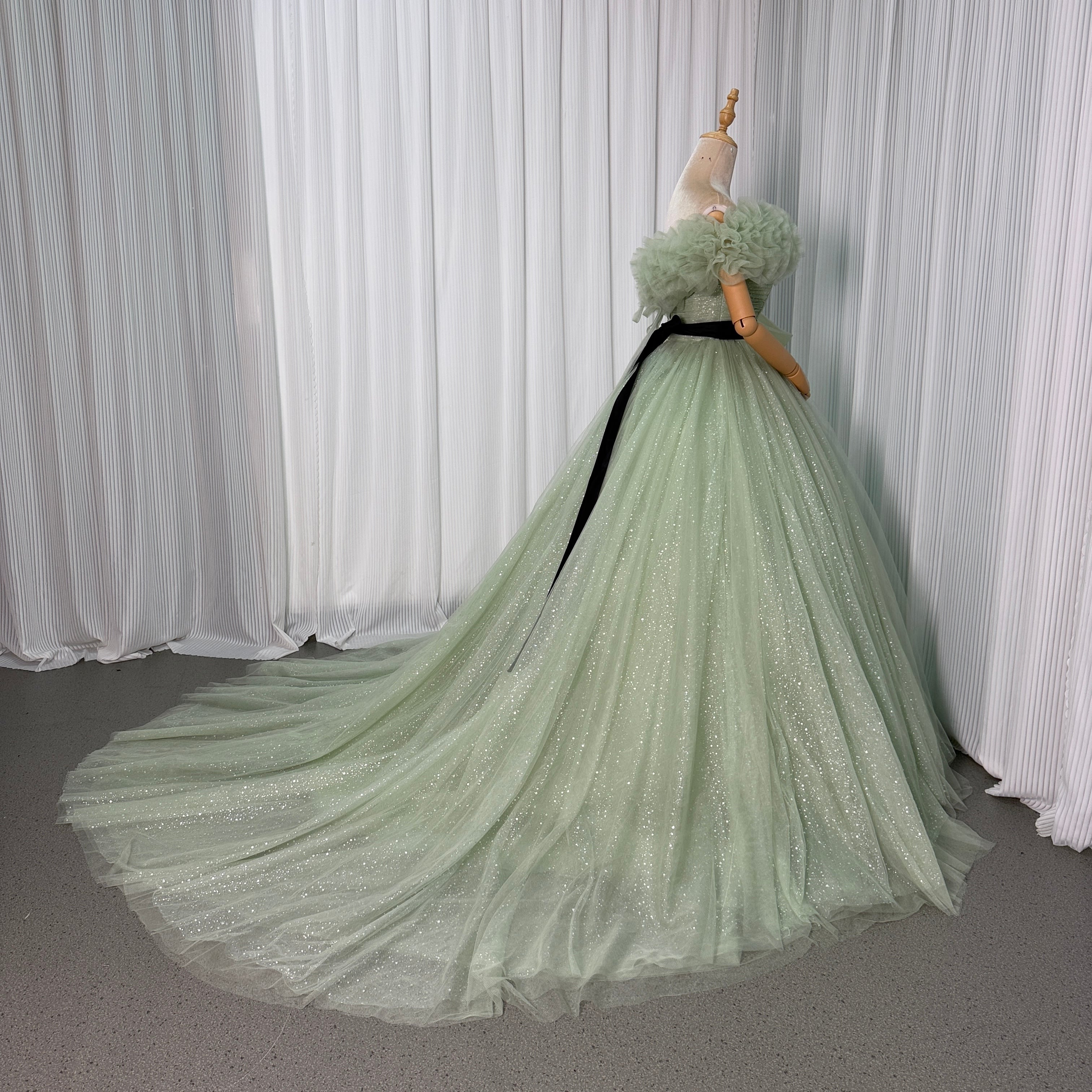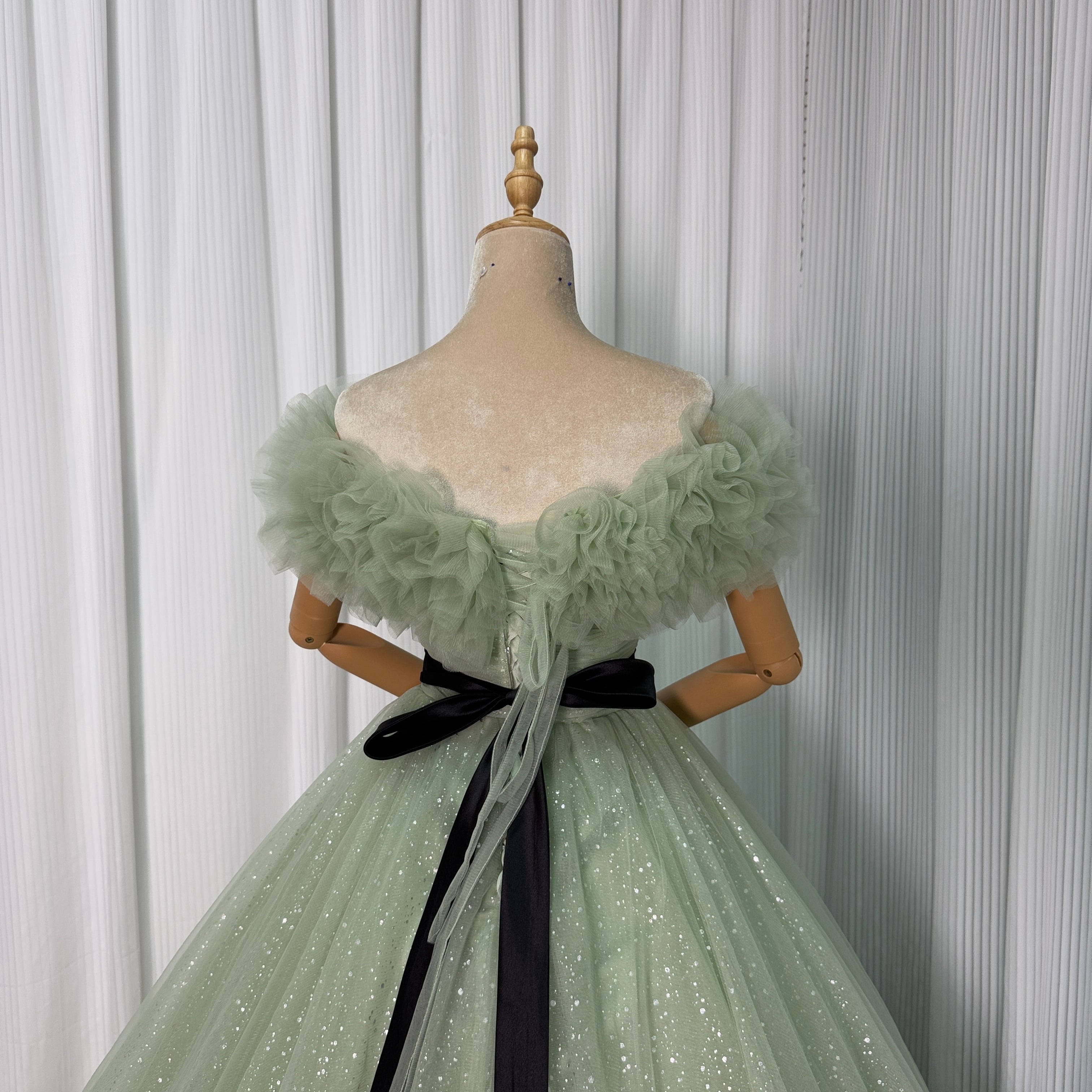 輝きな光彩を放つ グリーン 取り外しオフショルダー キラキラチュール カラードレス 華やかなトレーン プリンセスライン 結婚式/披露宴