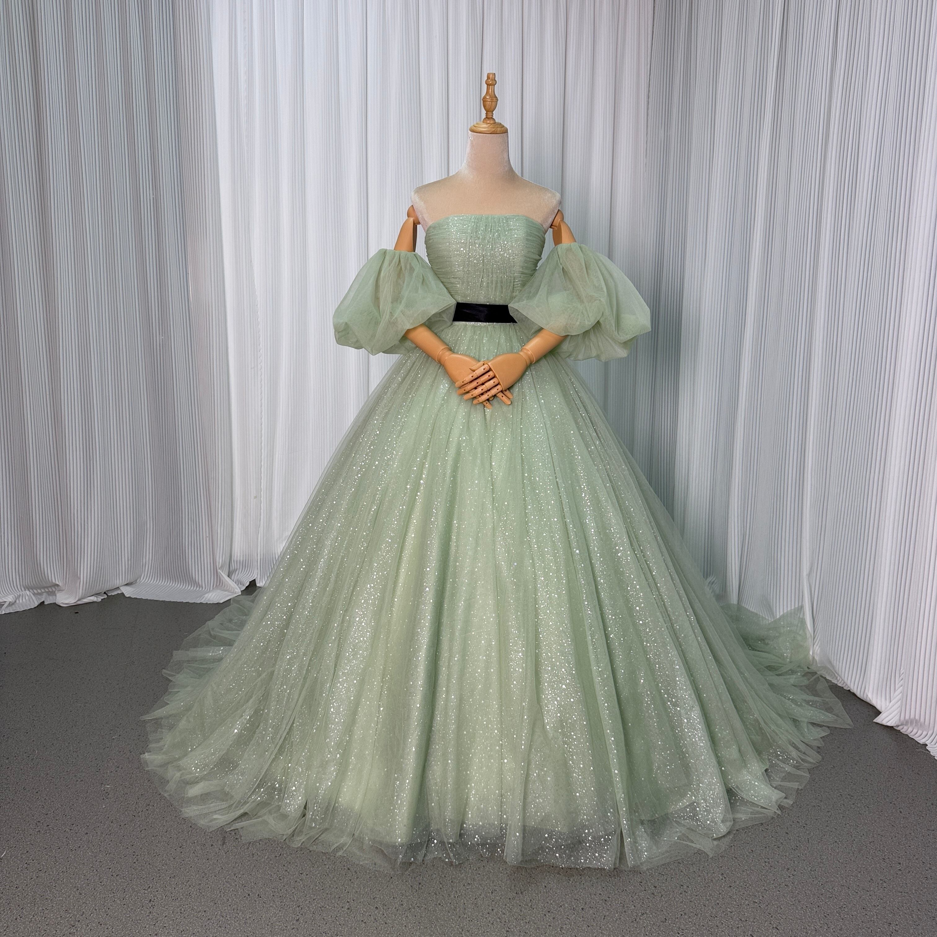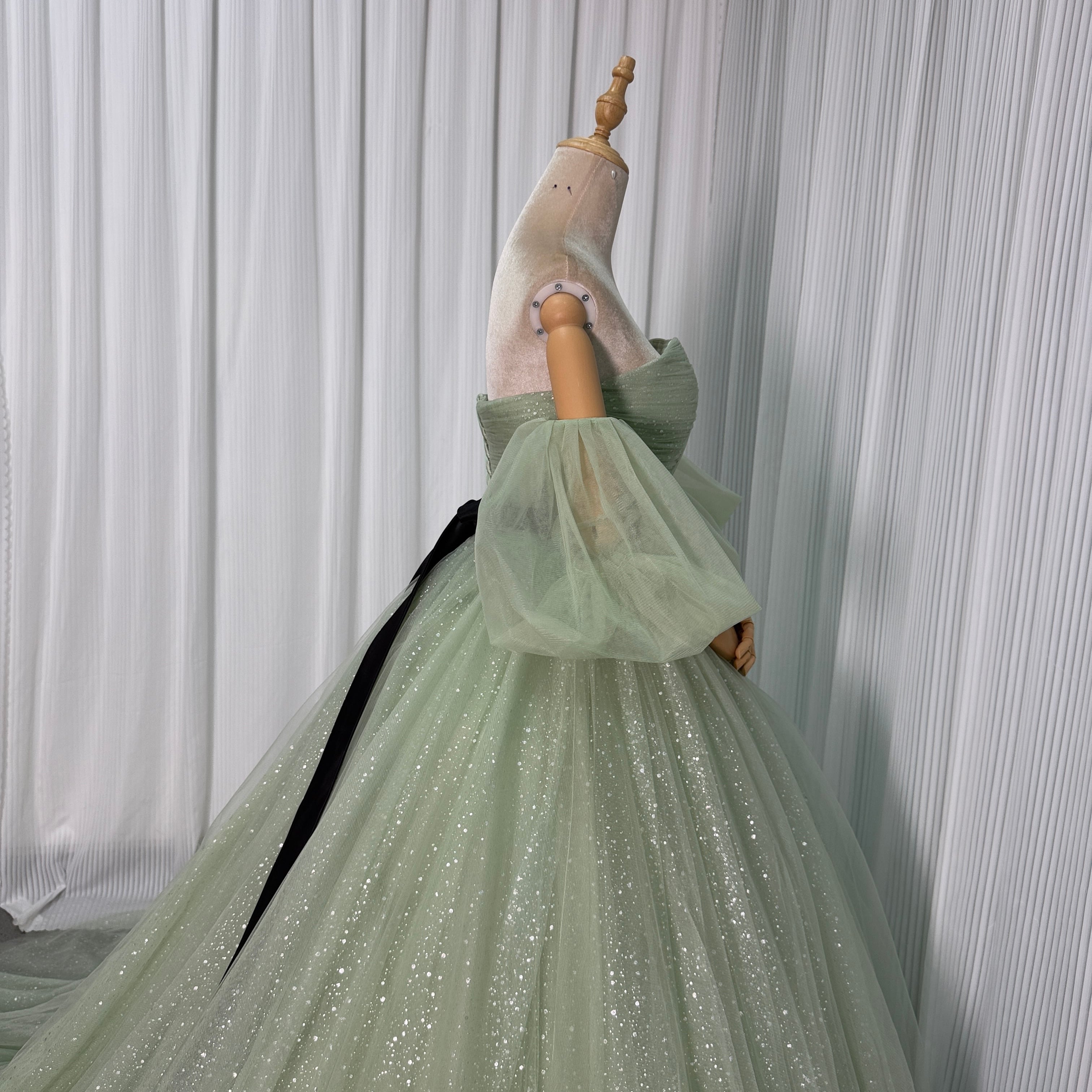 輝きな光彩を放つ グリーン パフスリーブ キラキラチュール カラードレス 華やかなトレーン プリンセスライン 結婚式/披露宴