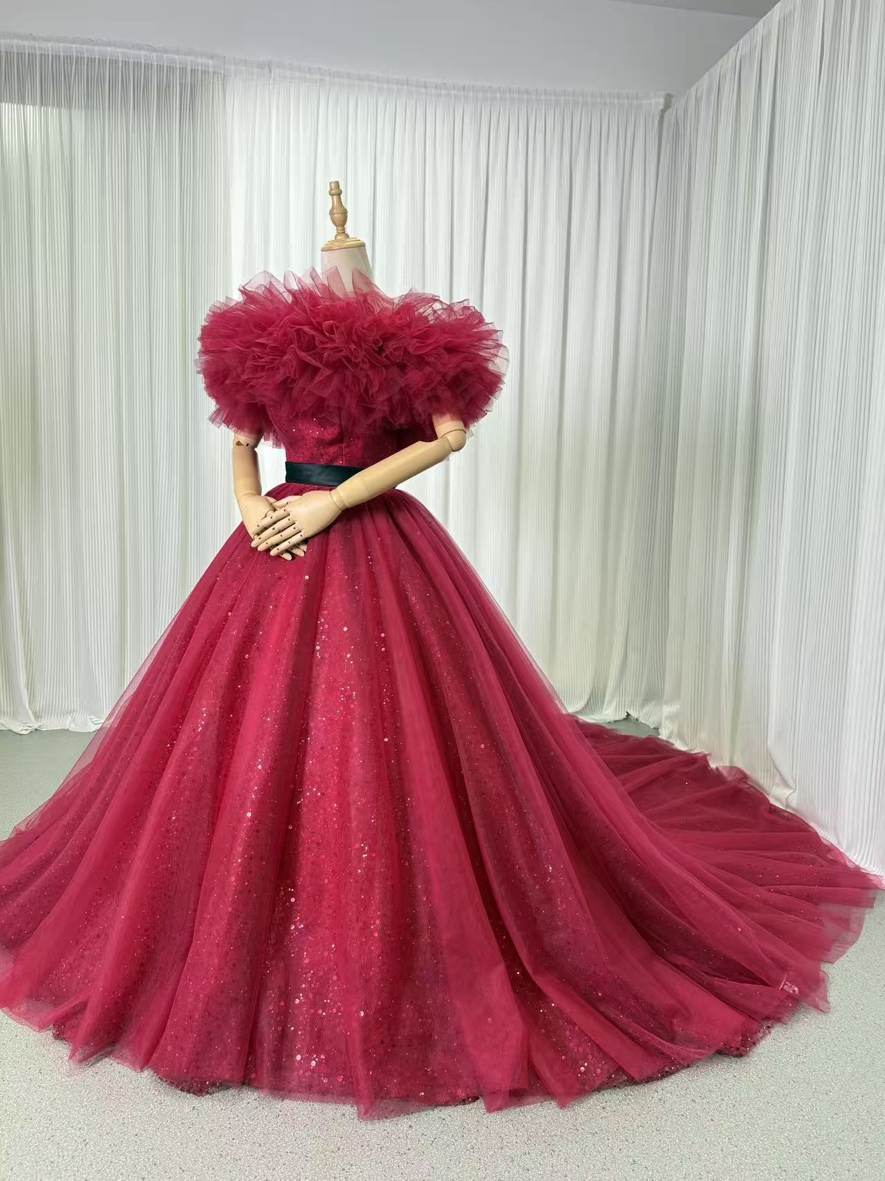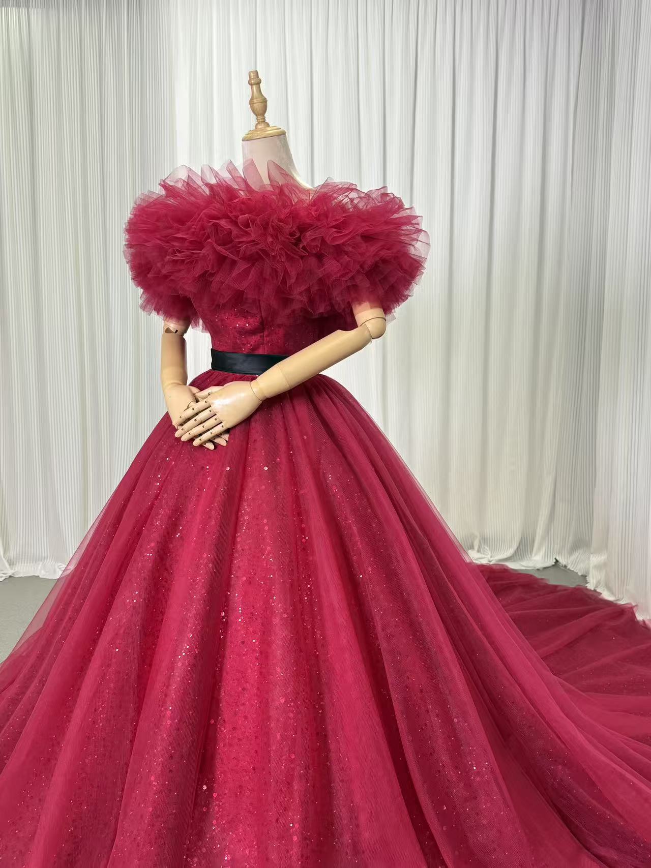 輝きな光彩を放つ 取り外しオフショルダー ワインレッド カラードレス 華やかなトレーン プリンセスライン 結婚式/披露宴
