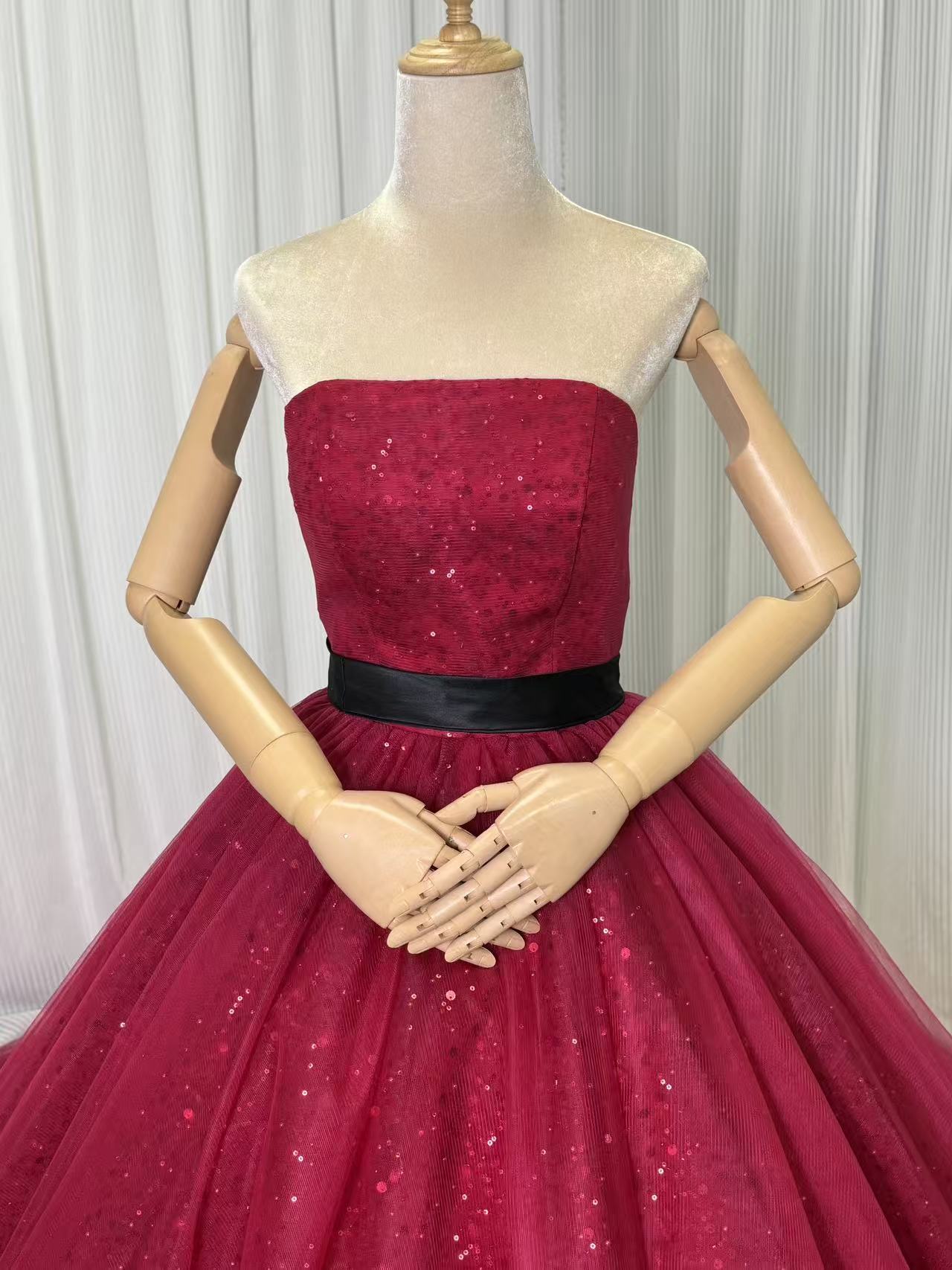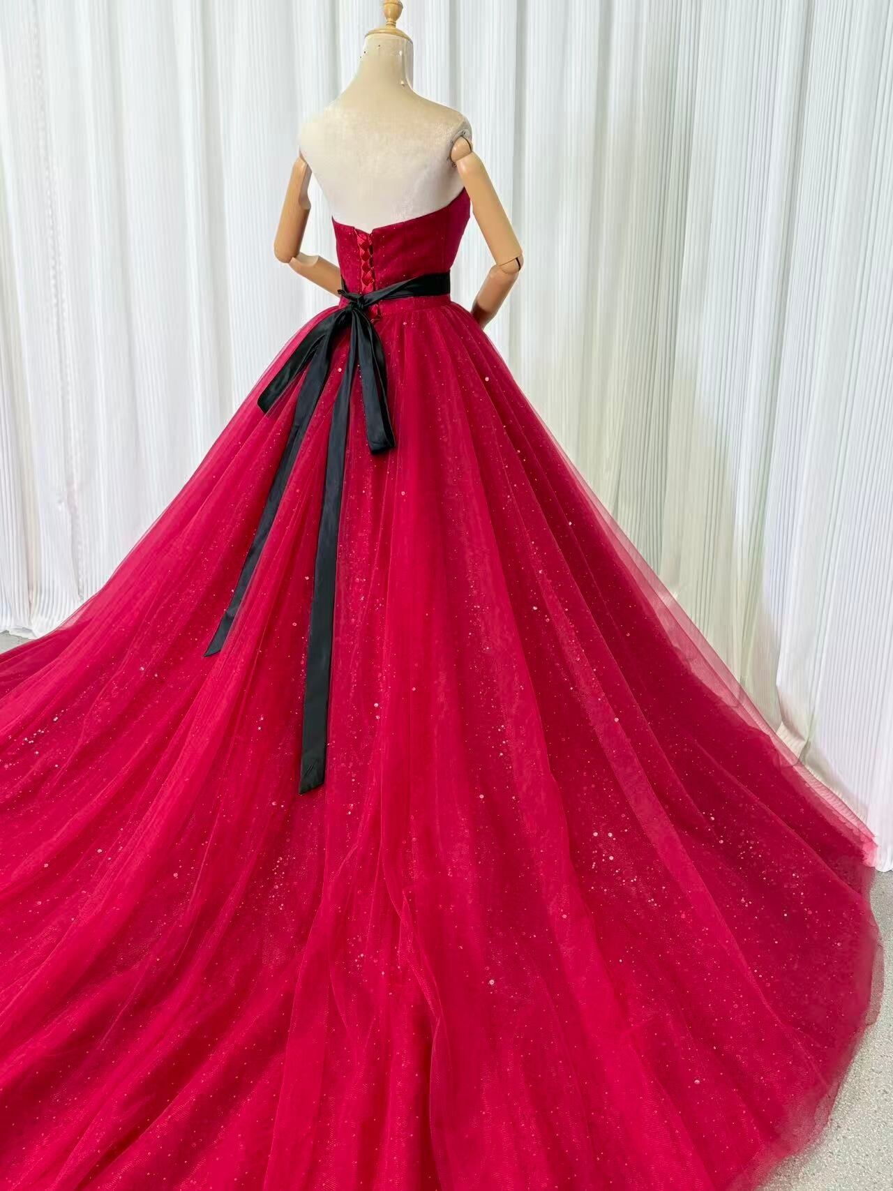 輝きな光彩を放つ ワインレッド ベアトップ カラードレス 華やかなトレーン プリンセスライン 結婚式/披露宴