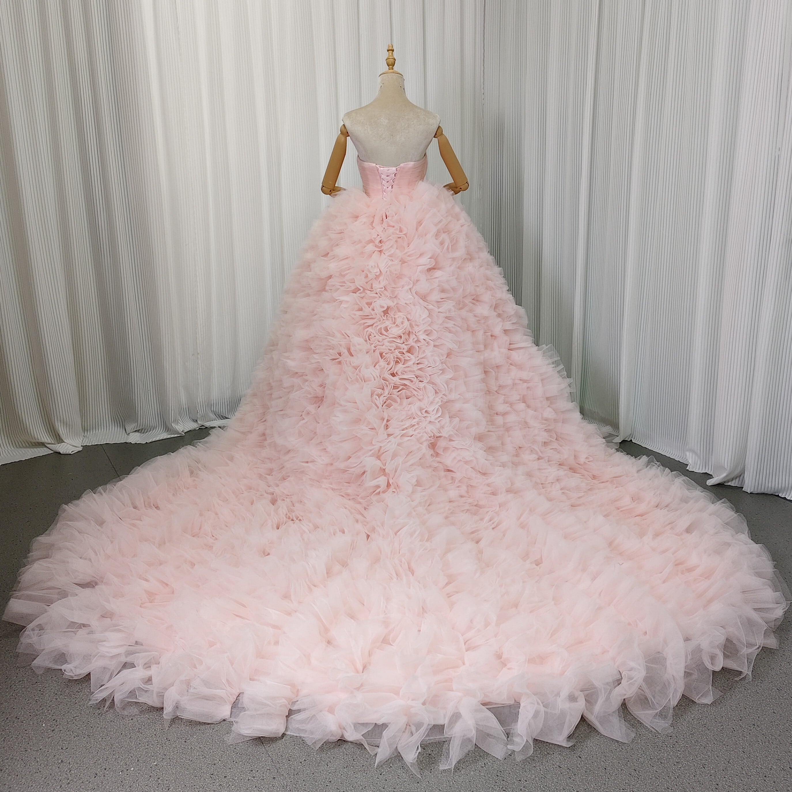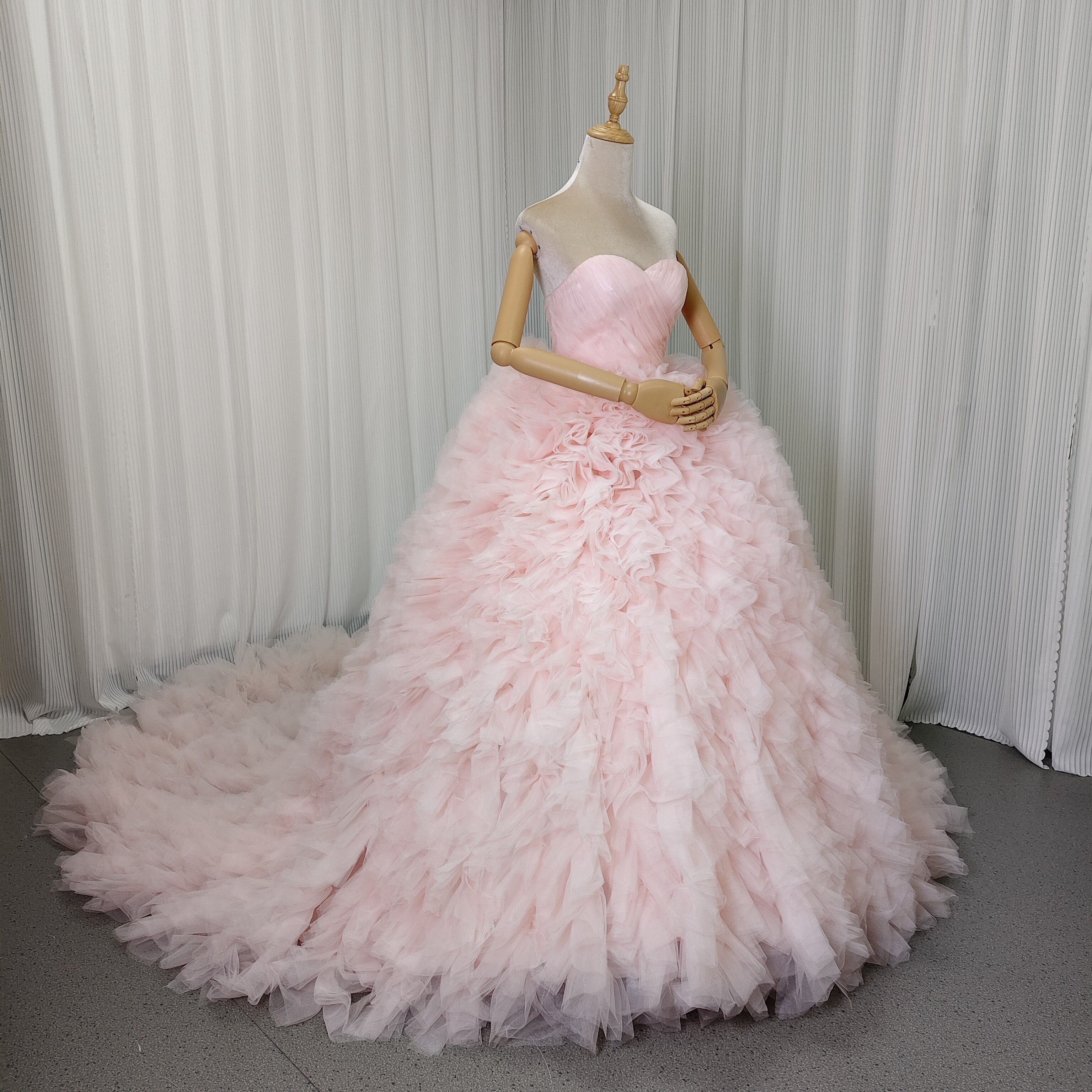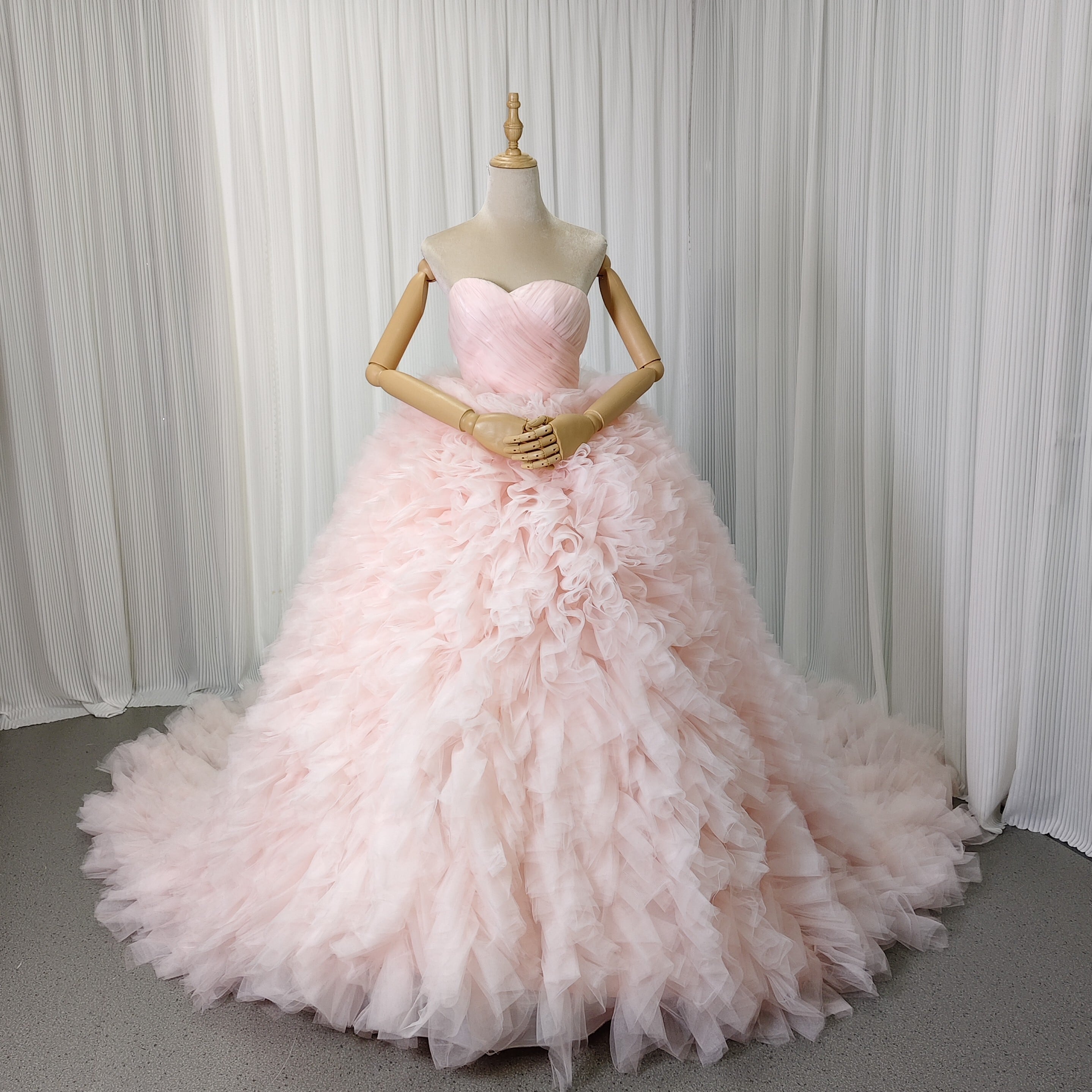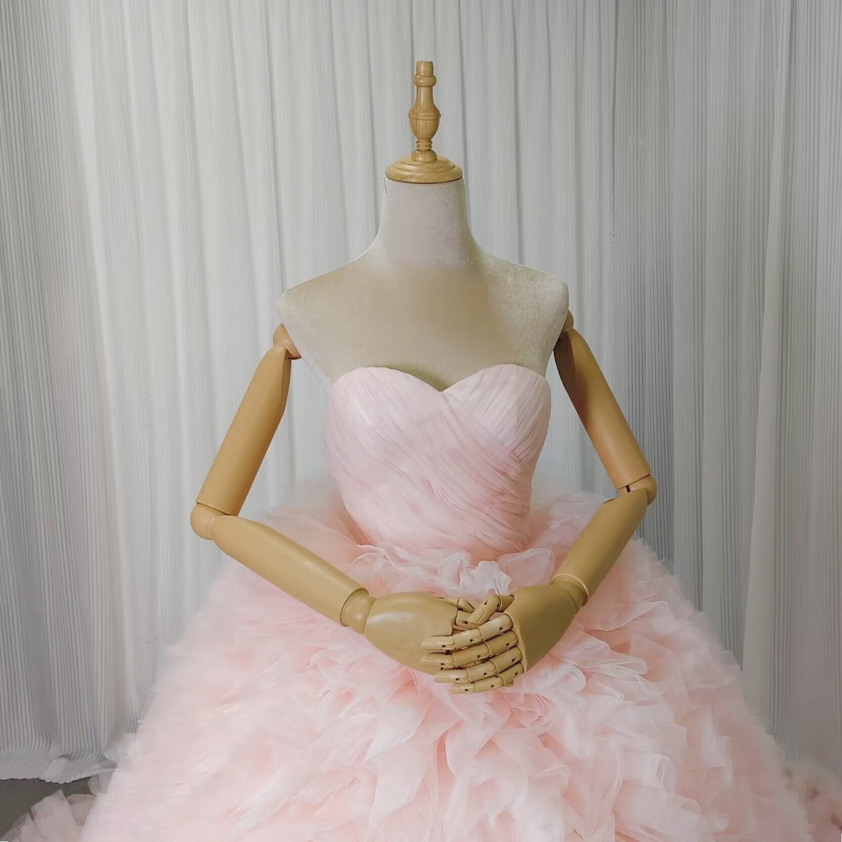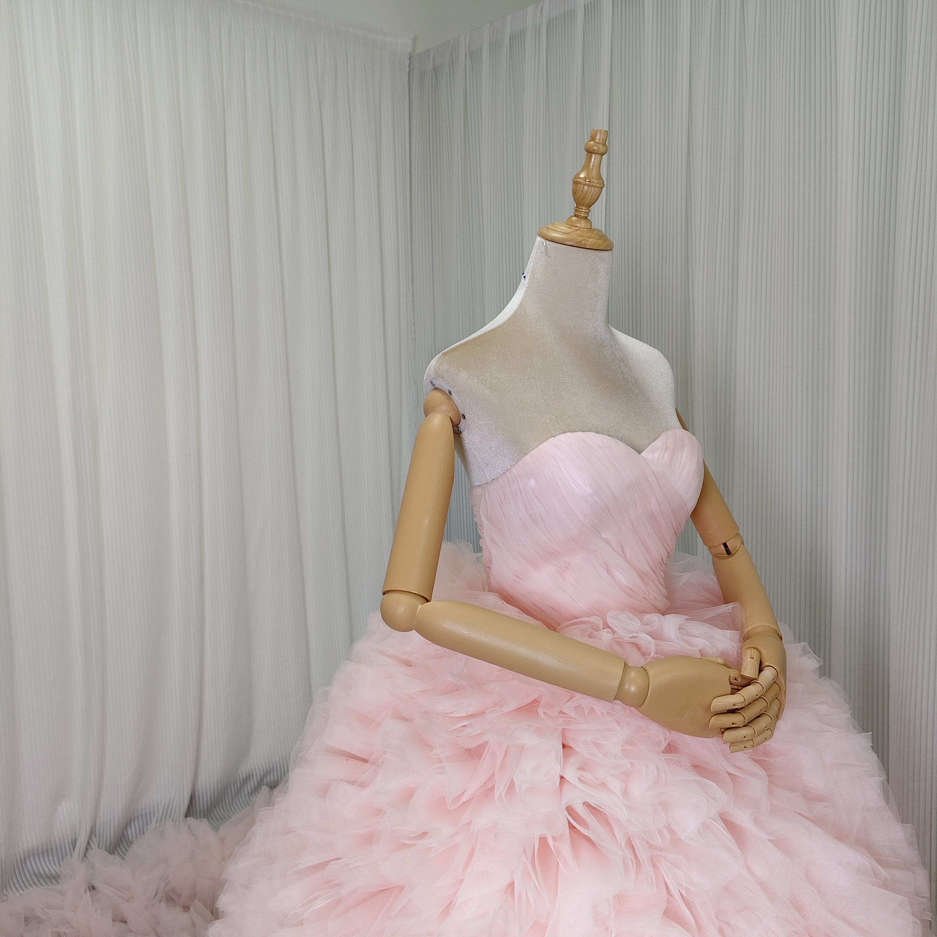 韓国風もこもこ ベアトップ ピンクカラードレス リボン チュールドレス フリルオフショルダー お色直しふわふわ もこもこドレス