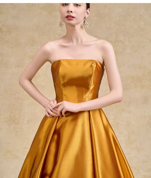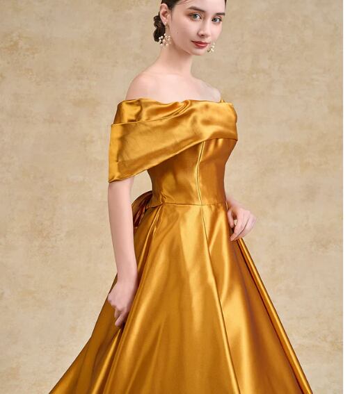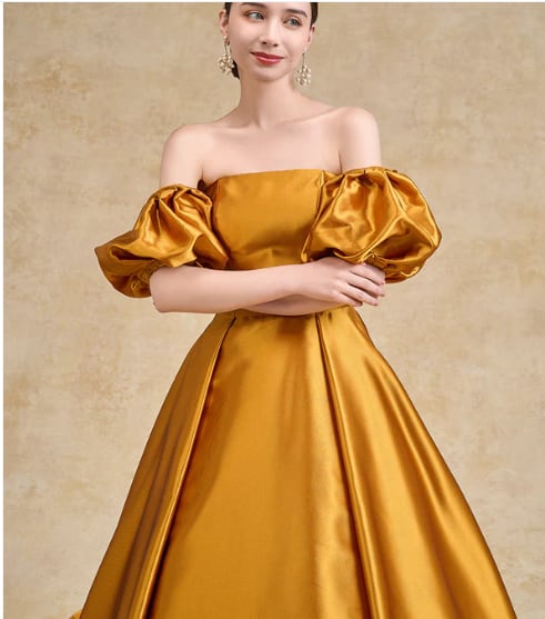 人気上昇! イエロー パフスリーブ ベアトップ カラードレス 華やかなトレーン 結婚式/披露宴