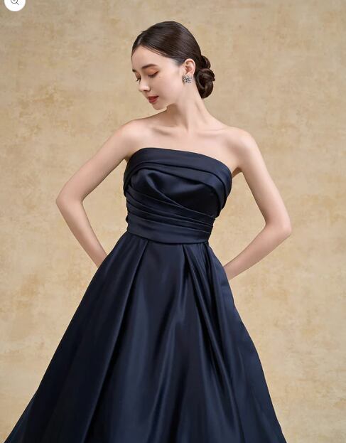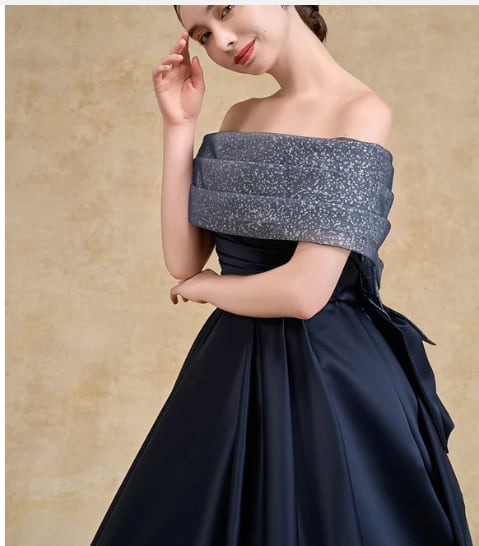 人気上昇!取り外しオフショルダー 紺 カラードレス 華やかなトレーン 結婚式/披露宴
