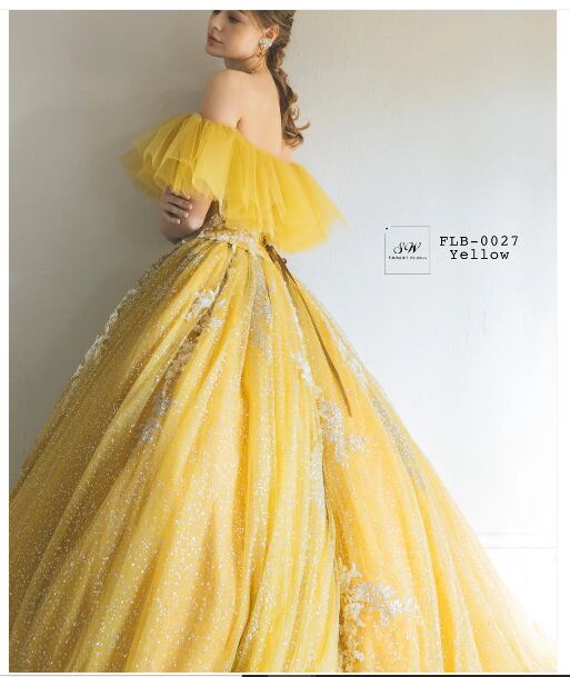 輝きな光彩を放つ 取り外しオフショルダー イエロー カラードレス ソフトチュール プリンセスライン 結婚式/披露宴