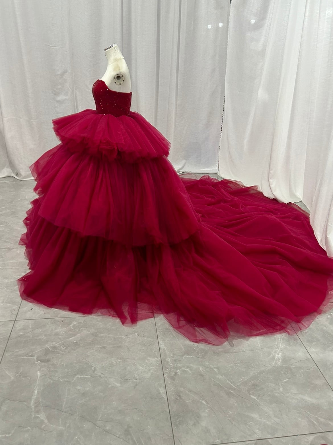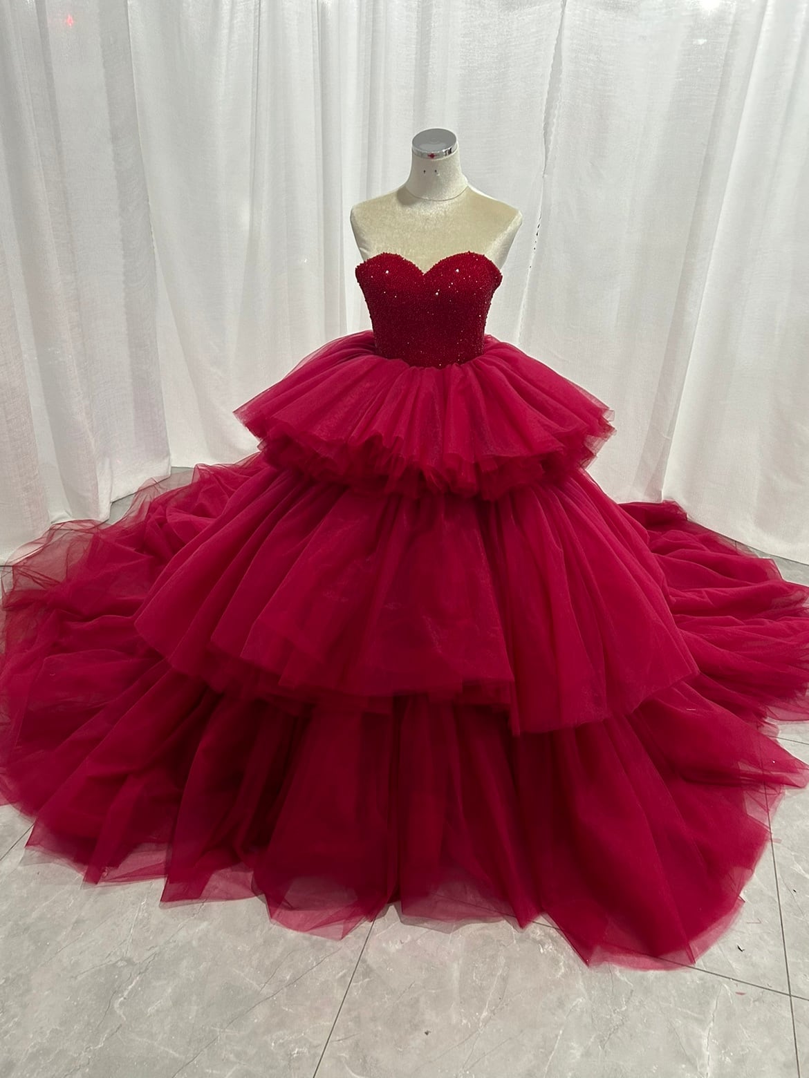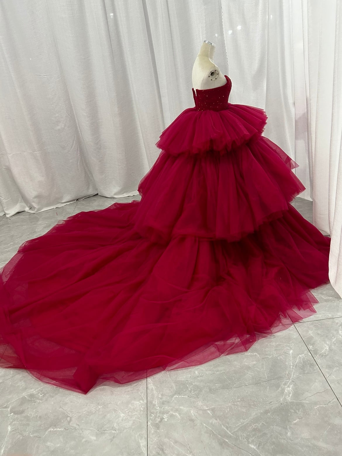 韓国風もこもこ ワインレッド カラードレス チュールドレス ティアードのドレス お色直しふわふわ もこもこドレス