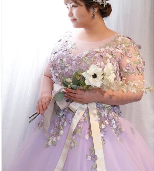 輝きな光彩を放つ ピンク紫 上品レース カラードレス ソフトチュール プリンセスライン 結婚式/披露宴
