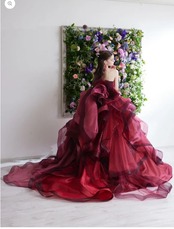 韓国風もこもこ ワインレッド カラードレス チュールドレス ティアードのドレス お色直しふわふわ もこもこドレス