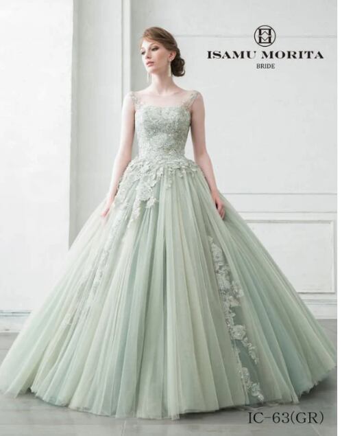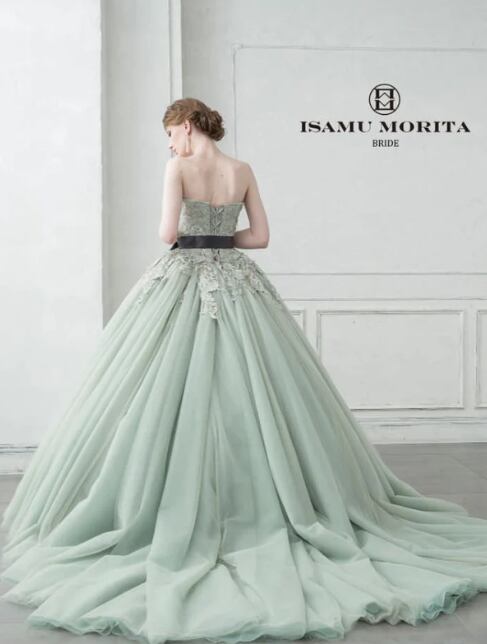 人気上昇!グリーン ベアトップ 上品レース カラードレス ソフトチュール 結婚式/披露宴