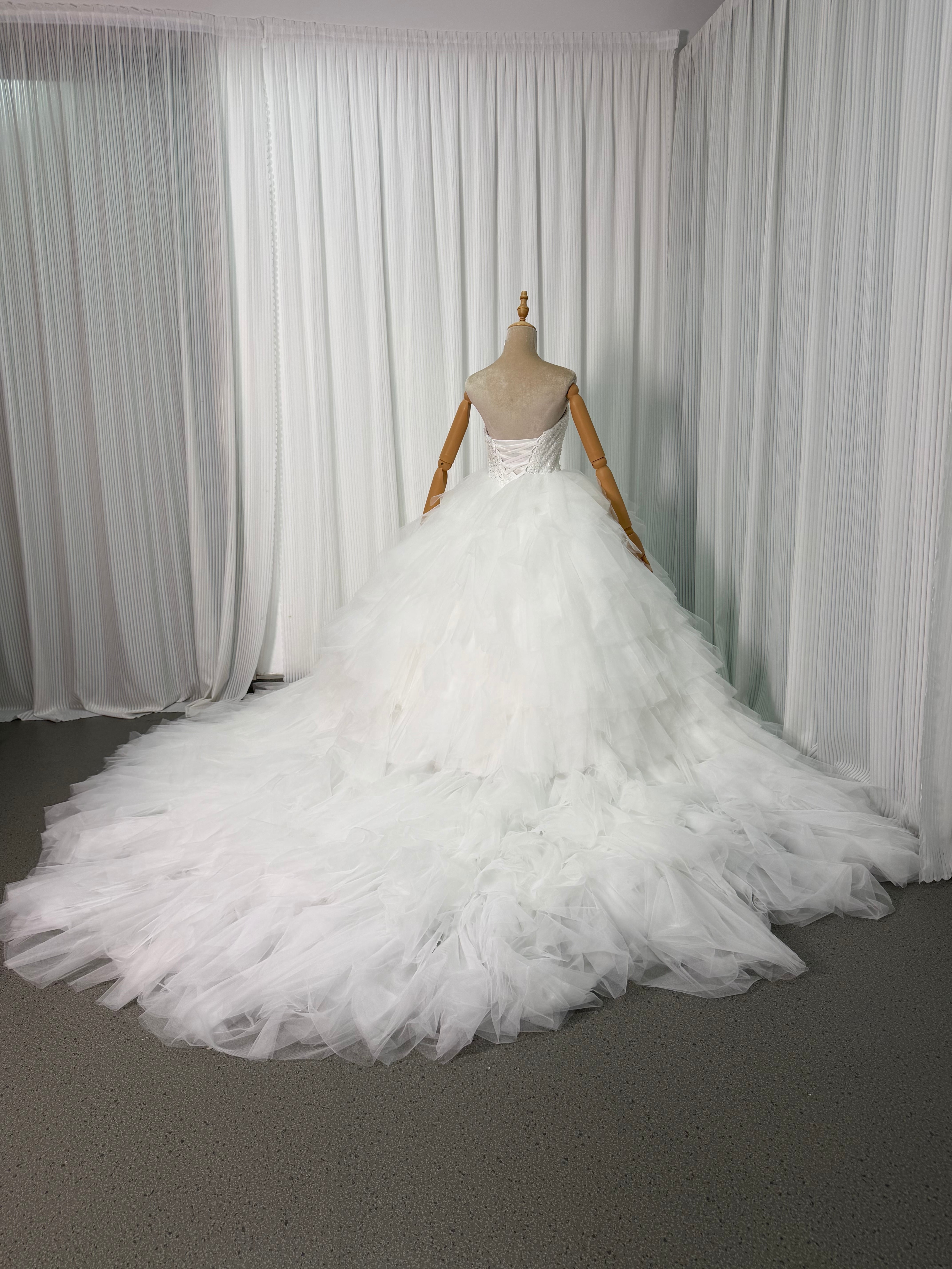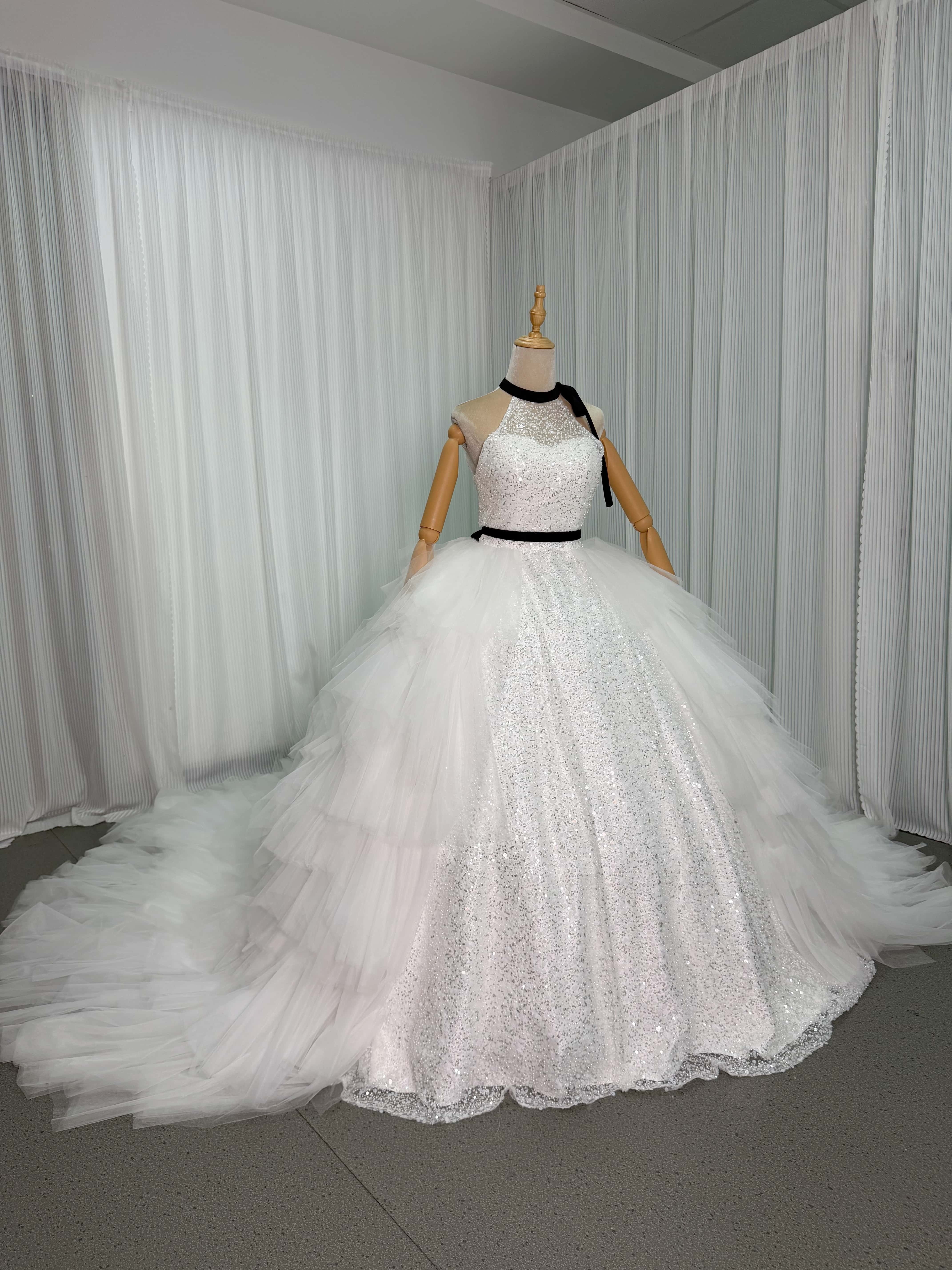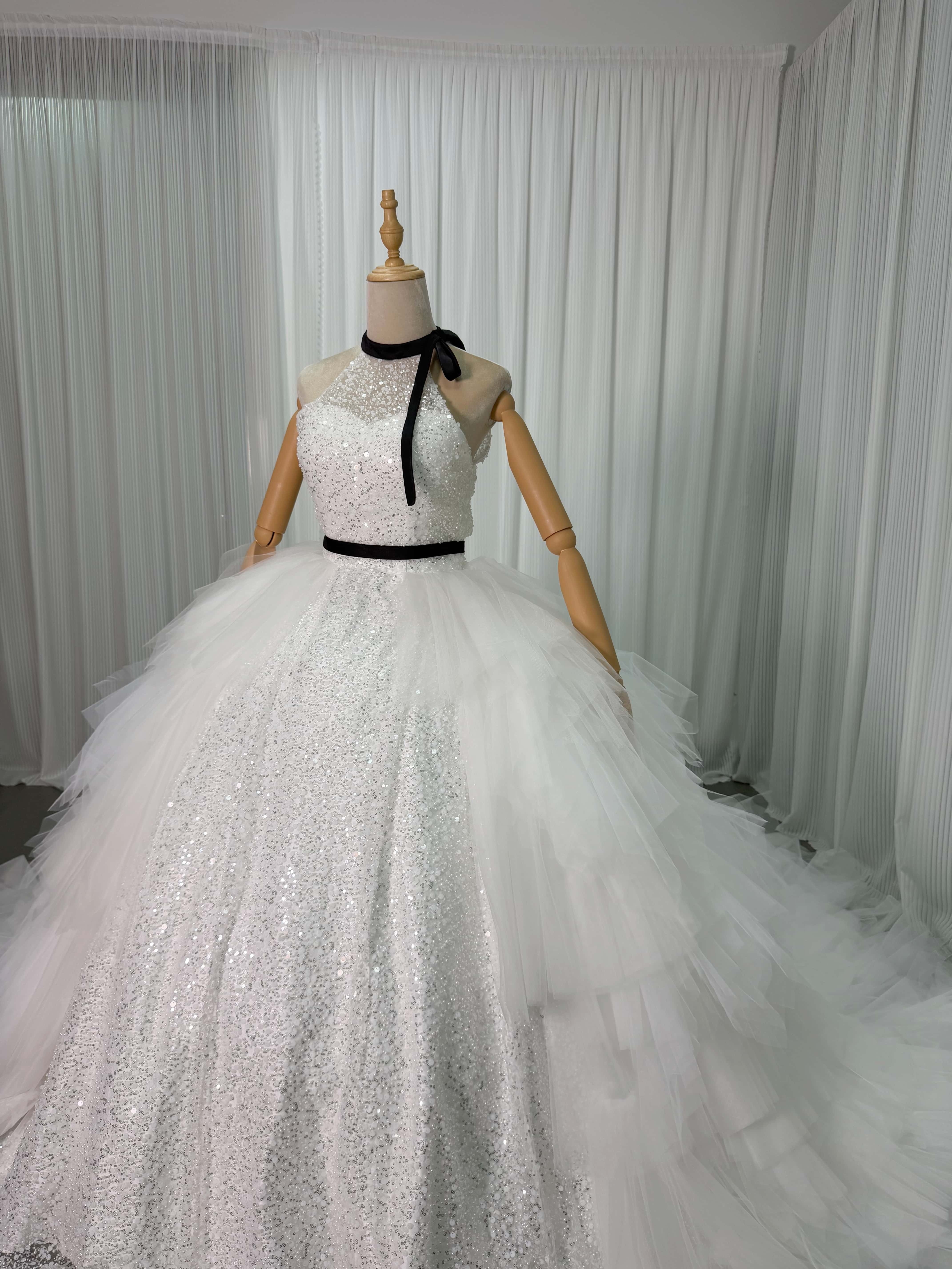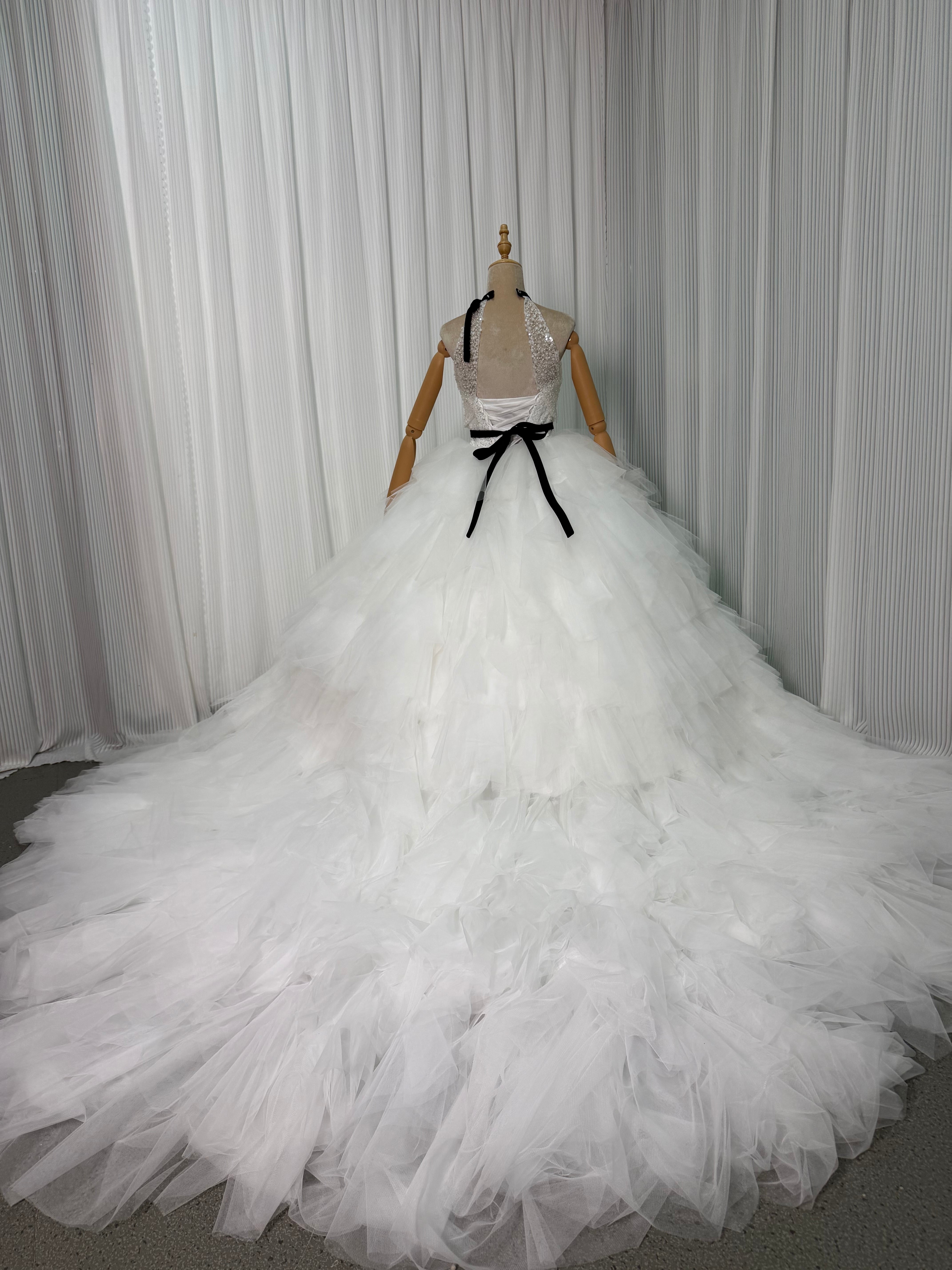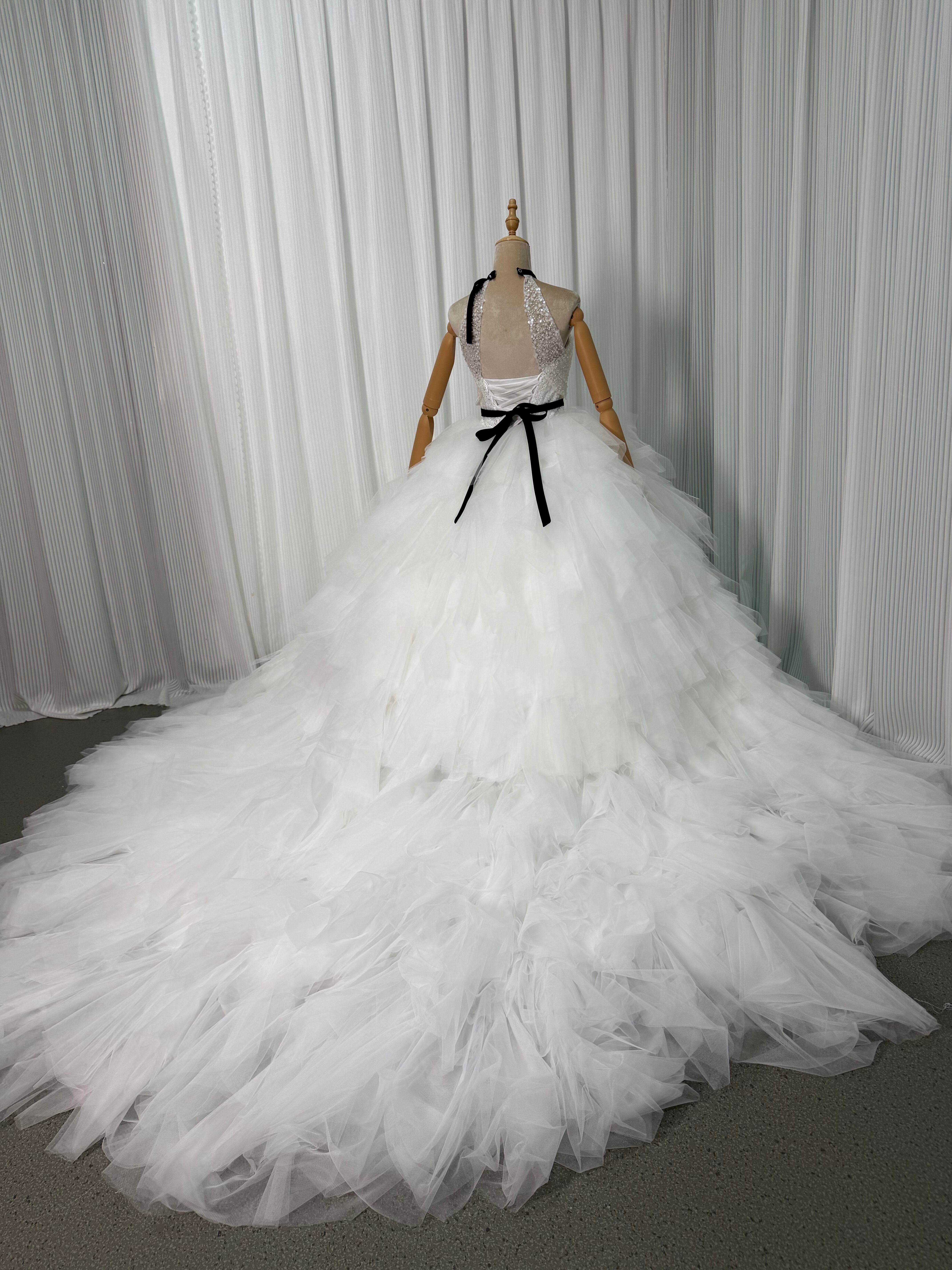 韓国風もこもこ ホルターネック ウエディングドレス チュールドレス ティアードのドレス お色直しふわふわ もこもこドレス華やかなトレーン
