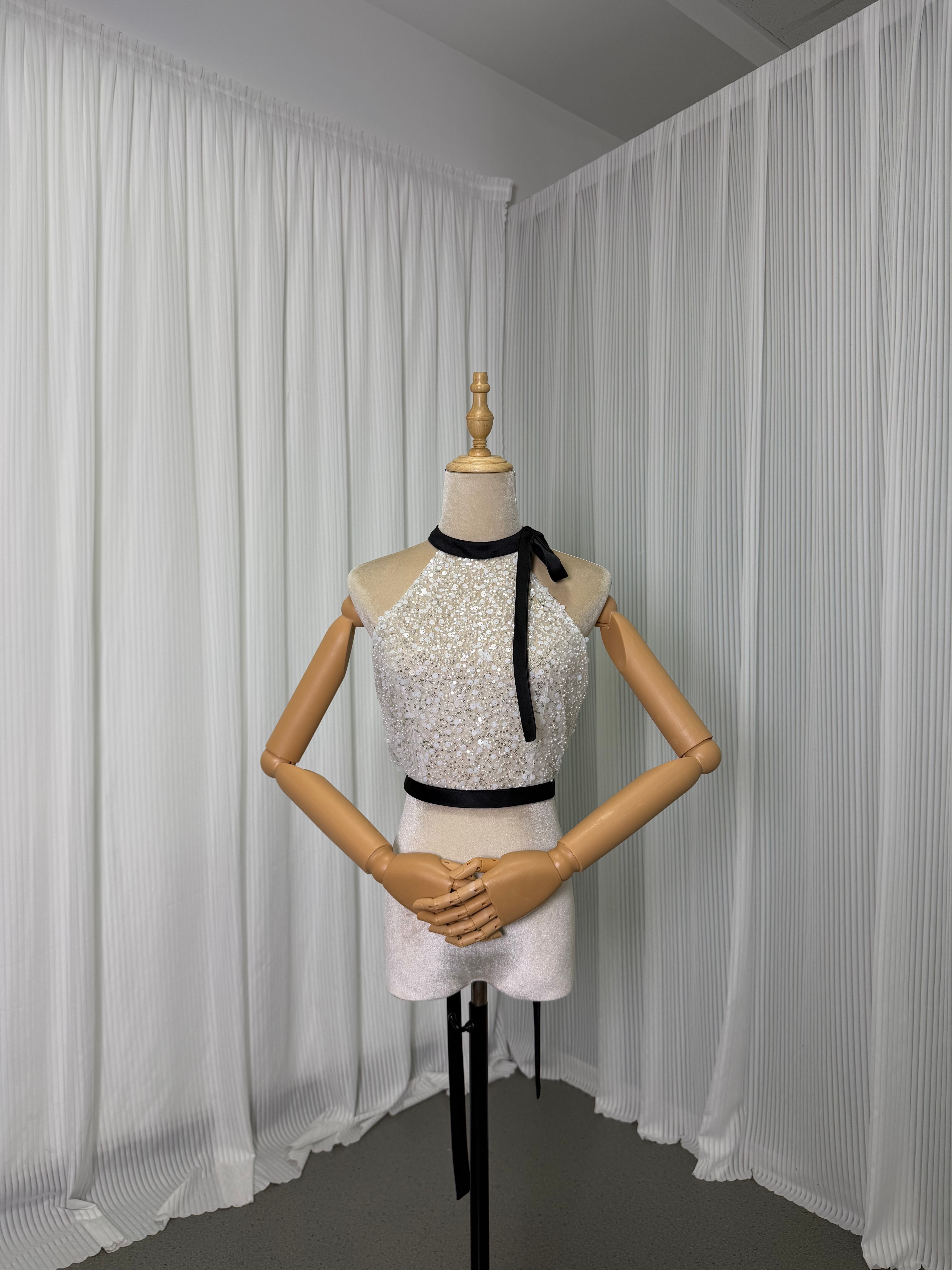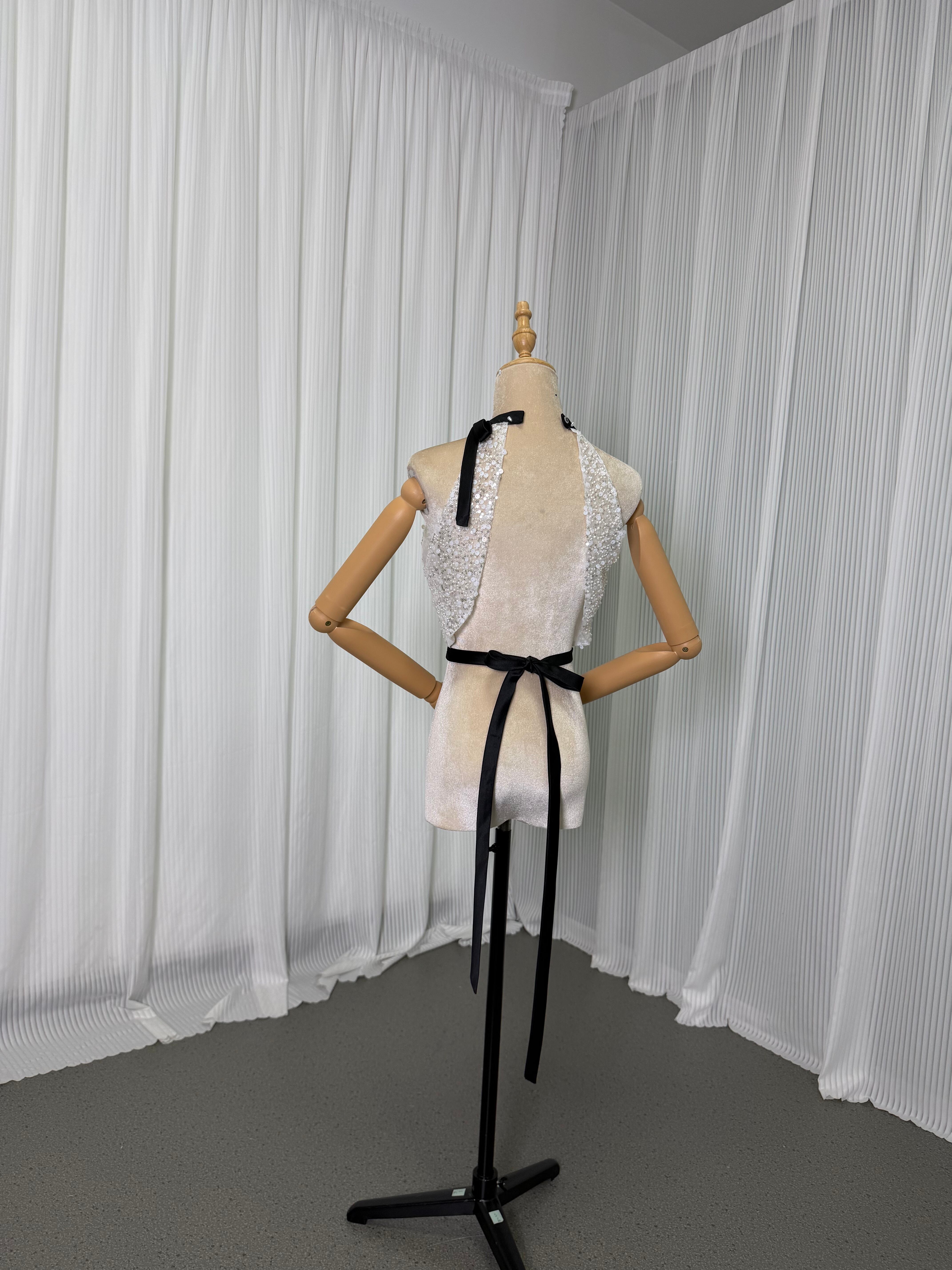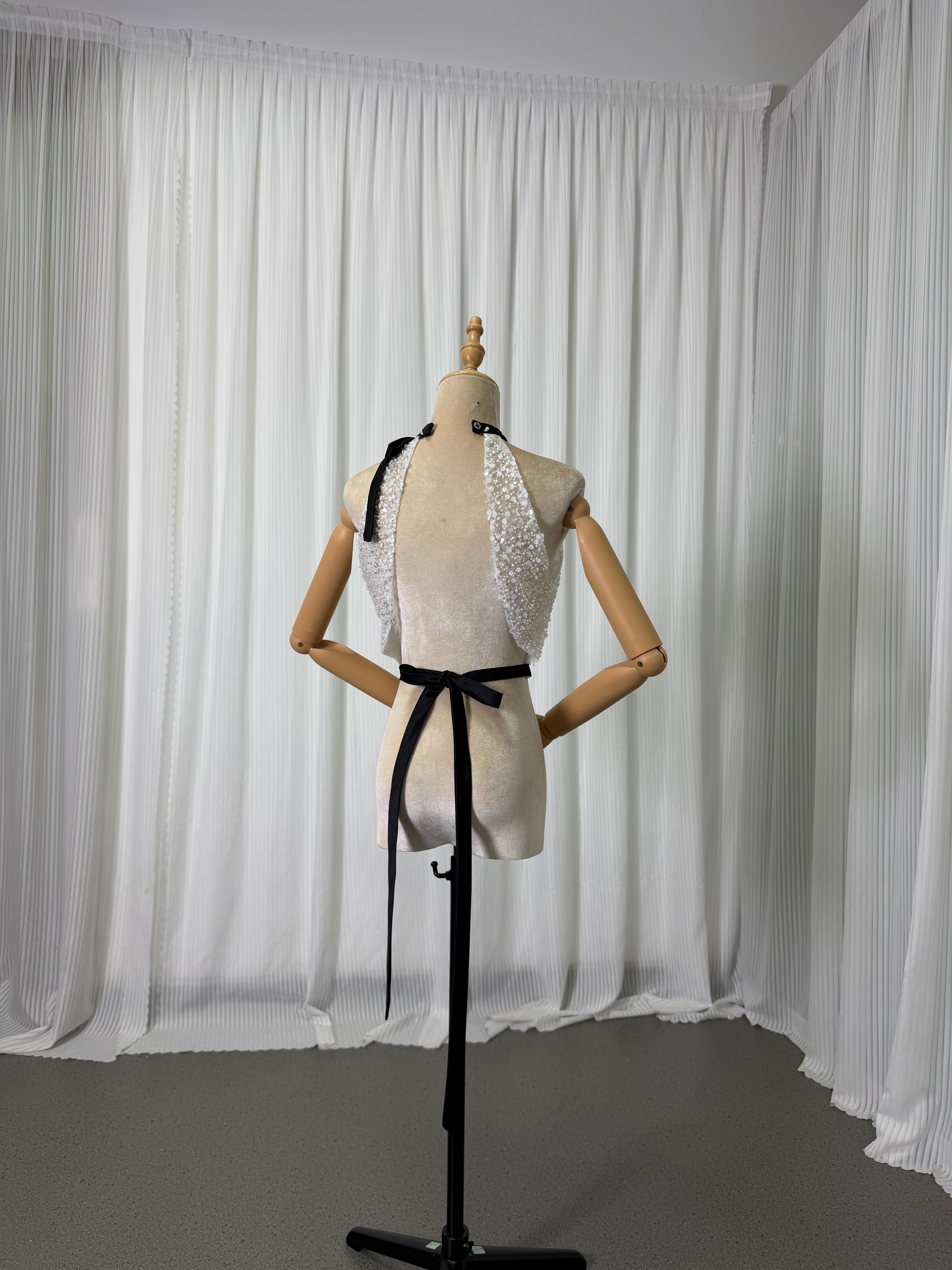 美品!オフホワイト ホルターネック 可憐な花刺繍のトッ 幻想的な輝きトップス 散发梦幻光彩的上衣 手作珠繍 手工珠绣 立体ショルダー 立体剪裁肩部 前撮り 花嫁 挙式 | David1021k Dress(ダヴィドレス)