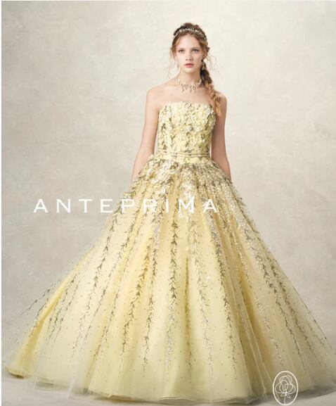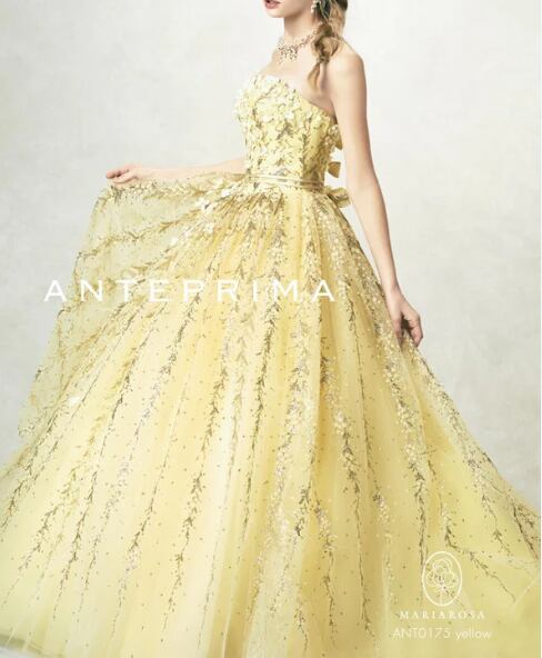 人気上昇! イエロー ベアトップ 上品レース カラードレス ソフトチュール プリンセスライン 結婚式/披露宴