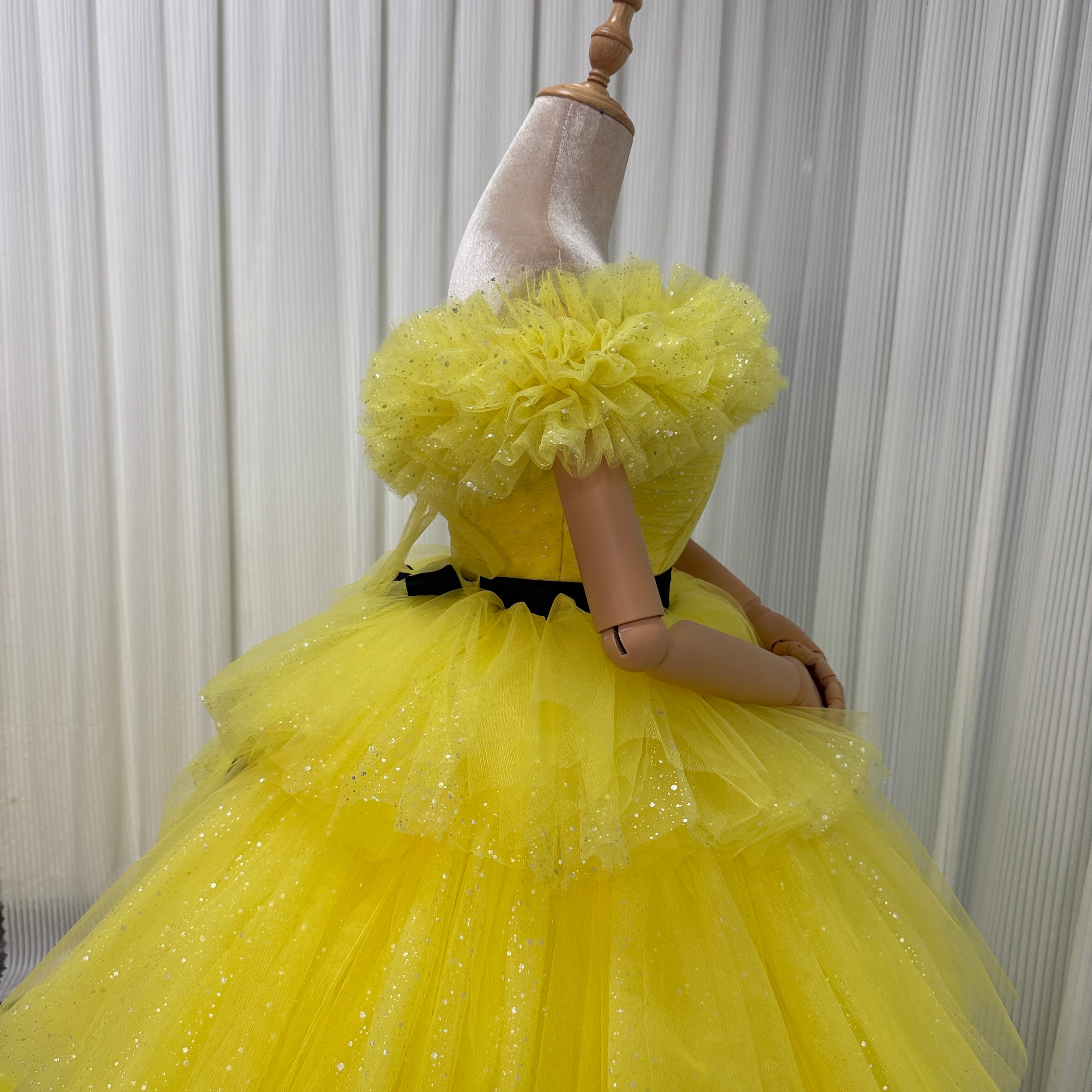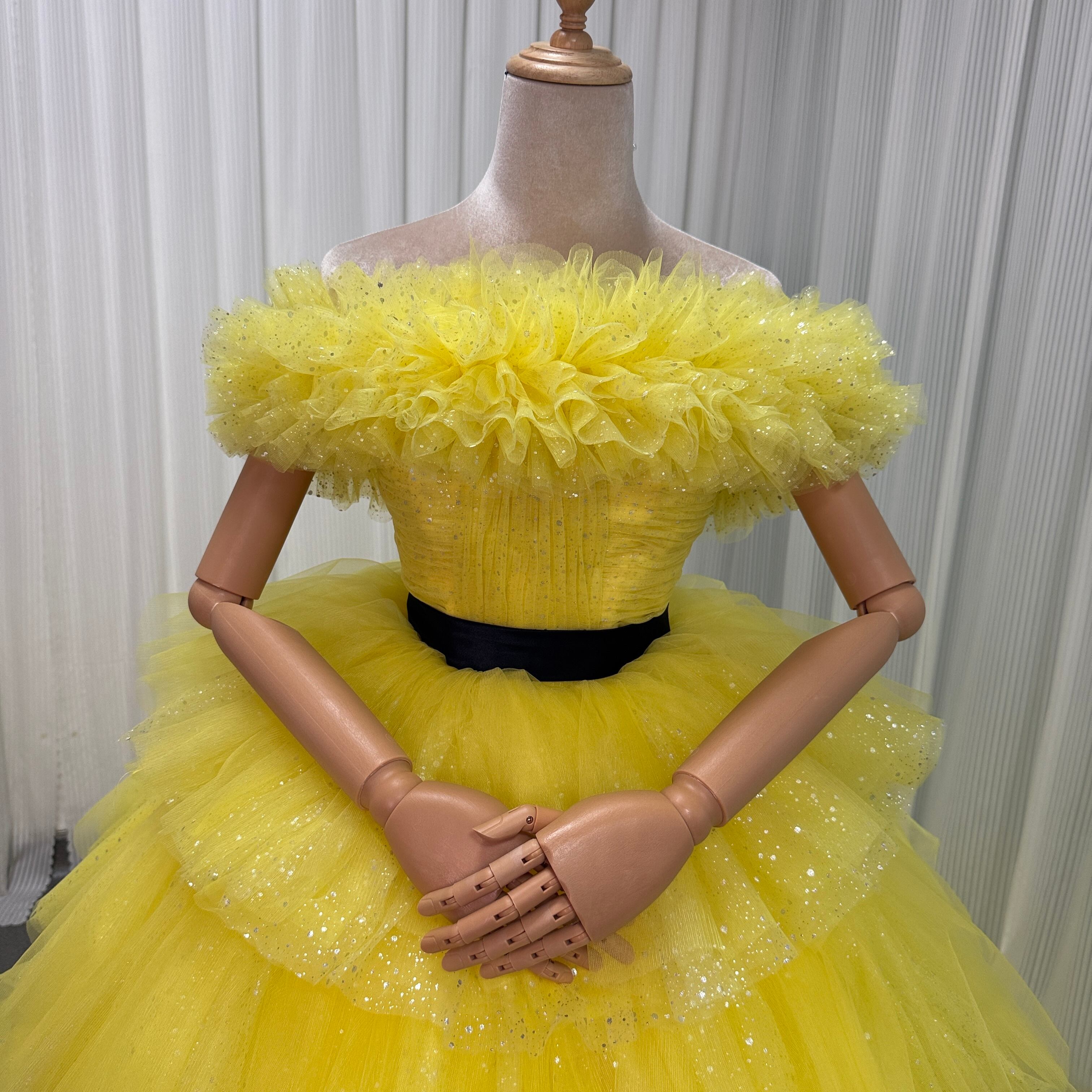 人気上昇!イエロー 取り外しオフショルダー カラードレス 柔らかく重ねたチュールスカート ソフトチュール人気上昇 コーヒーの色 ふわふわオーバースカート サッシュベルトティアードのド オーバードレス 結婚式 花嫁 挙式 結婚式/披露宴