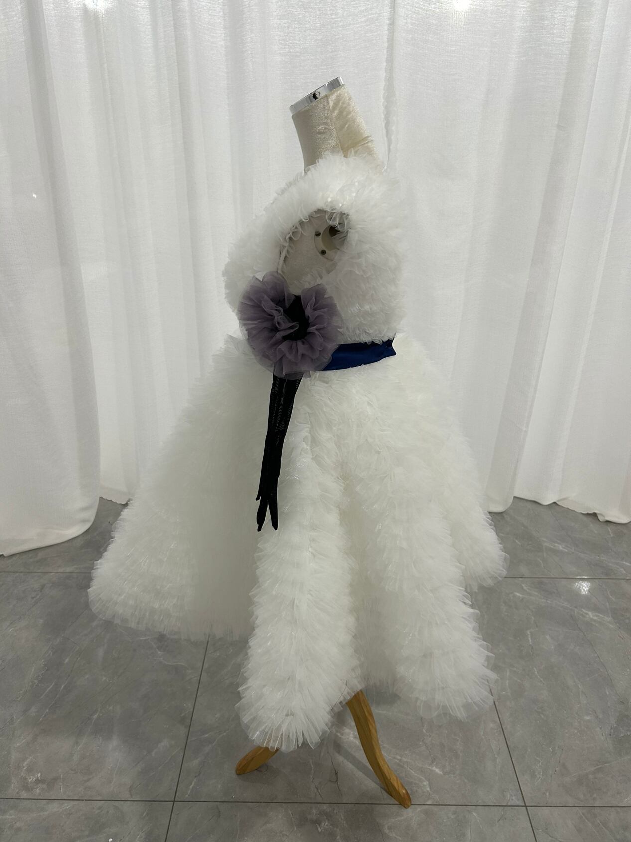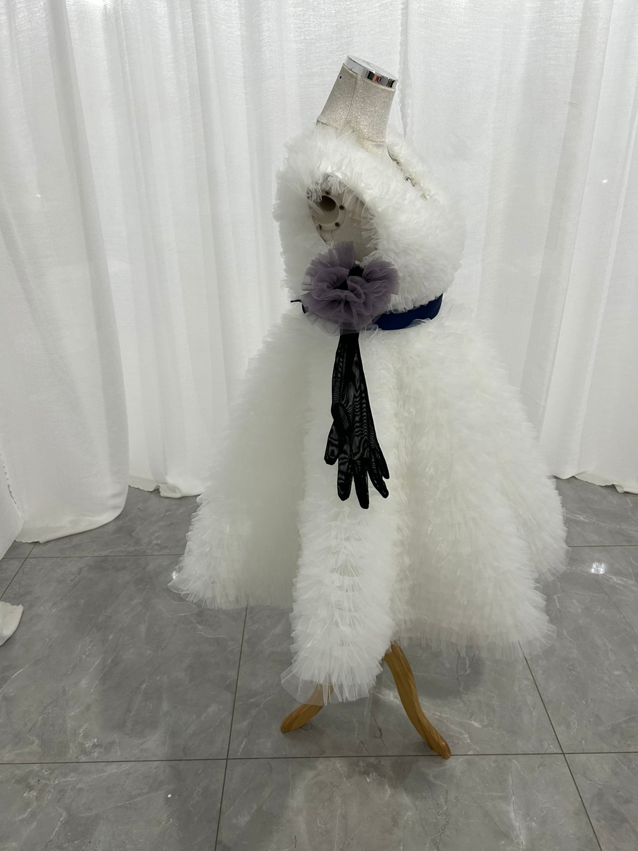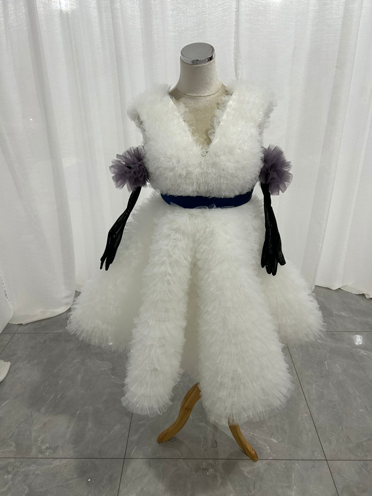 もこもこ Vネック ウエディングドレス韓国風ドレス 柔らかく重ねたチュールドレス+黒 グローブ 紫 ラッフルフリル