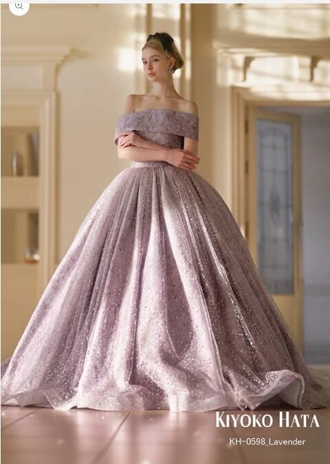 人気上昇! ピンク紫 オフショルダー カラードレス キラキラチュール 花嫁 挙式 結婚式