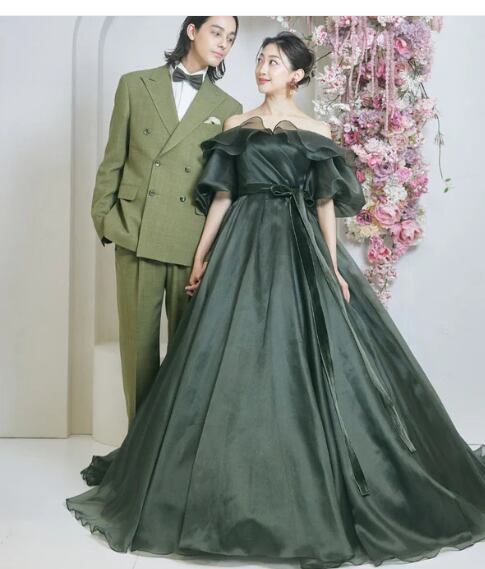 人気上昇! グリーン オフショルダー 光沢サテン カラードレス Aライン 結婚式/披露宴