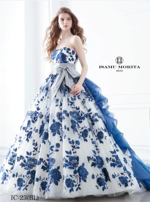人気上昇! 青 3D立体レース刺繍 ふっくら柔らかなバックリボンカラードレス ソフトチュール プリンセスライン 結婚式/披露宴