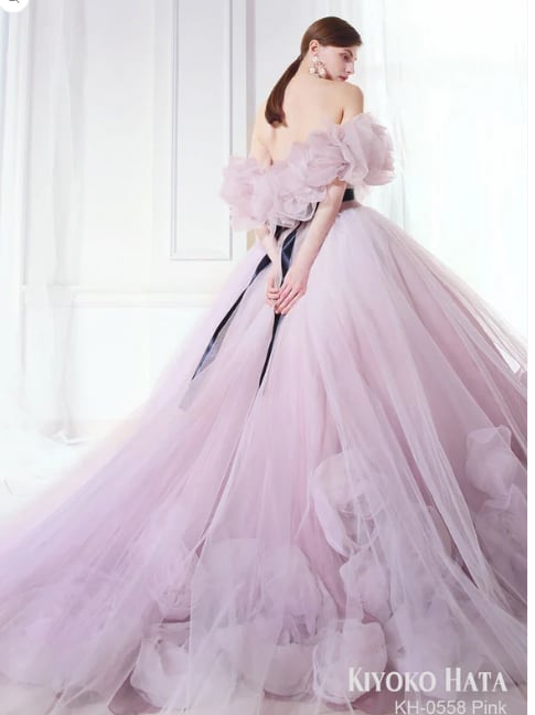 豪華!ピンク オフショルダー 裾引き バラ カラードレス ソフトチュール プリンセスライン結婚式