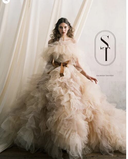 輝きな光彩を放つ シャンパン色 カラードレス ソフトチュール ロングトレーン 柔らかく重ねたチュールスカート 結婚式