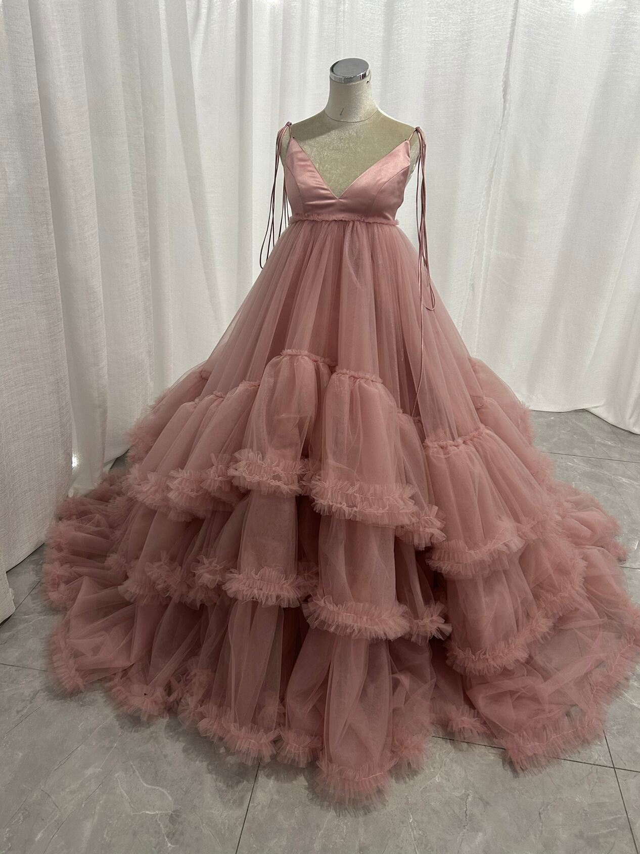 韓国風もこもこウエディングドレス ピンク カラードレス ふんわり チュール ボリュームたっぷり 花嫁/挙式/前撮
