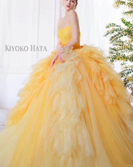 韓国風も イエロー カラードレス ふんわりチュールボリュームたっぷり フレアスカート 花嫁/挙式/前撮