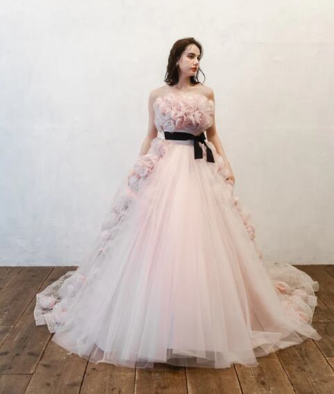 ライトピンク ベアトップ 3D立体レース 刺繍 ソフトチュール カラードレスプリンセスライン 二次会/2次会/挙式/前撮り