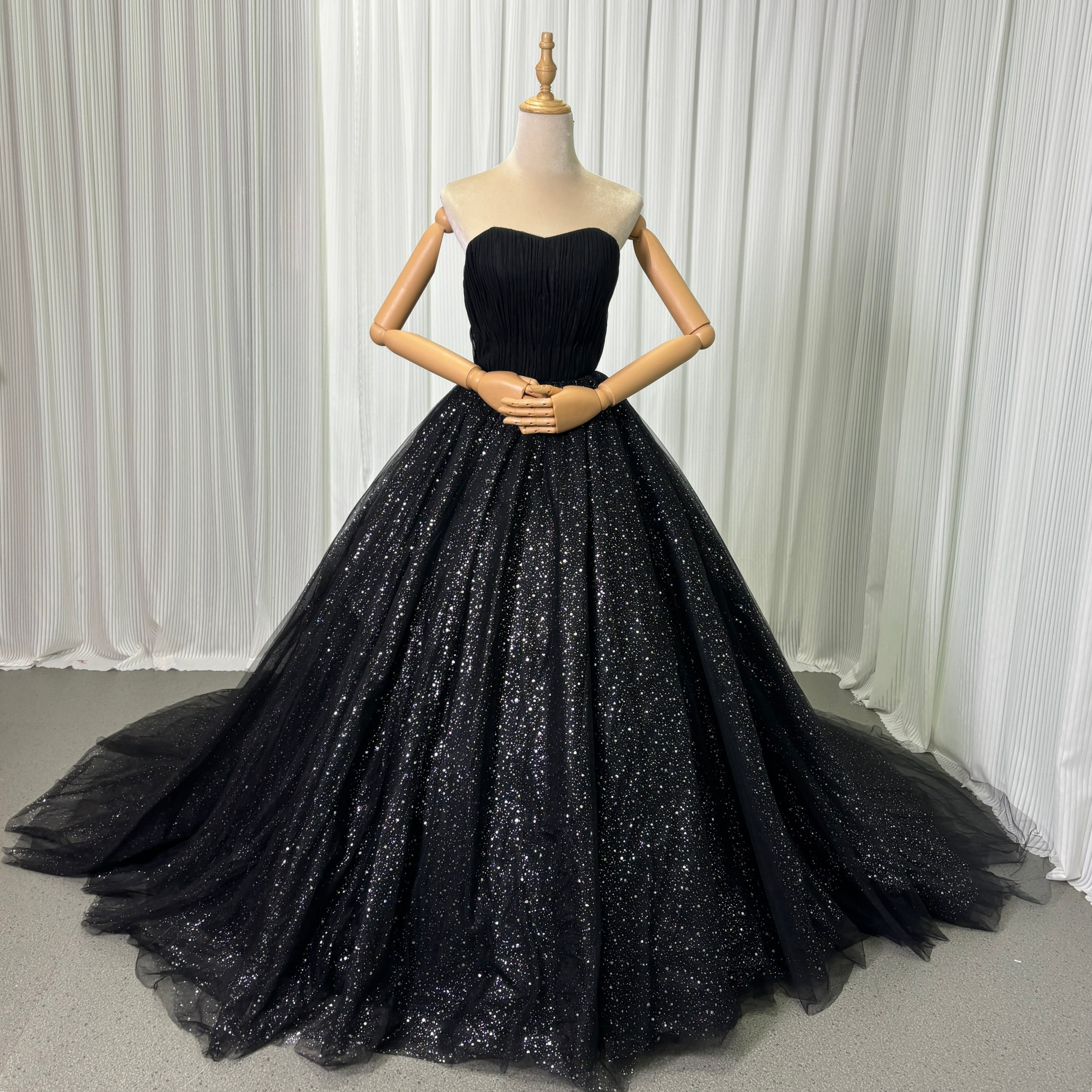 黒 ベアトップ ソフトチュール キラキラグリッターチュール カラードレス プリンセスライン 結婚式