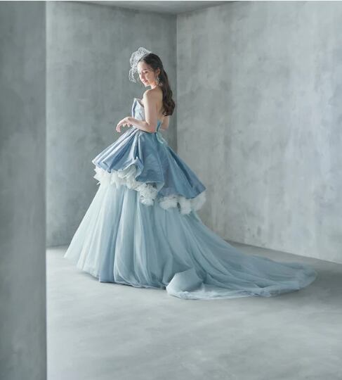 大好評中! 青 ベアトップ ソフトチュール カラードレス ティアードのドレス プリンセスライン 結婚式