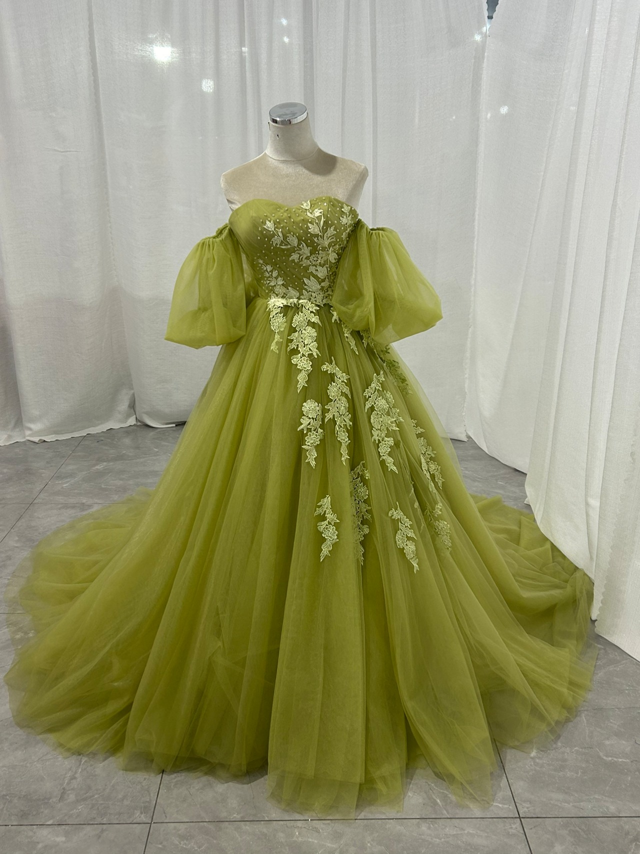 送料無料!グリーンカラードレス 3D立体レース刺繍 ソフトチュール 黄緑色パーティードレス 花嫁/前撮り/演奏会/音楽