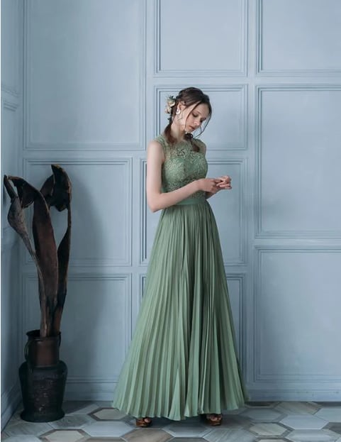 送料無料!グリーンカラードレス 3D立体レース刺繍 ソフトチュール ーティードレス プリーツドレス花嫁/前撮り/演奏会/音楽