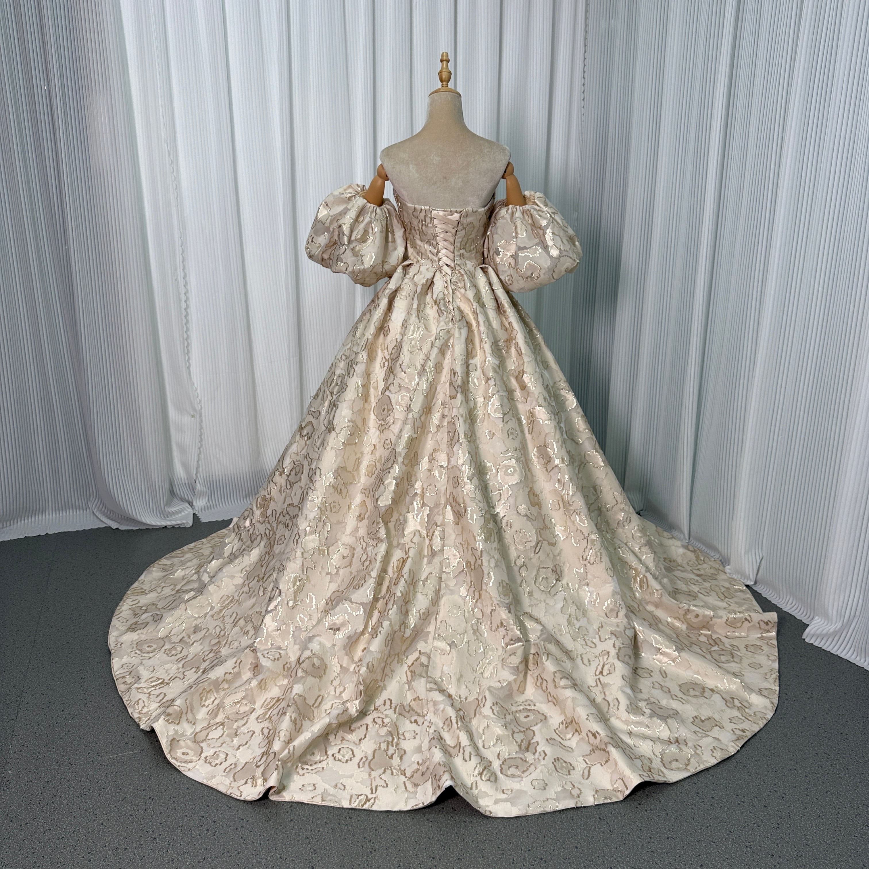 送料無料!シャンパン パフスリーブ ベアトップ カラードレス 3D立体レース刺繍 パーティードレス 花嫁/前撮り/演奏会/音楽