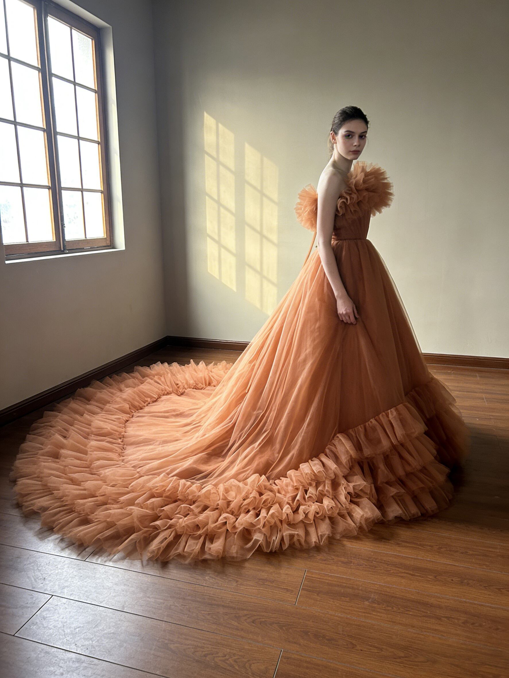 大好評中!テラコッタ色 カラードレス取り外しオフショルダー ンジー パフスリーブ プリンセスライン /結婚式披露