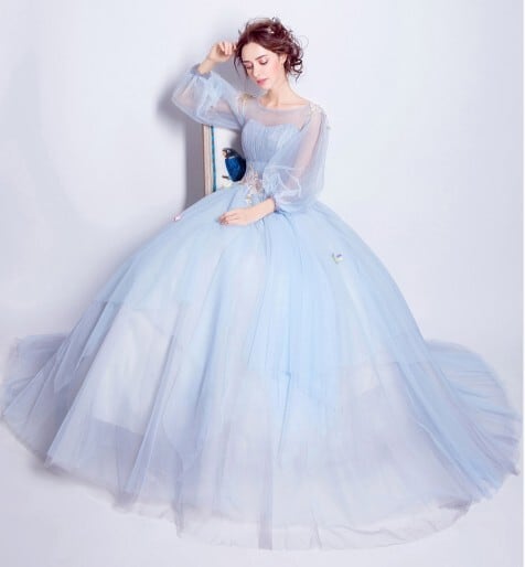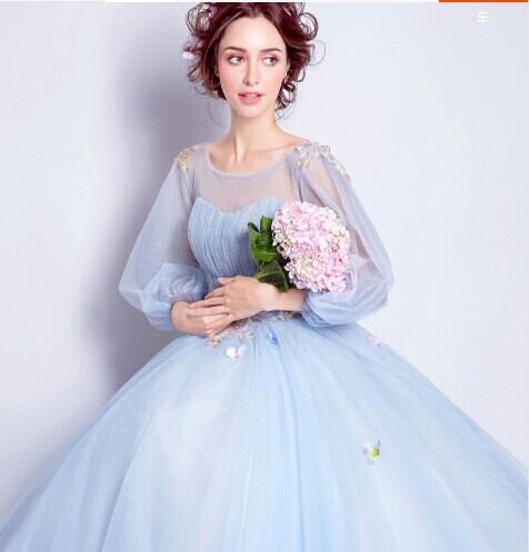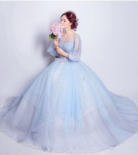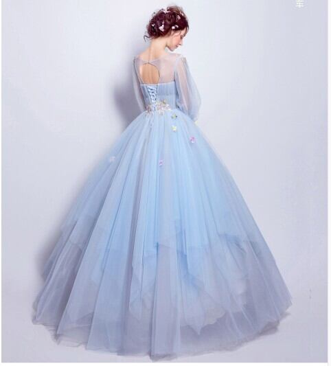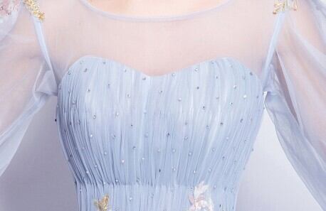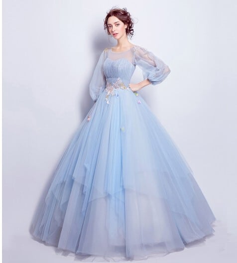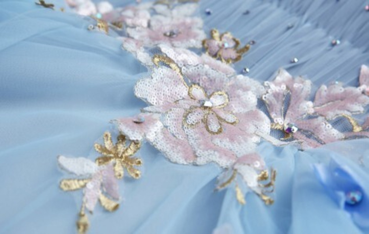 豪華!パーティードレス ロングドレス 青/ブルー パフスリーブ 花柄のモチーフ刺繍が美しく