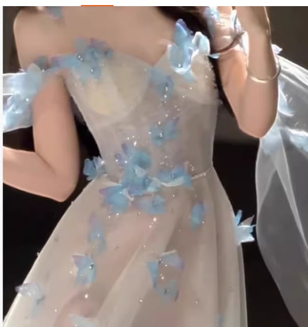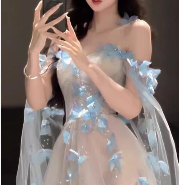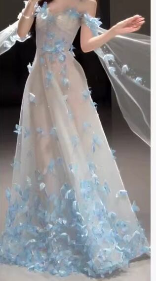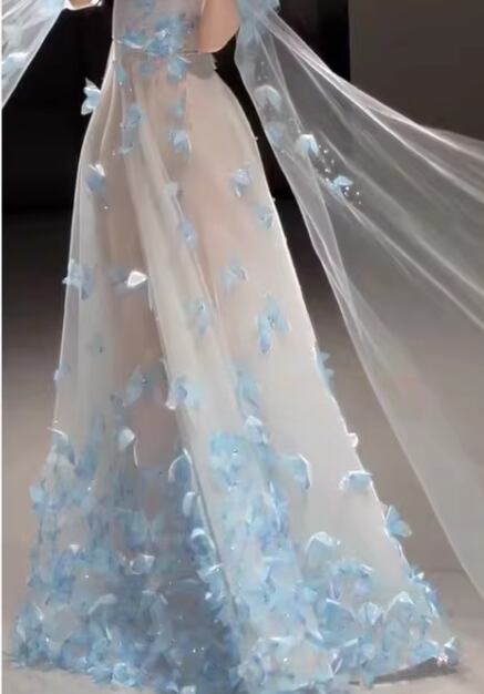 豪華!パーティードレス 青/ブルー ふわふわ袖 3D立体レース刺繍リボン/挙式/前撮り/花嫁/結婚式/披露宴/