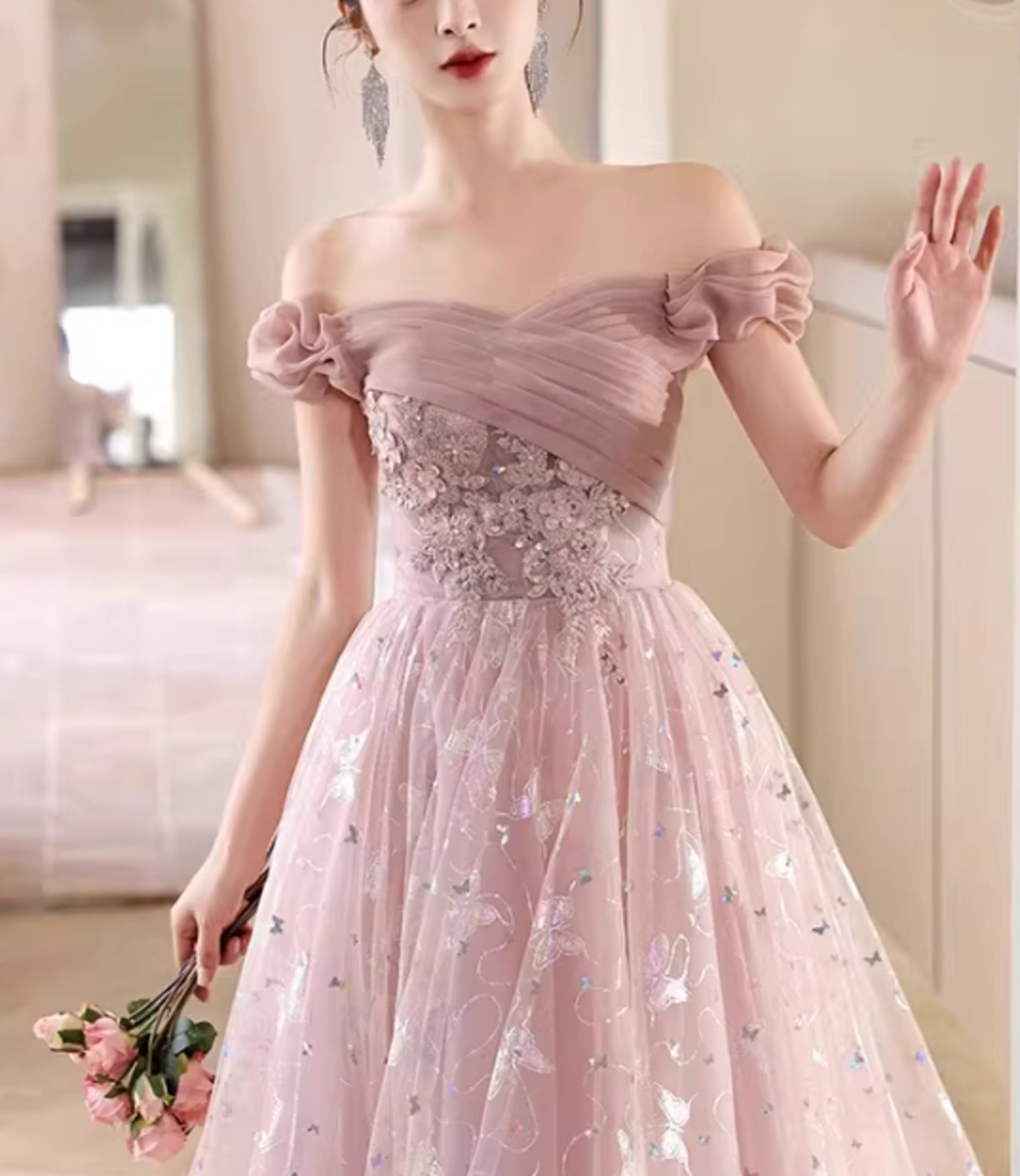 オフショルダー パーティードレス カラードレス上品花レース 挙式/前撮り/花嫁/結婚式/披露宴/