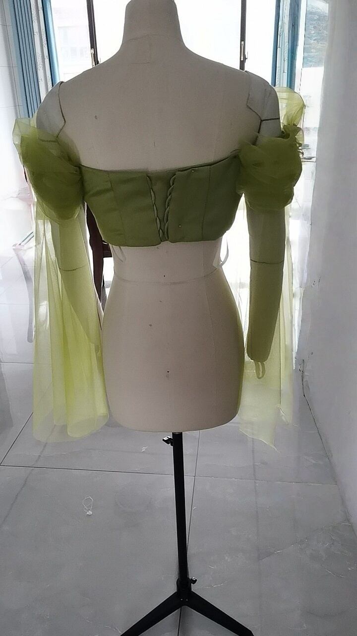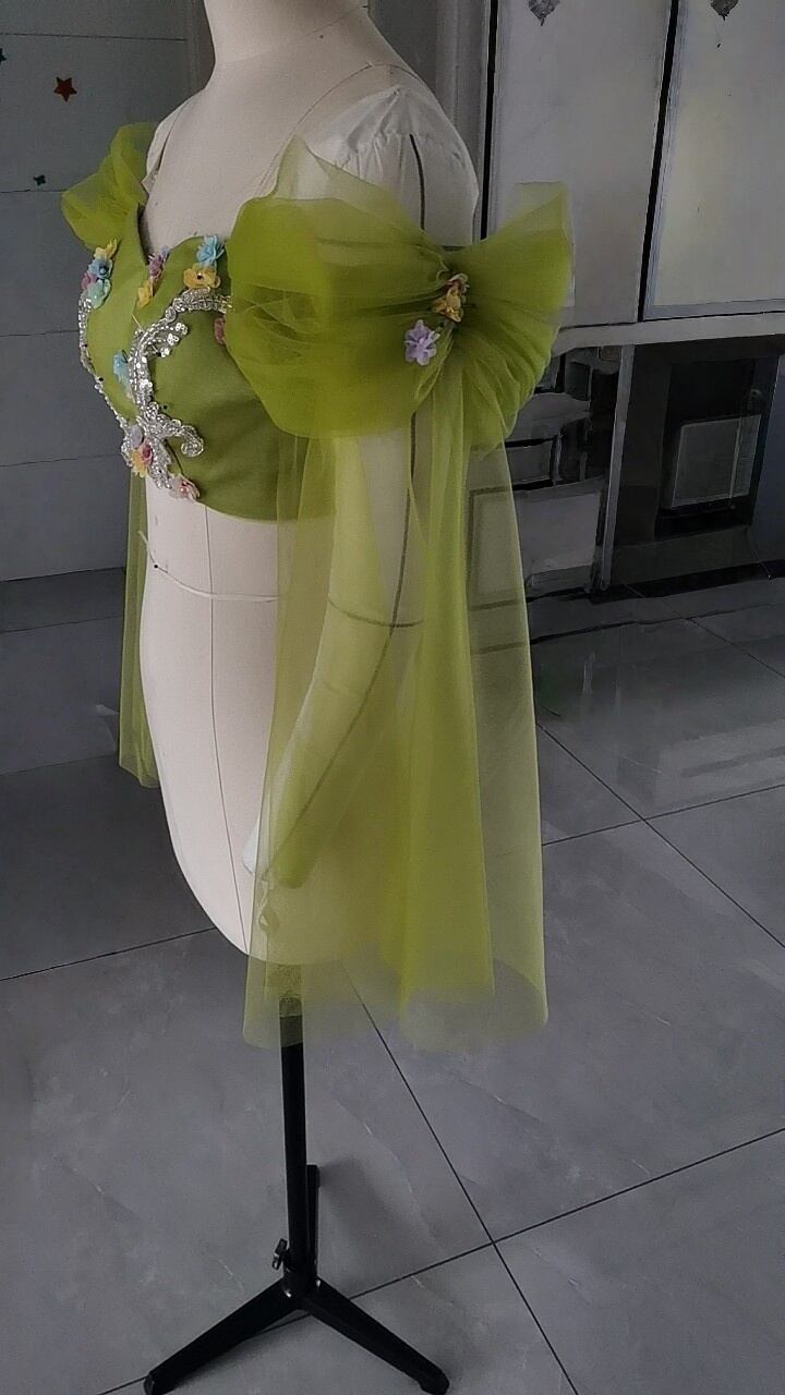 可愛い グリーン トップス ソフトチュールふんわり袖 3D立体上品花レース色直し サイズ調整可能