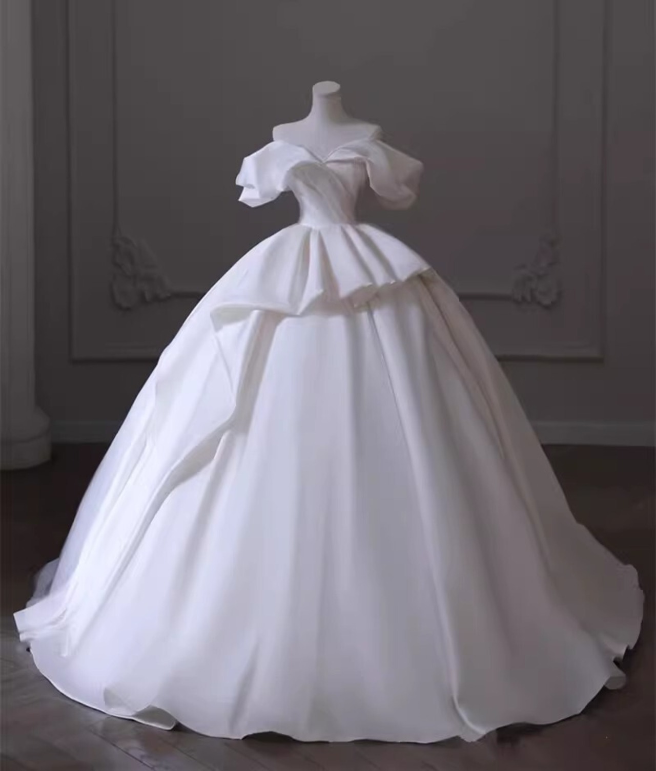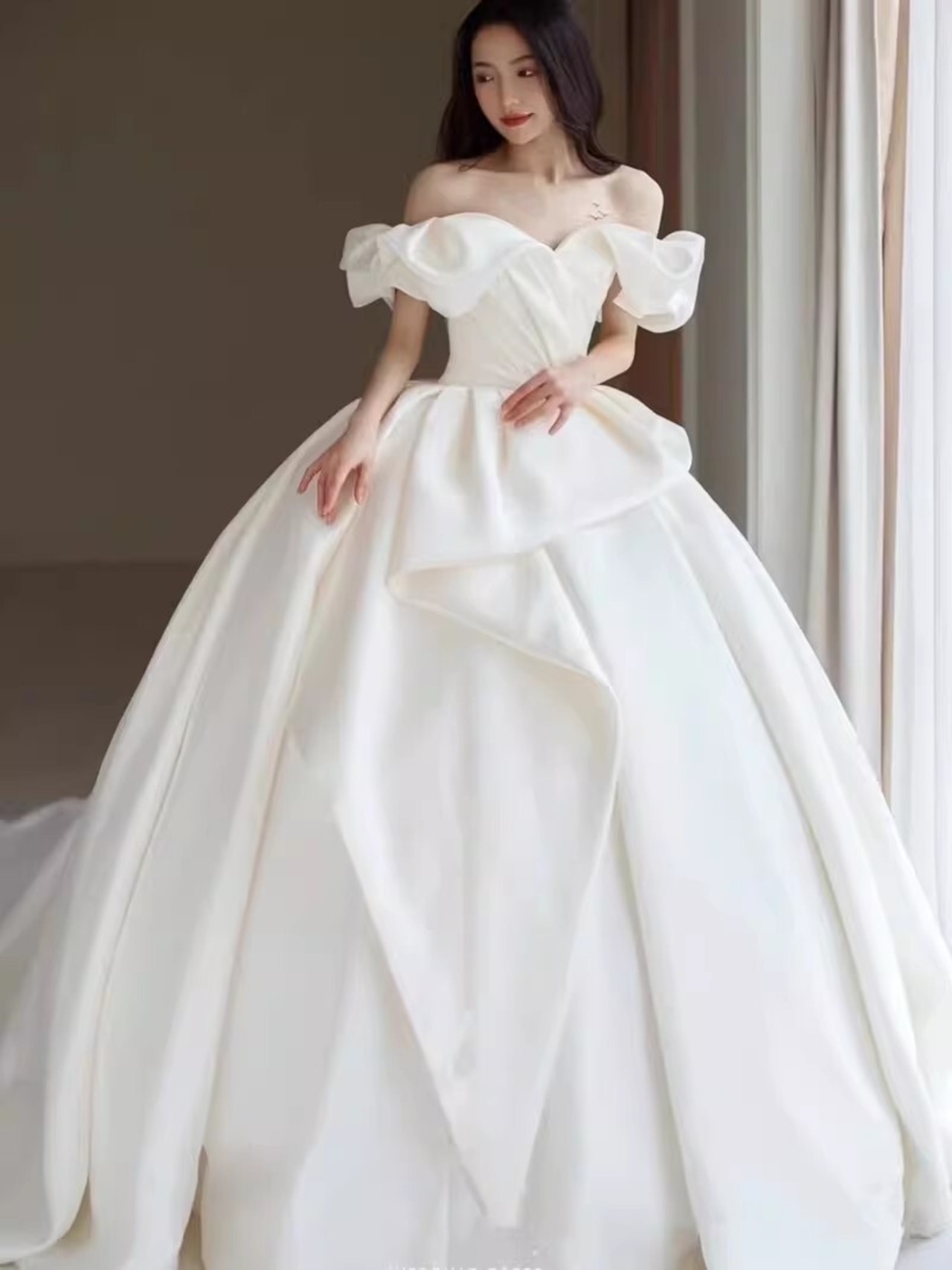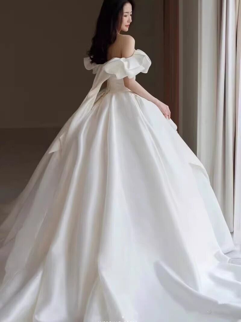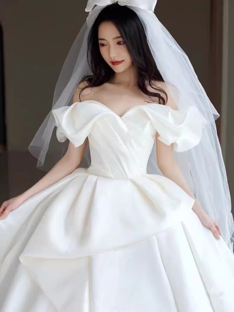 可愛い オフショルダー オフホワイト ウエディングドレスプリンセスライン 結婚式