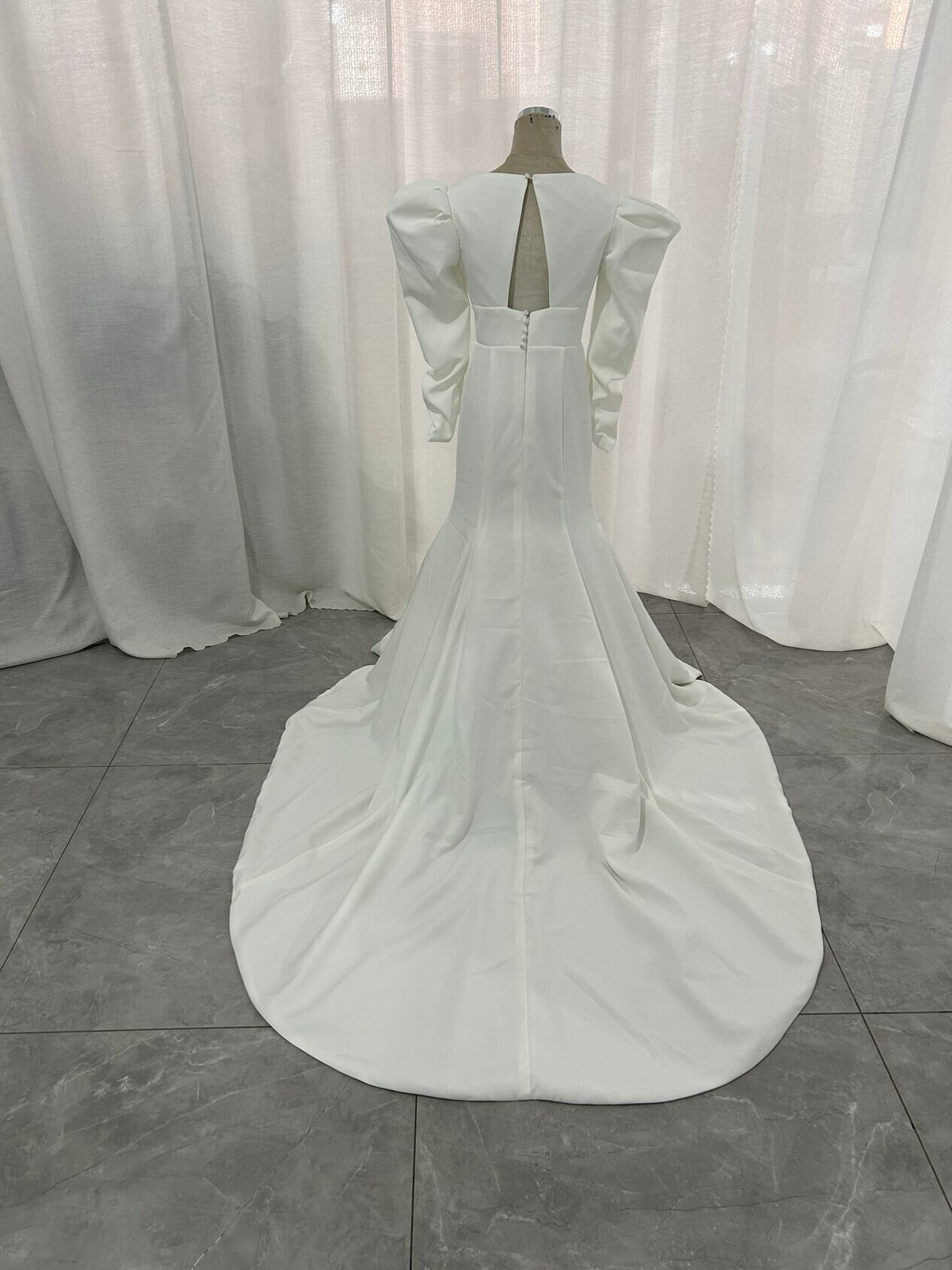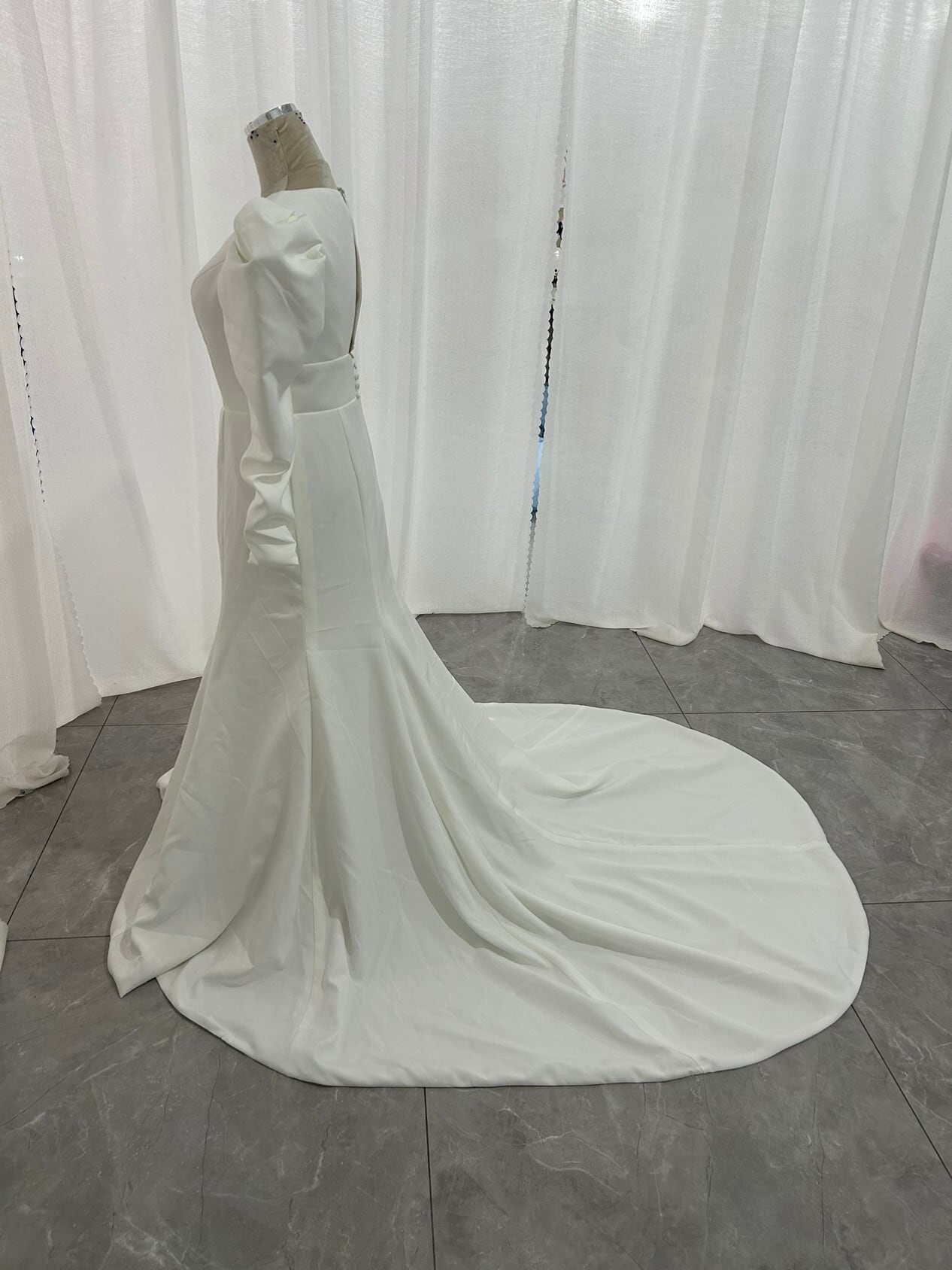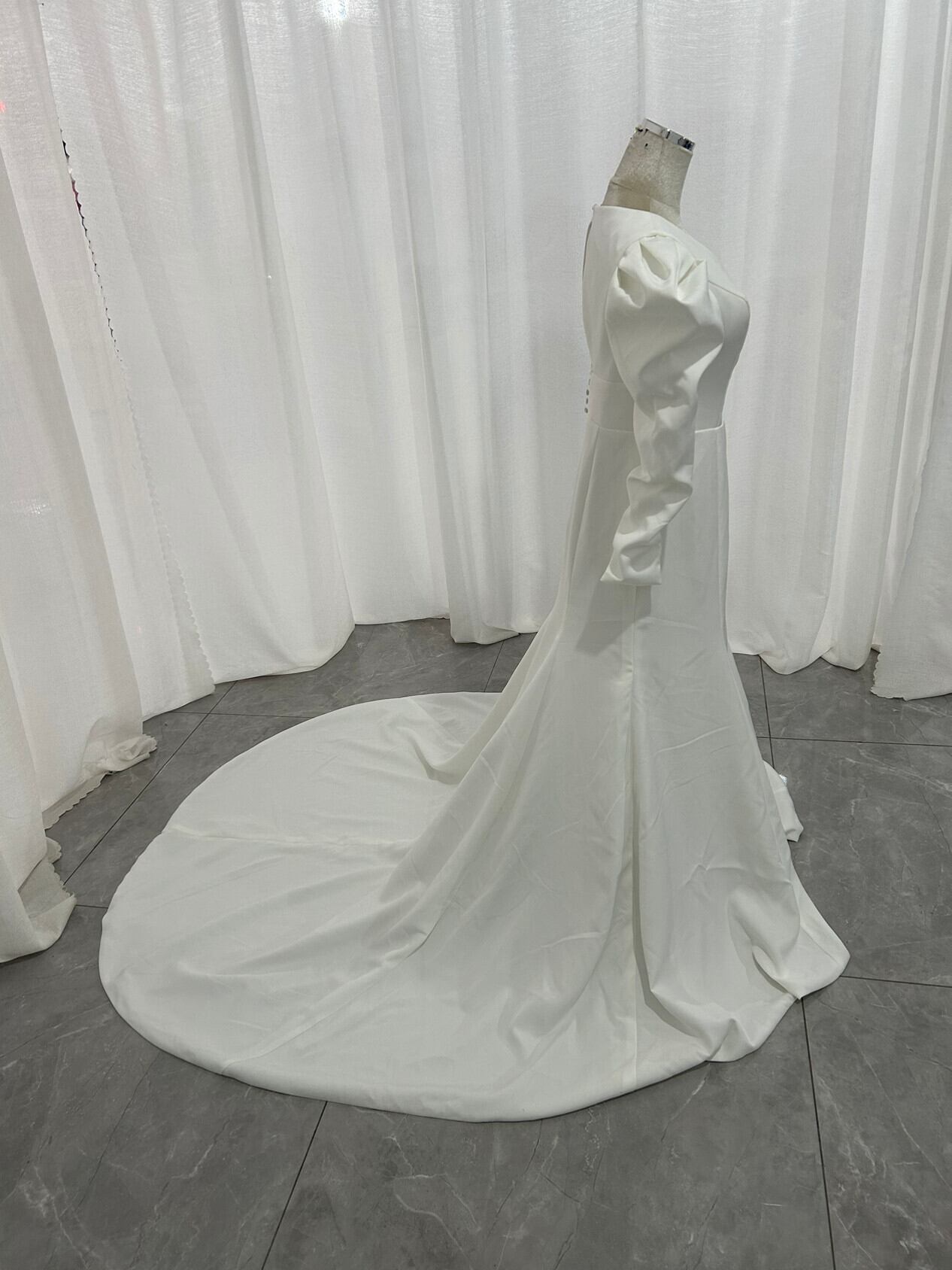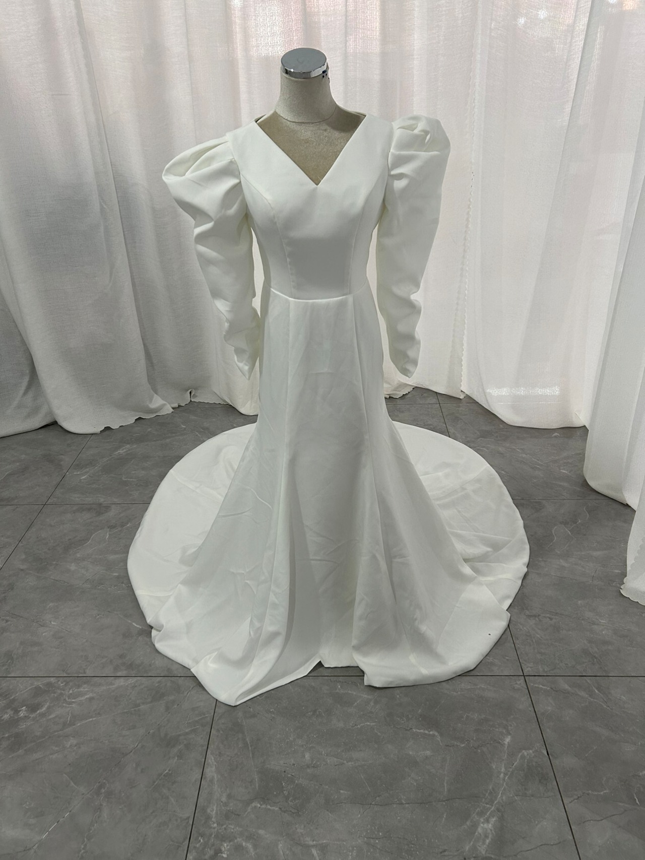 上品 エレガント オフホワイト Vネックドレス 長袖 ウェディングドレス ロングトレーン 二次会/前撮り 大人気上昇